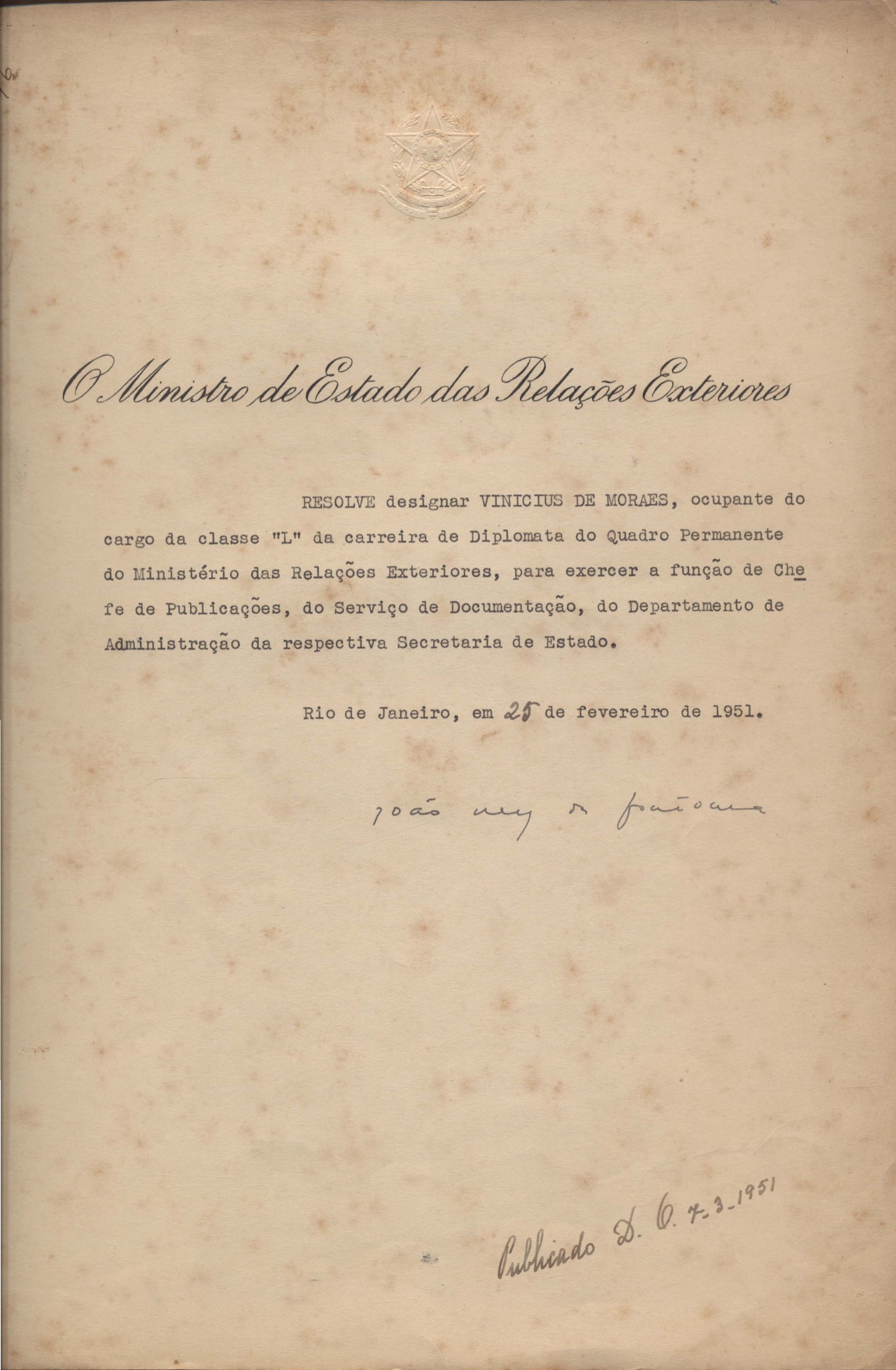 VM é transferido do cargo de classe "L" da carreira diplomática, do quadro permanente do Ministério das Relações Exteriores, para exercer a função de chefe de publicações, do Serviço de Documentação do Departamento de Administração da Secretaria do Estado do Rio de Janeiro.