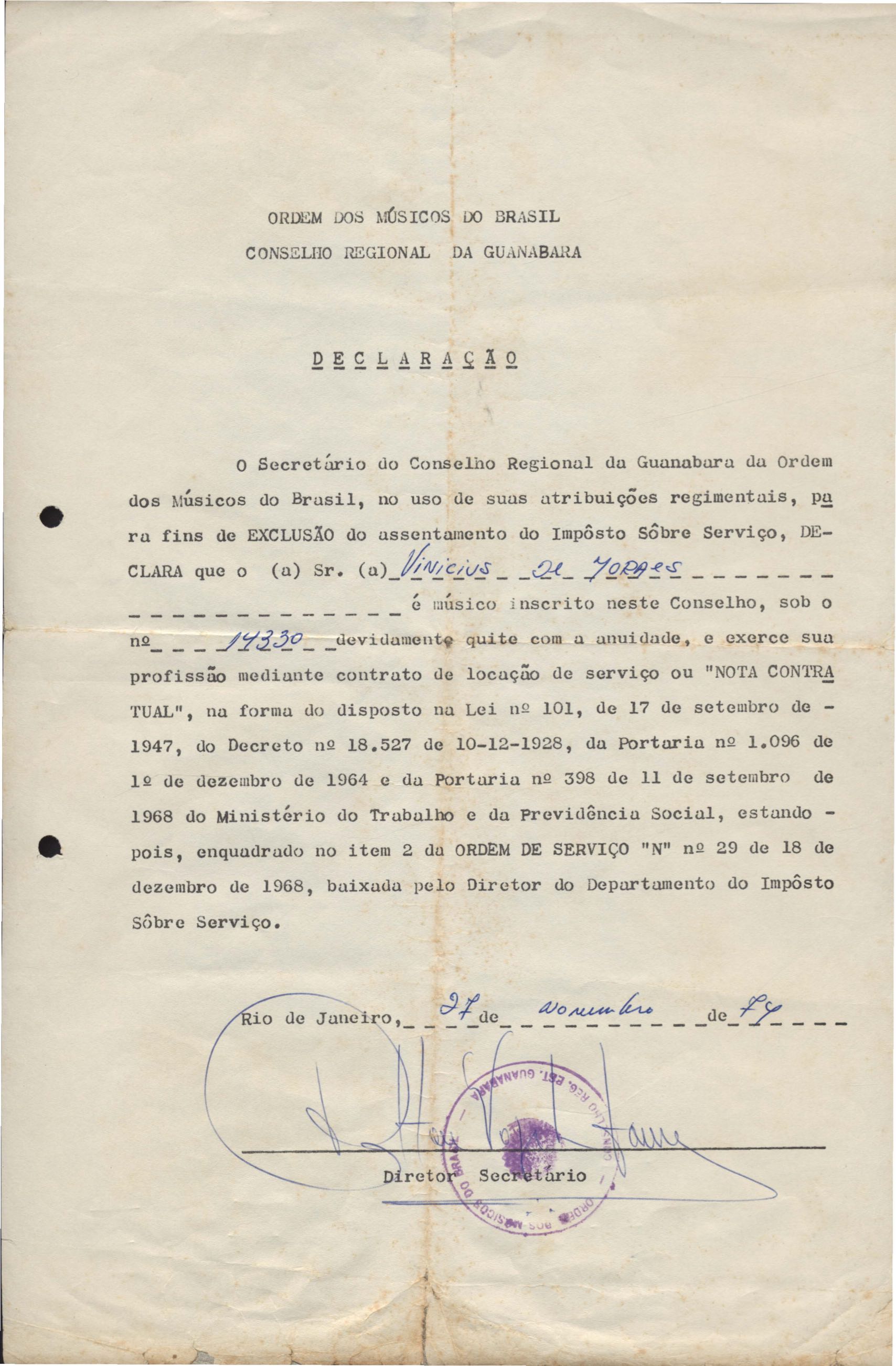 Declaração da Ordem dos Músicos do Brasil, para fins de exclusão do assentamento do Imposto sobre serviço, para VM.