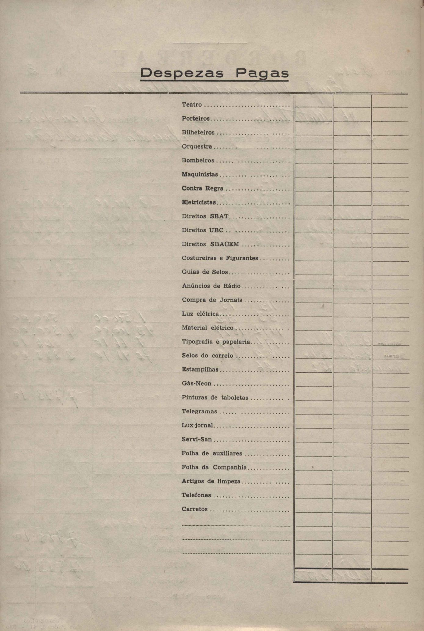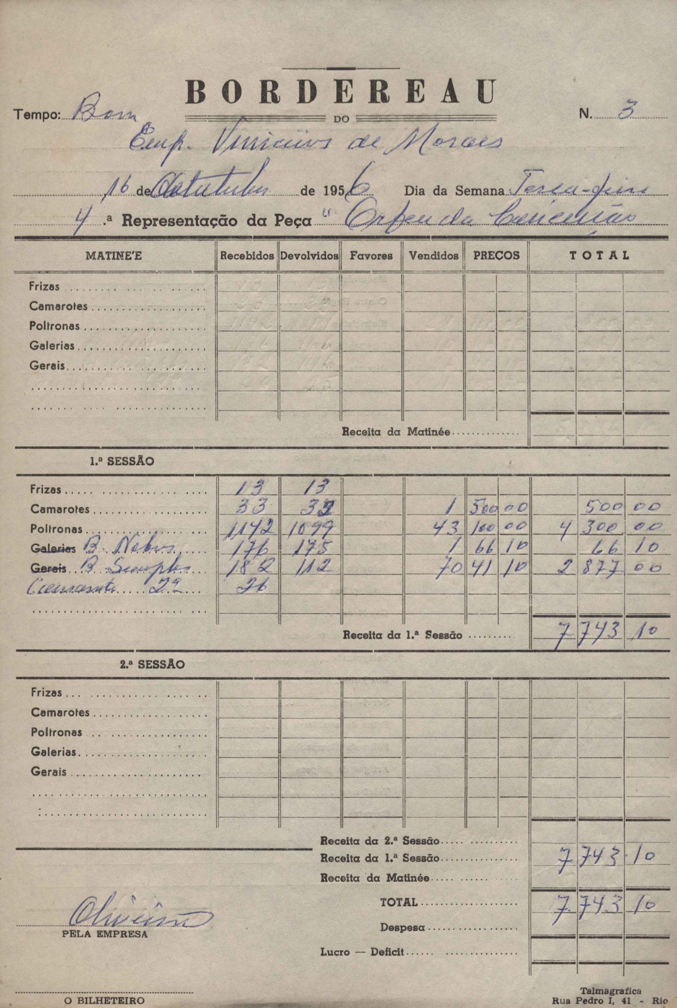 Borderô da representação da peça Orfeu da Conceição, de VM.