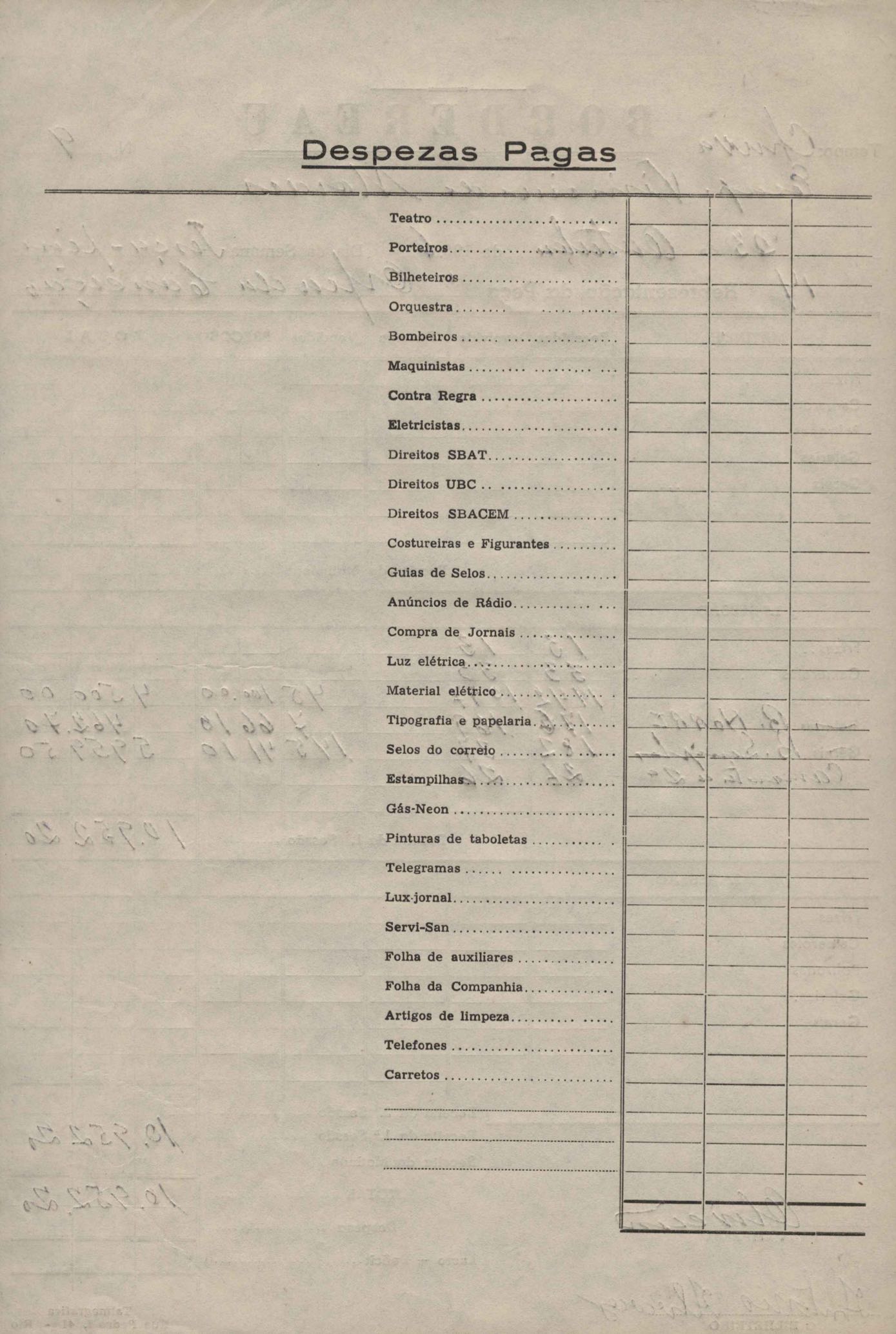 Borderô da representação da peça Orfeu da Conceição, de VM.