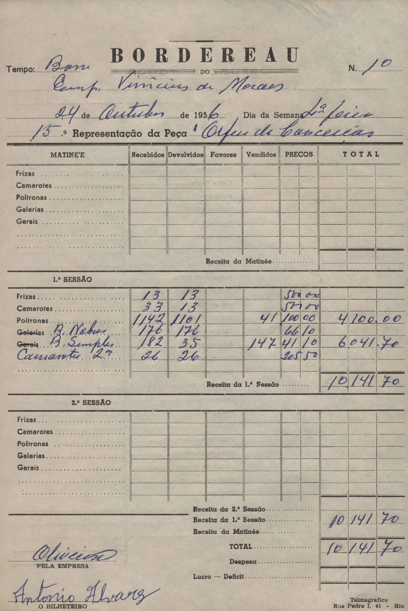 Borderô da representação da peça Orfeu da Conceição, de VM.