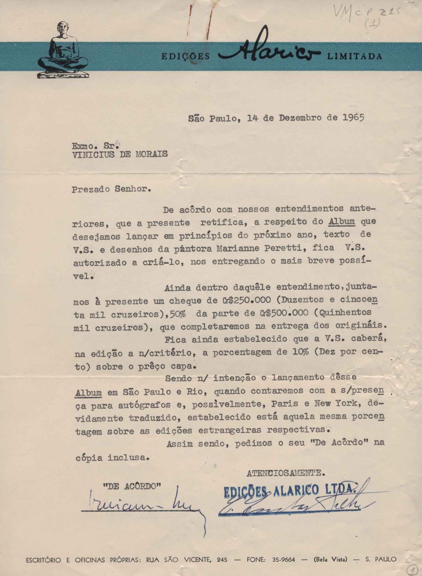 Acordo comercial sobre álbum de poemas de VM com ilustrações de Marianne Peretti.