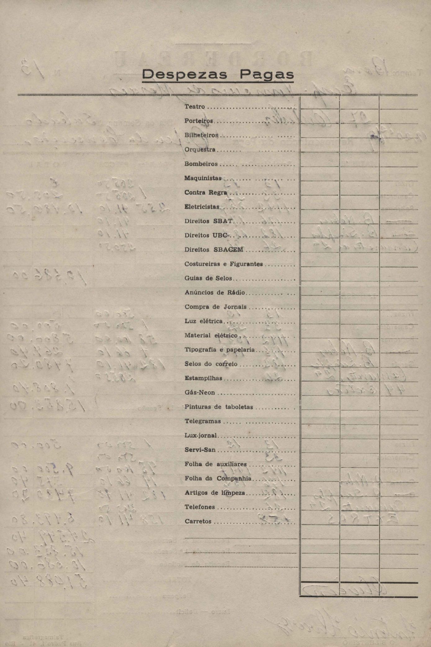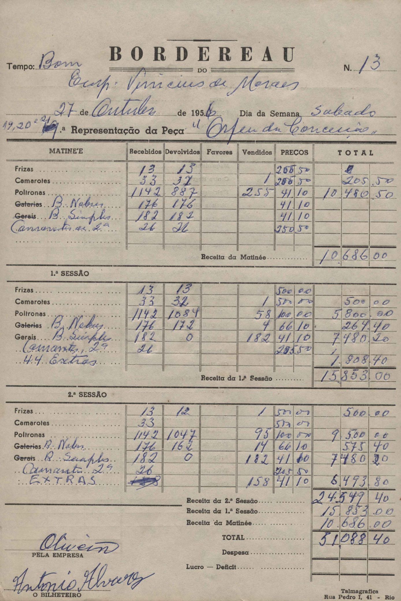 Borderô da representação da peça Orfeu da Conceição, de VM.
