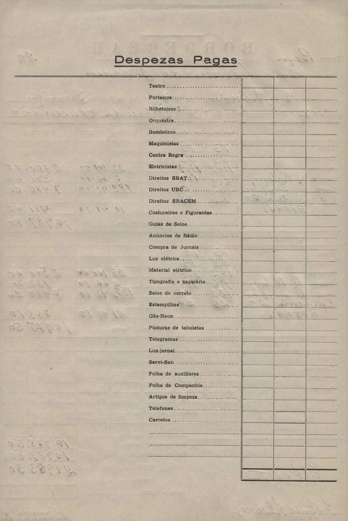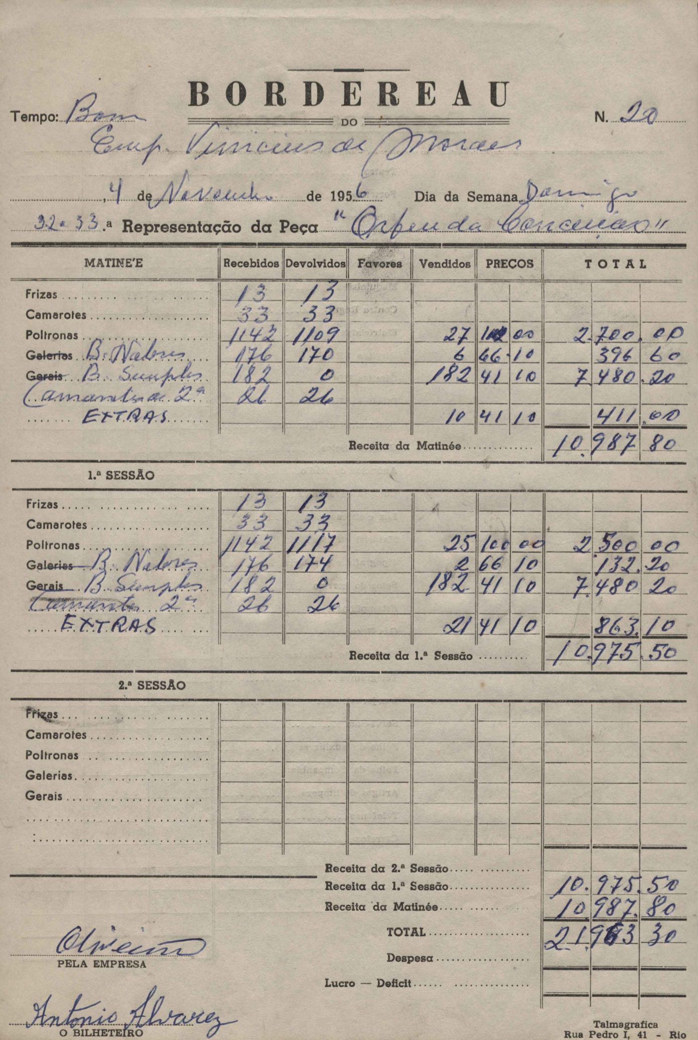 Borderô da representação da peça Orfeu da Conceição, de VM.