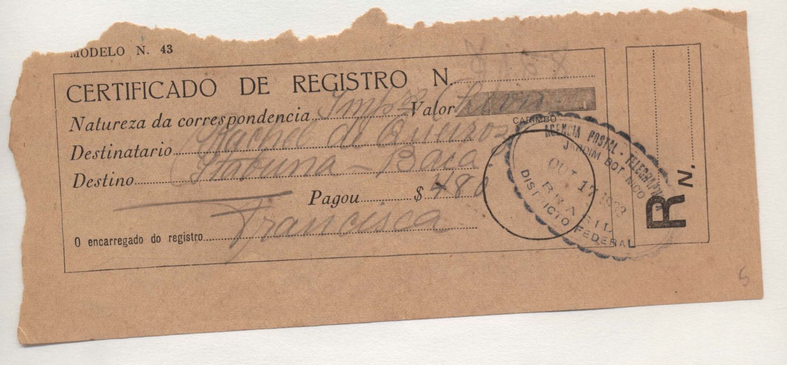Certificados de registros de telegramas enviados por VM para Carlos Drummond de Andrade, Emílio Moura, Guilherme de Almeida, Pinto de Aguiar, Plínio Barreto e Raquel de Queirós.