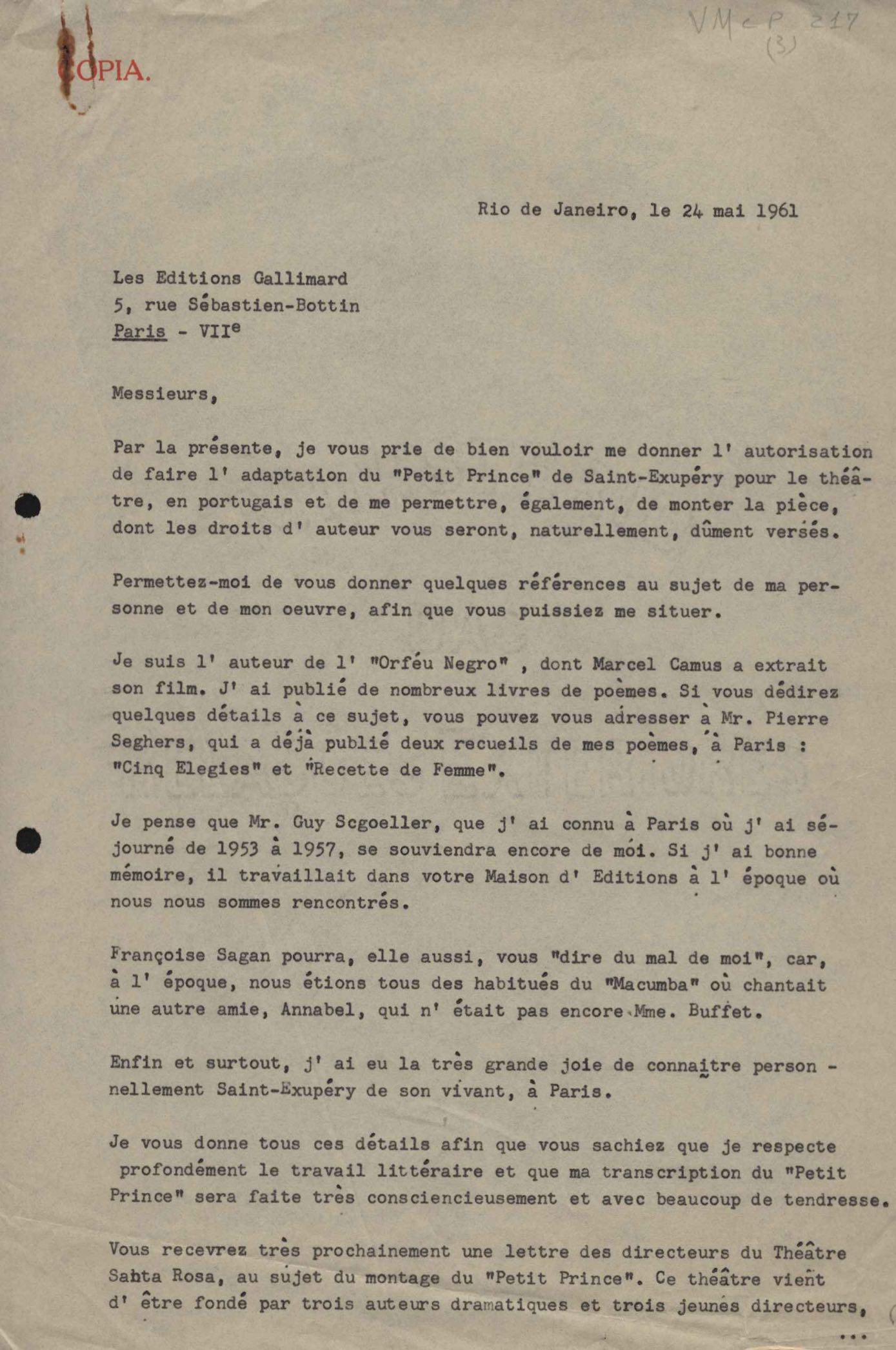 Carta à Éditions Gallimard