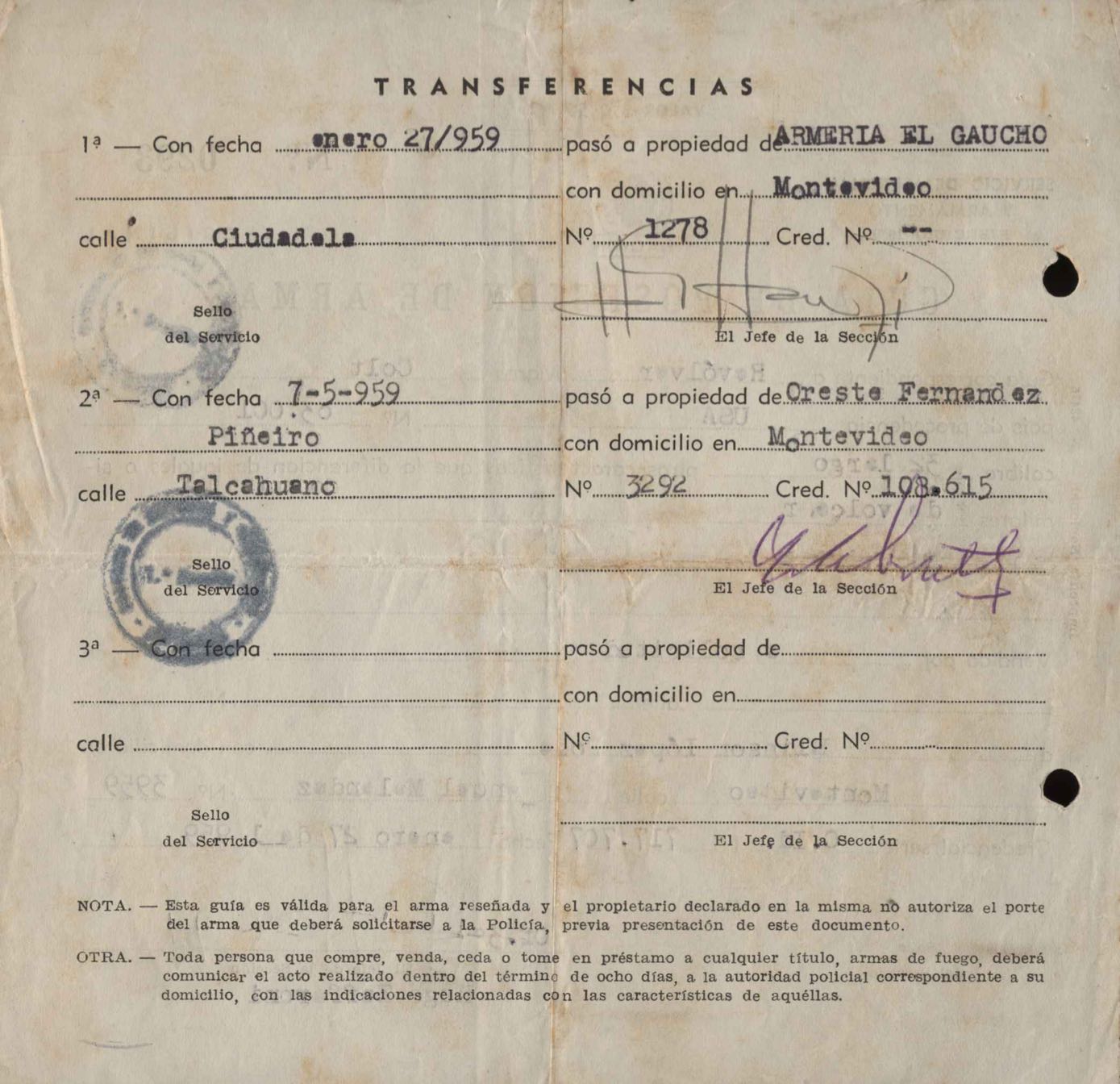 Registro de porte de arma feito pelo Servicio de Material y Armamento de Montevidéu.