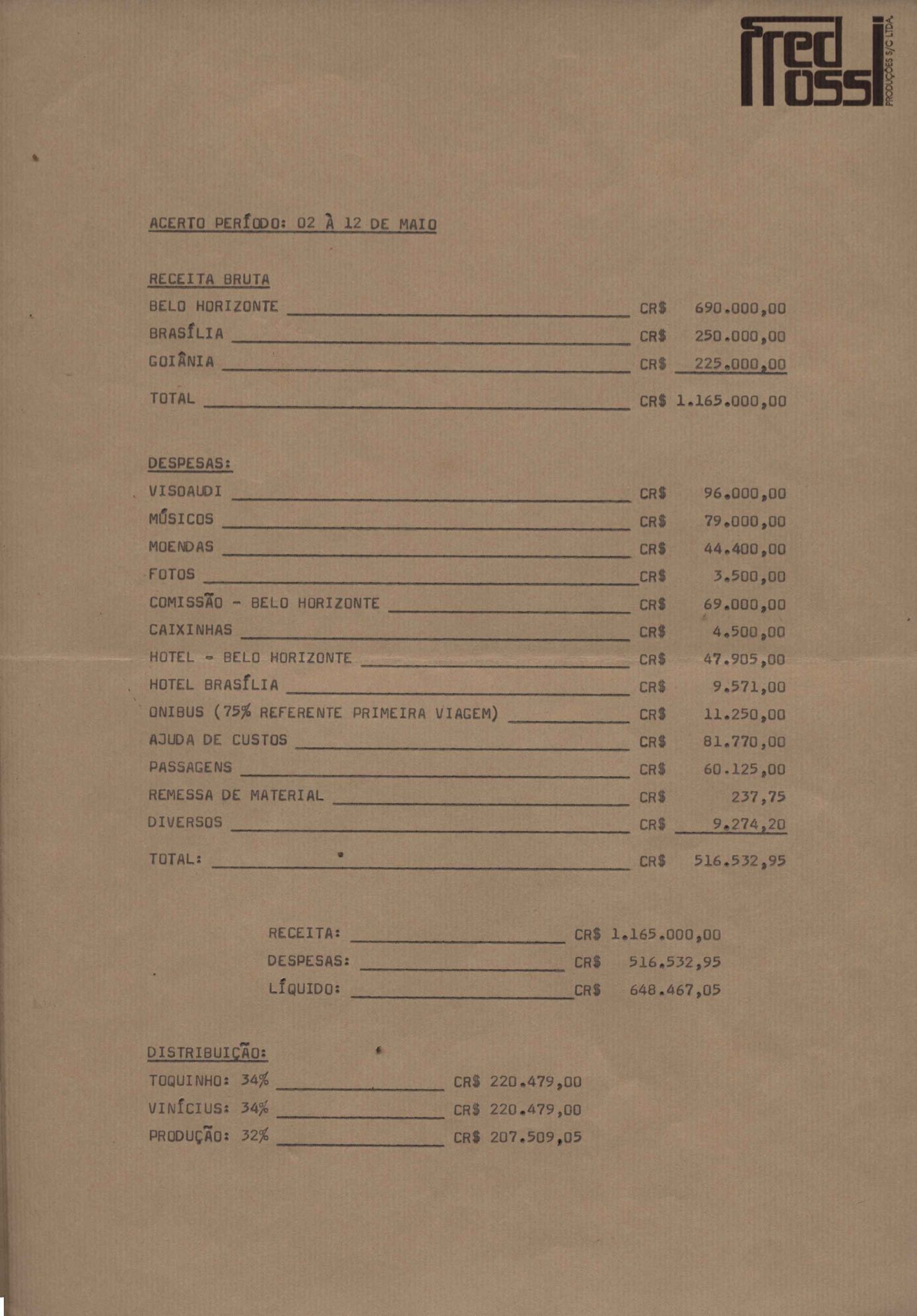 Relatório referente às despesas de shows, programas e reembolso de passagens de VM e de sua equipe.