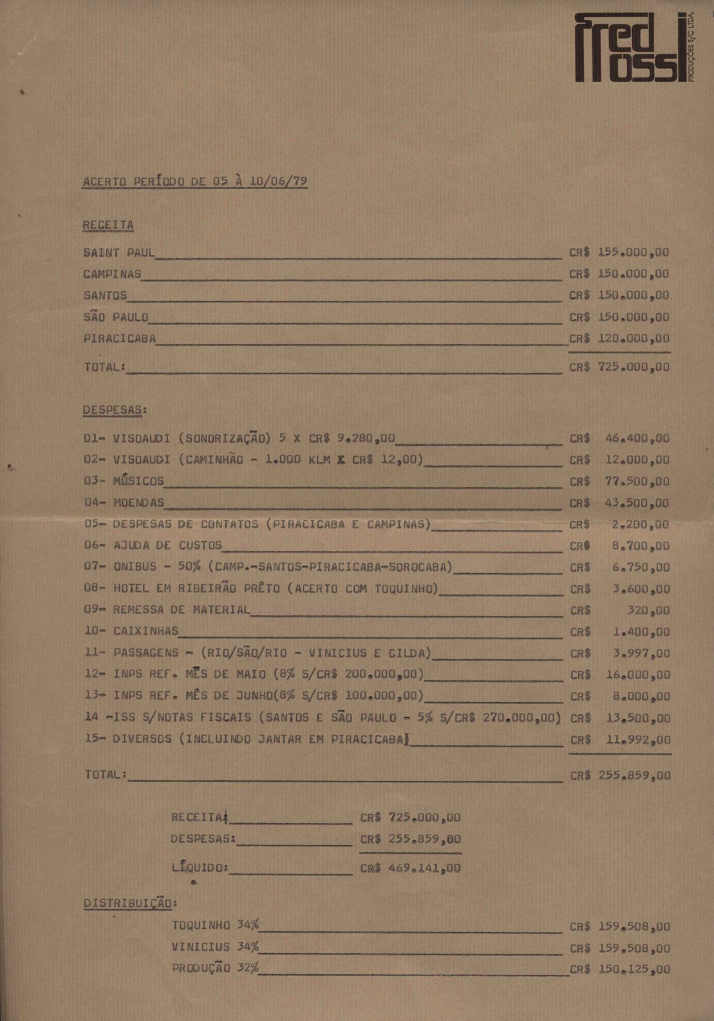 Relatório referente às despesas de shows, programas e reembolso de passagens de VM e de sua equipe.
