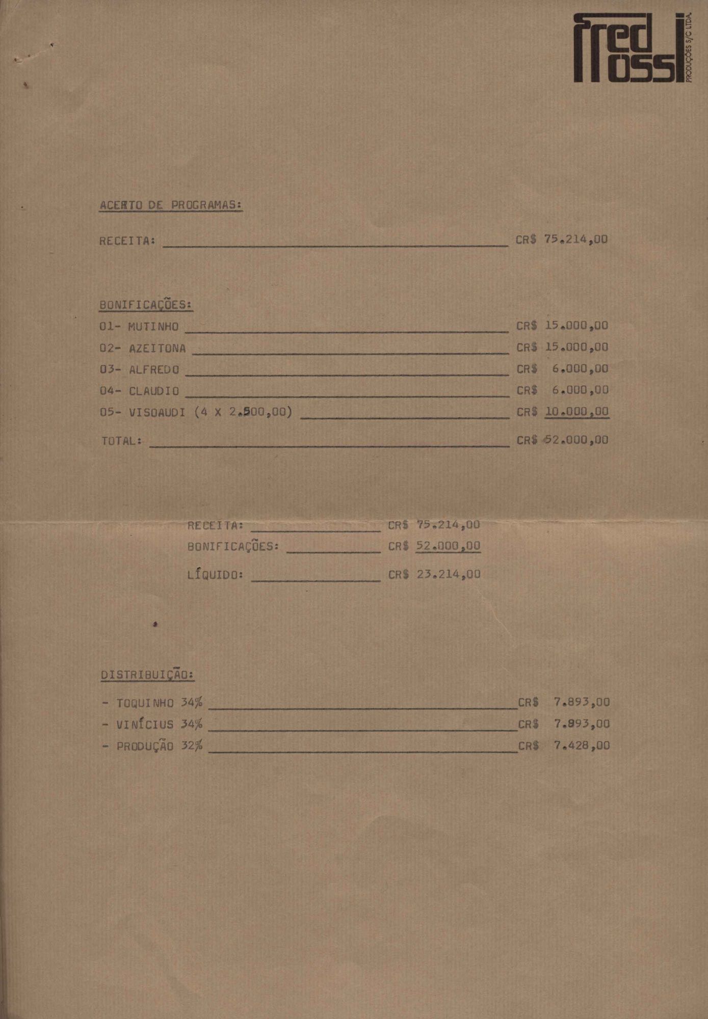 Relatório referente às despesas de shows, programas e reembolso de passagens de VM e de sua equipe.