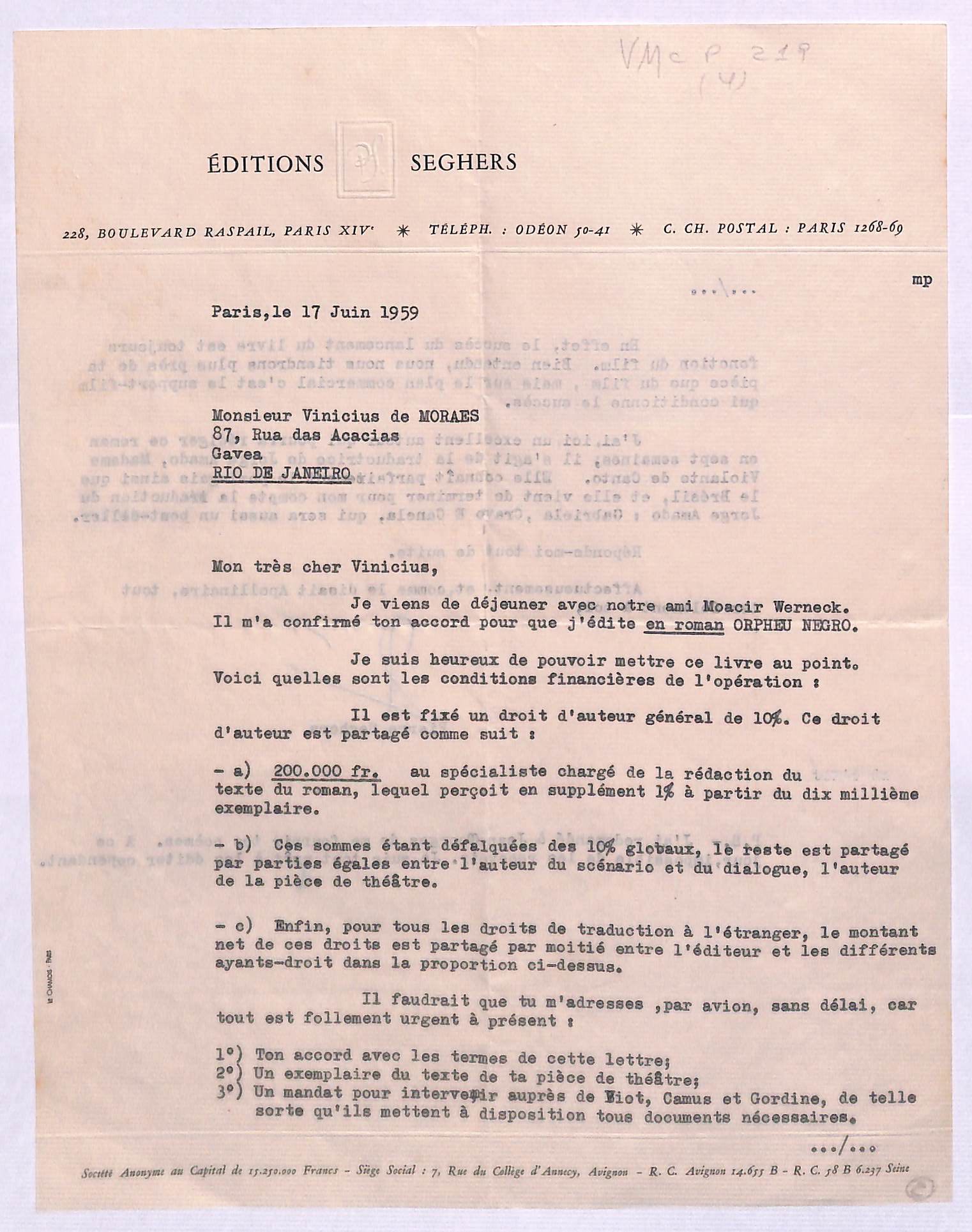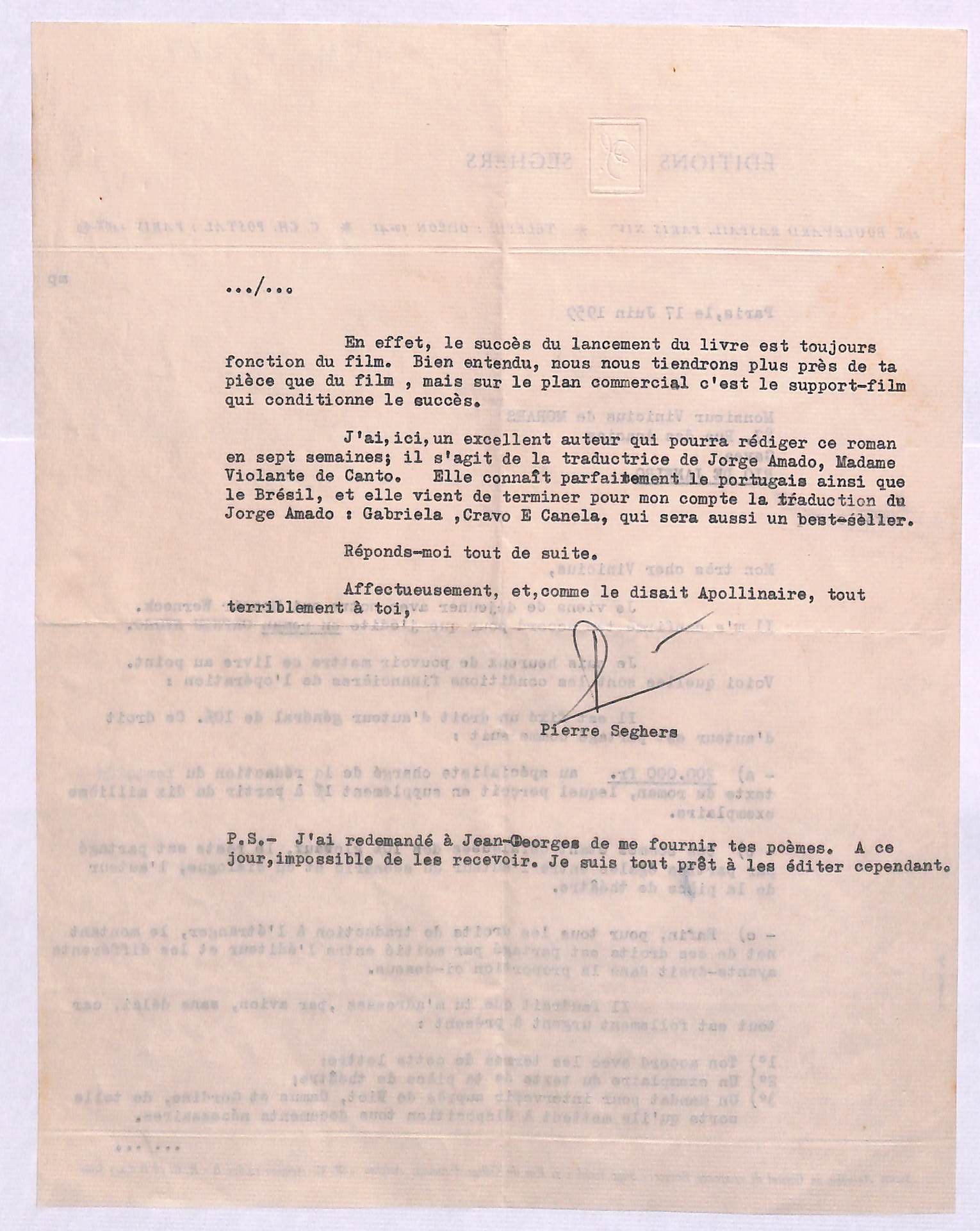 Comentários sobre edição de poetas brasileiros na coleção Autour du monde, sobre direitos autorais e sobre a tradução e edição de Orfeu negro.