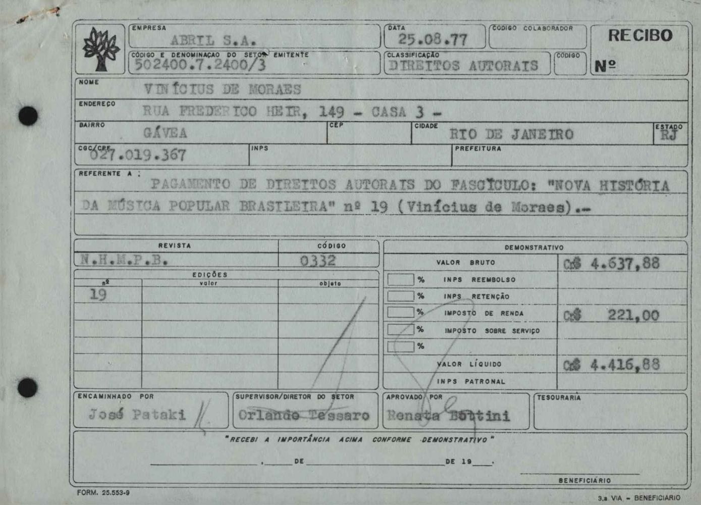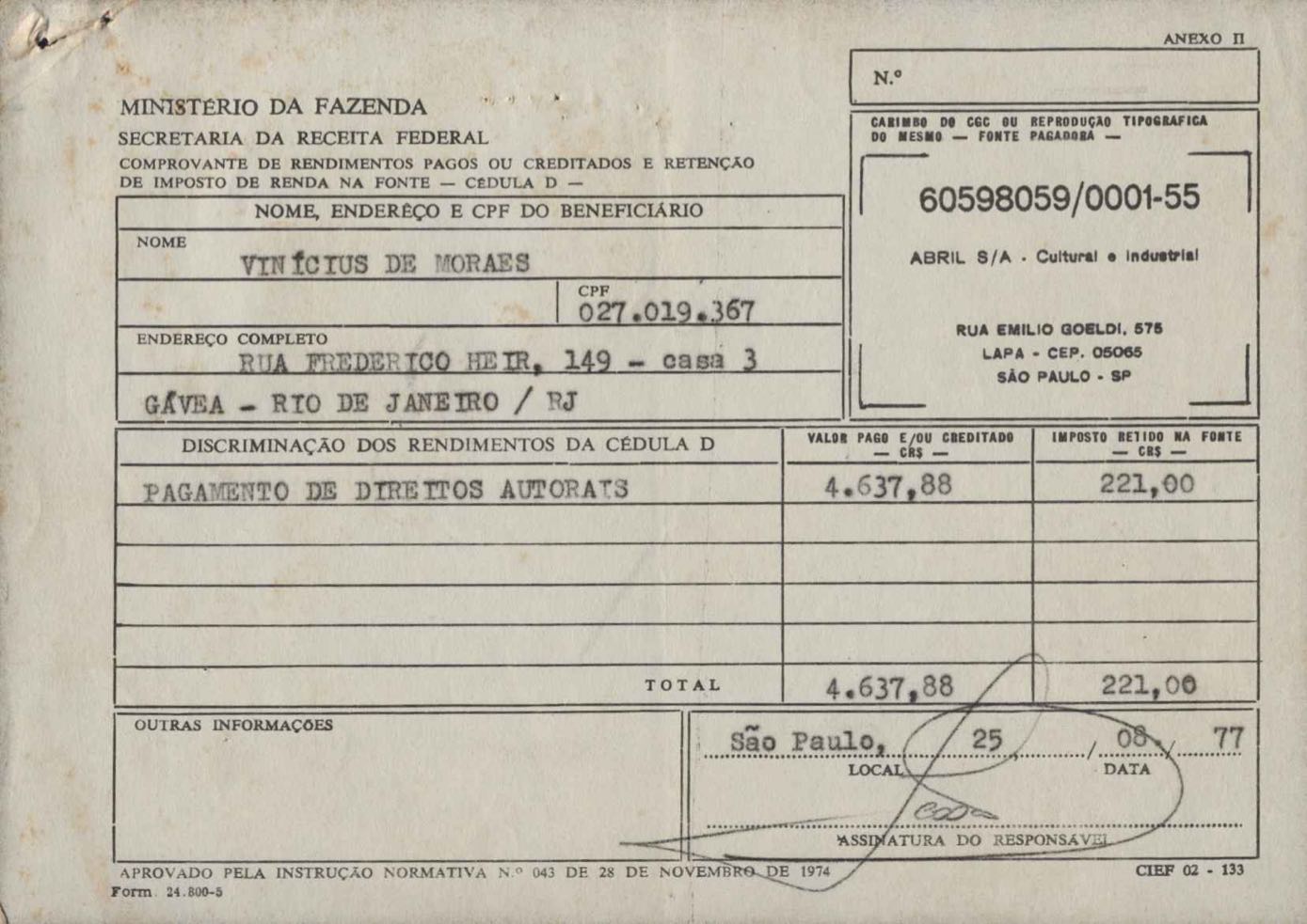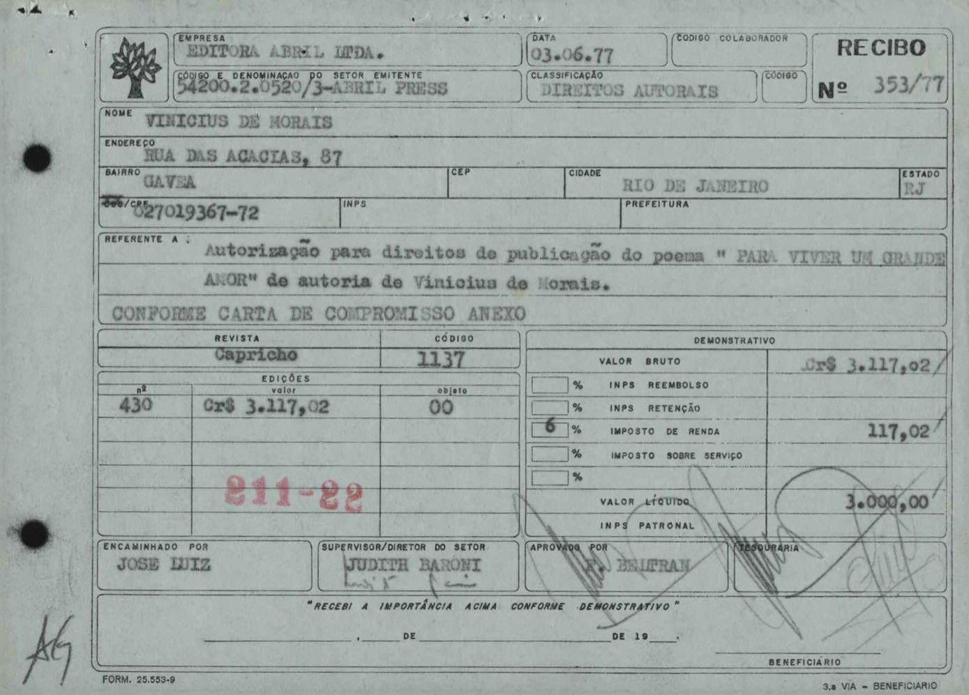Pedido de autorização para publicar o poema "Para viver um grande amor" e "O mais que perfeito". Remessa de proposta de contrato para edição de trechos da obra de VM em volume dirigido a alunos de 2º grau e vestibulandos. Anexo: Bilhetes (2) da Editora Abril a Lygia de Moraes, procuradora de VM.