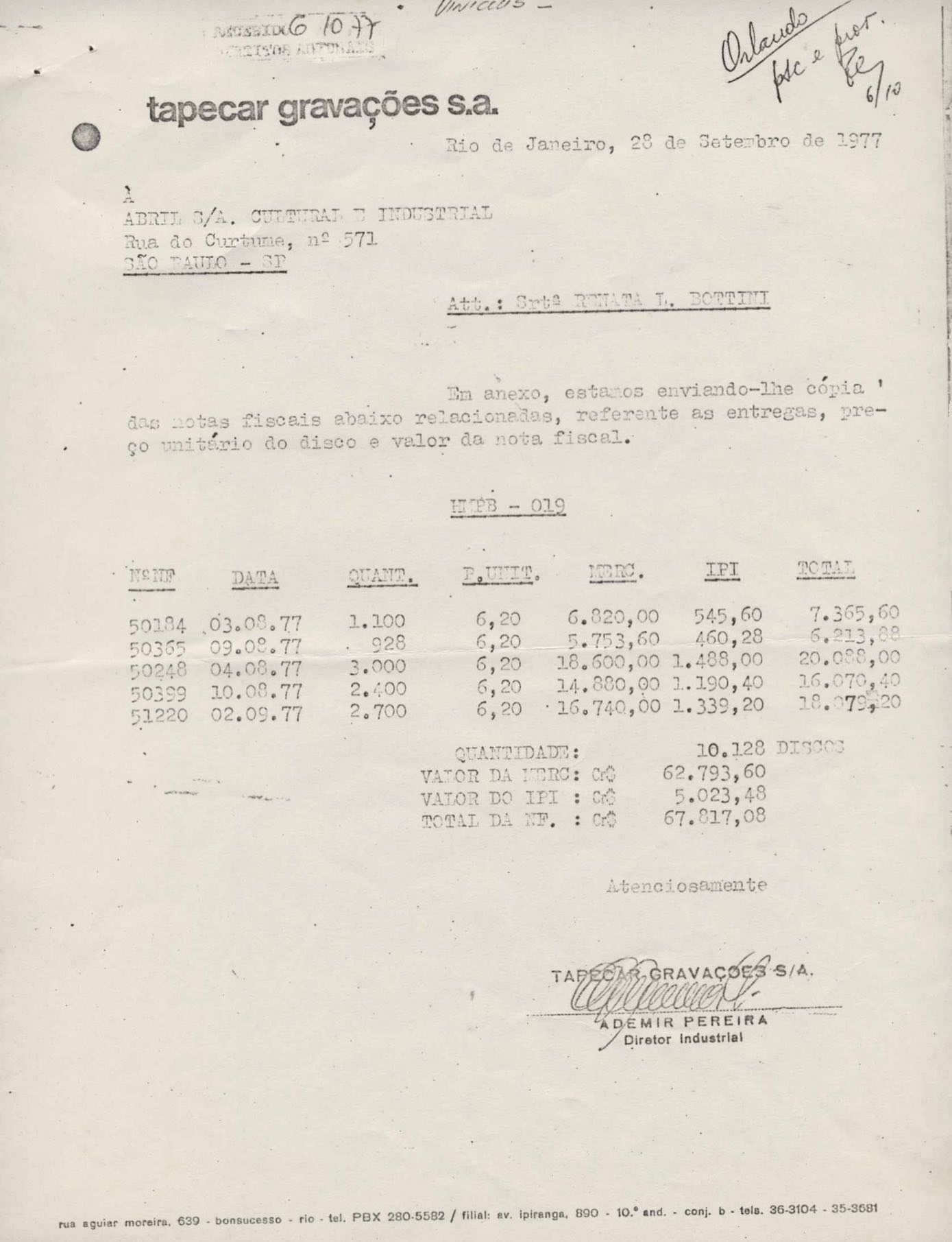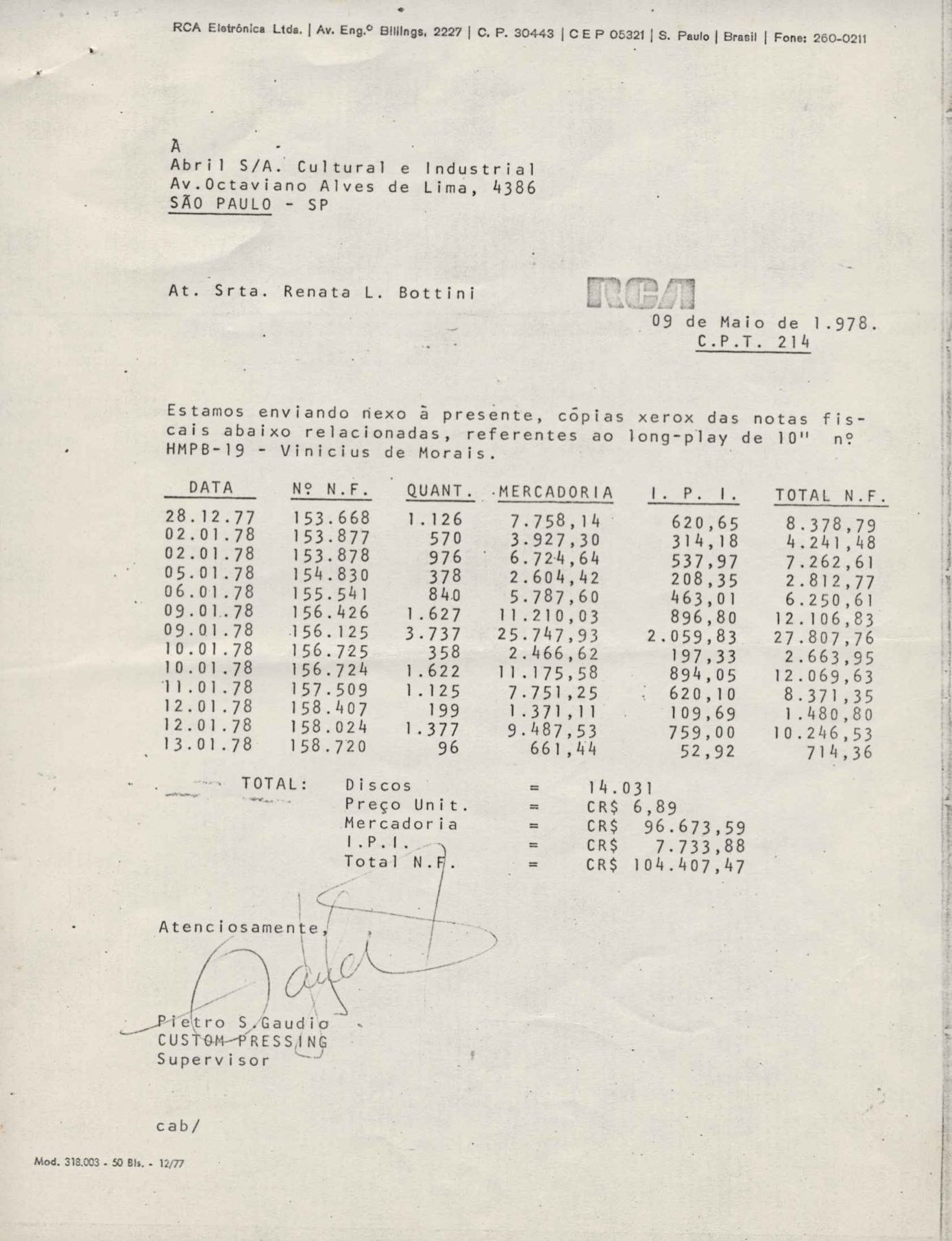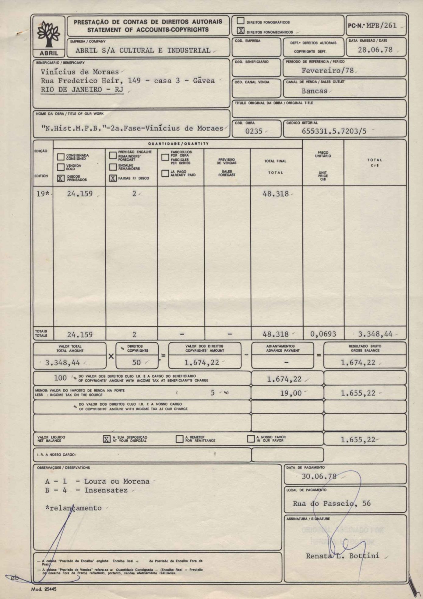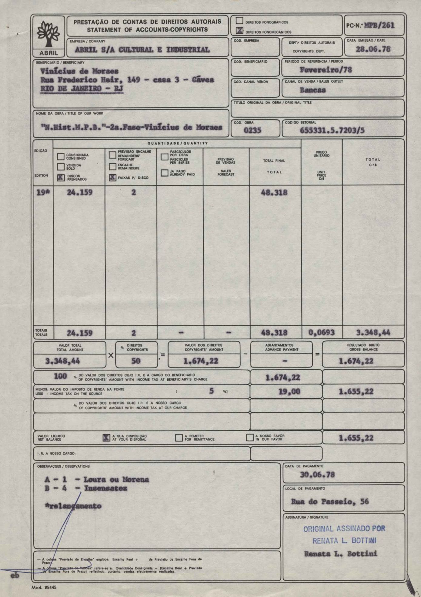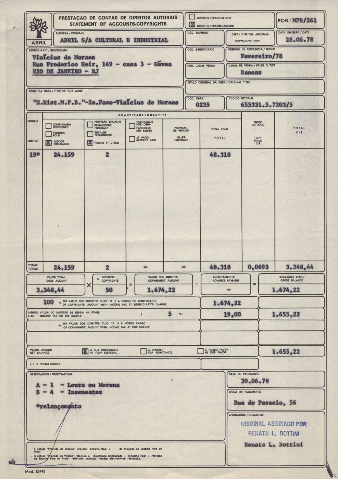 Pedido de autorização para publicar o poema "Para viver um grande amor" e "O mais que perfeito". Remessa de proposta de contrato para edição de trechos da obra de VM em volume dirigido a alunos de 2º grau e vestibulandos. Anexo: Bilhetes (2) da Editora Abril a Lygia de Moraes, procuradora de VM.
