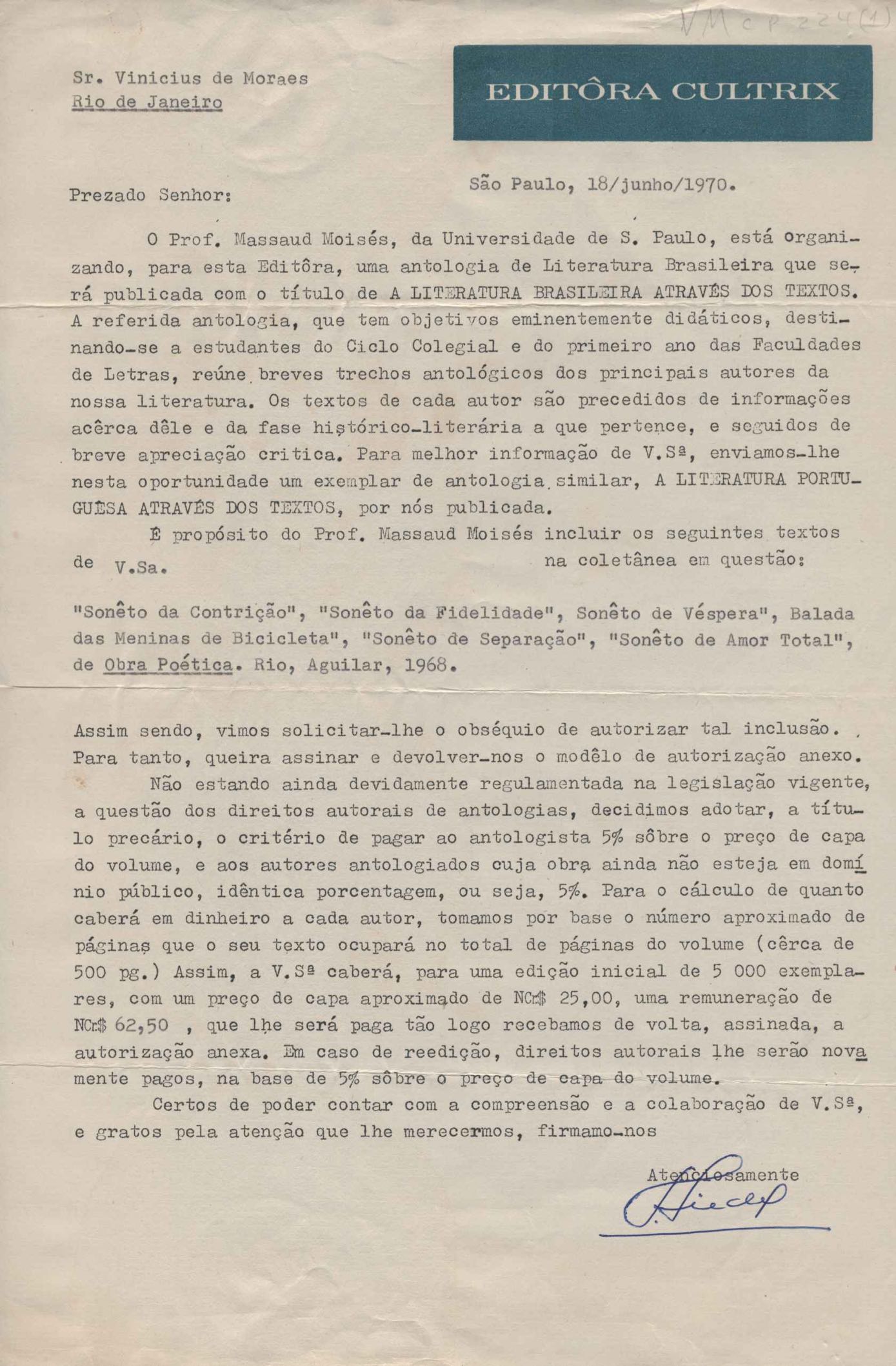Pedido de autorização para incluir poemas de VM no livro A literatura brasileira através dos textos, organizado por Massaud Moisés.