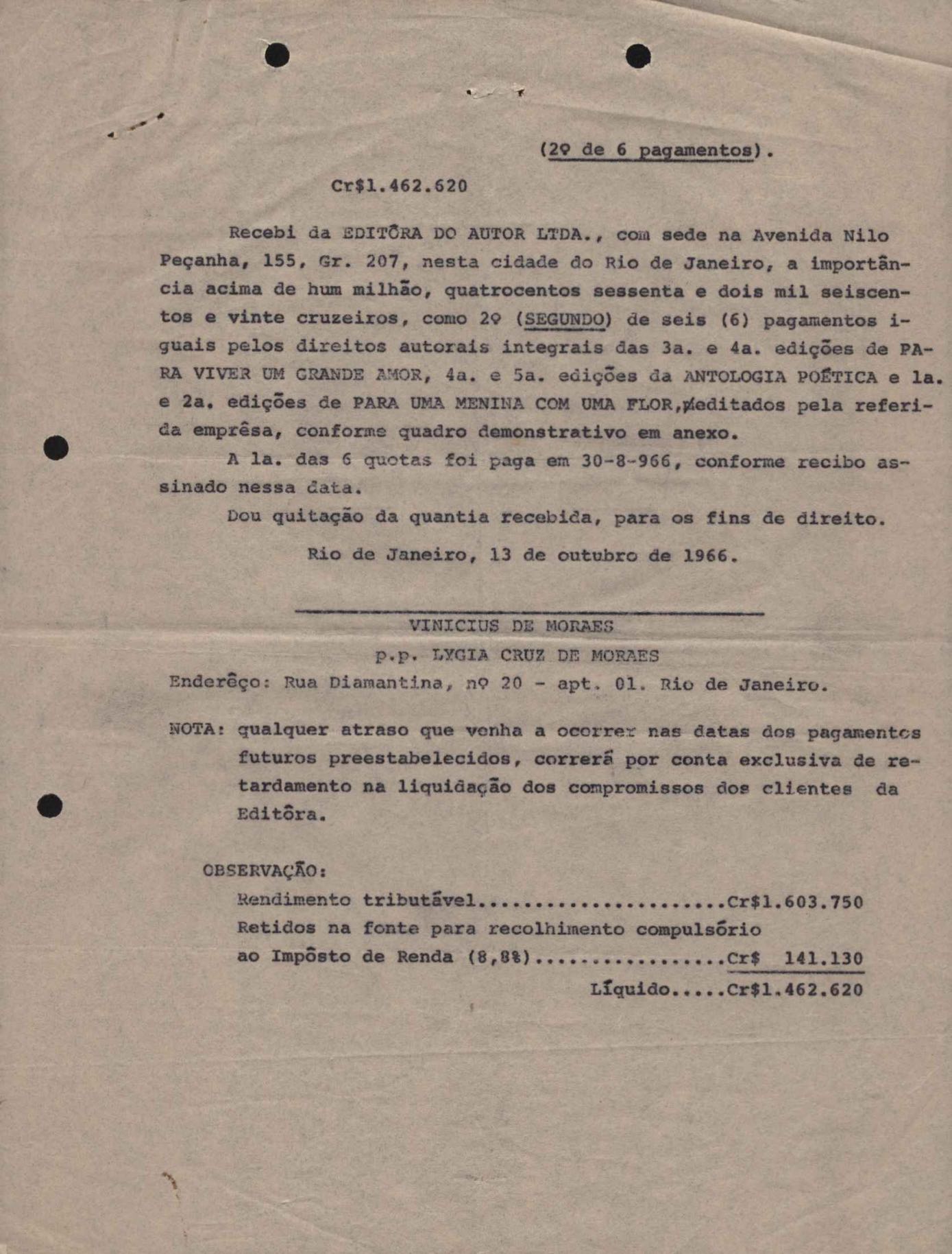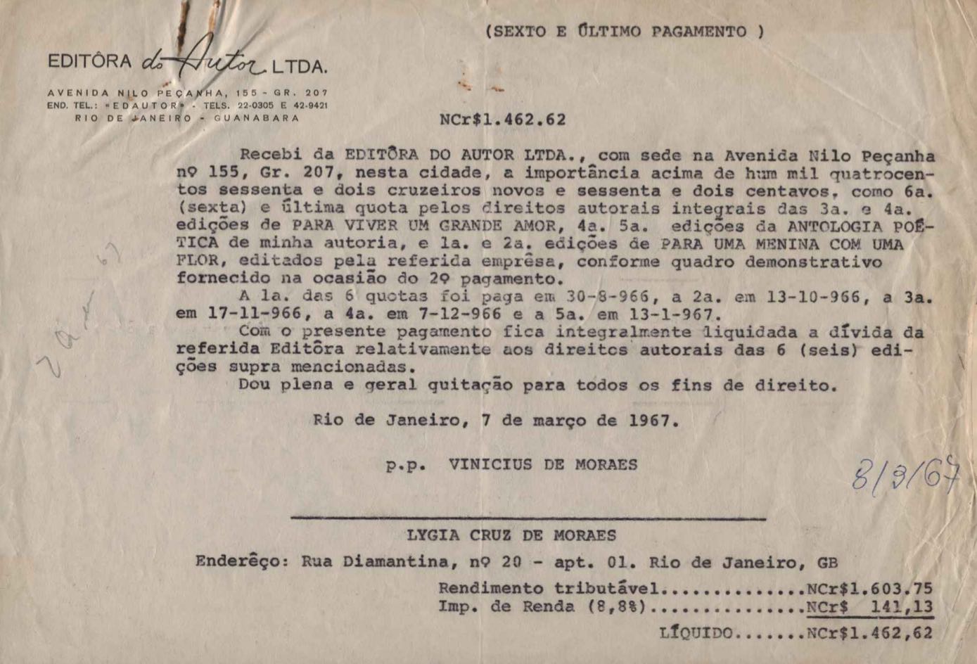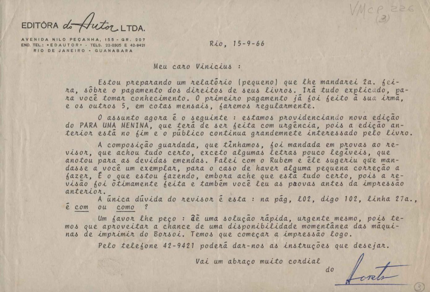Prestação de contas de direitos autorais. Informa que está providenciando revisão de Para uma menina com uma flor, para nova edição.