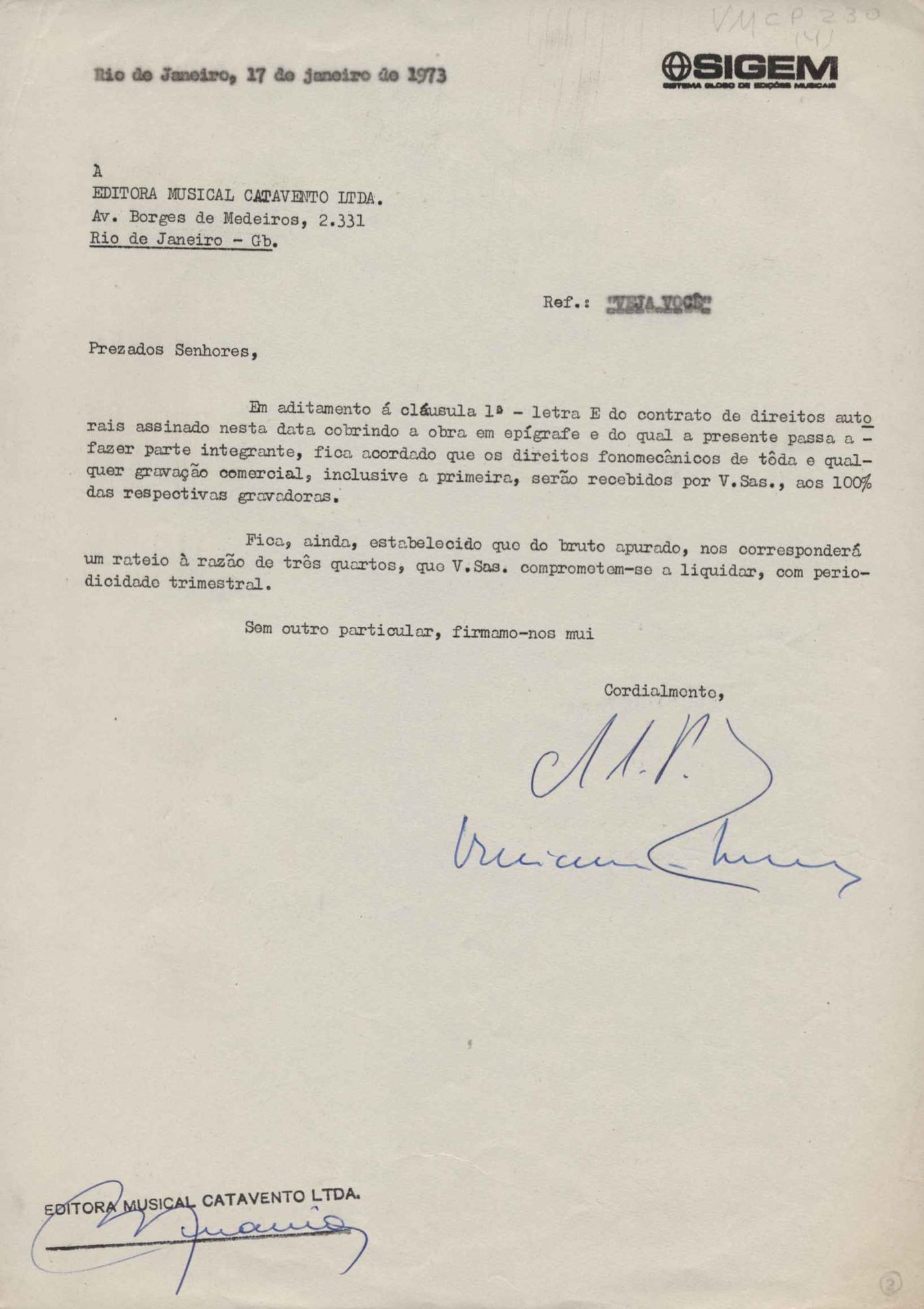 Carta de VM à Editora Musical Catavento