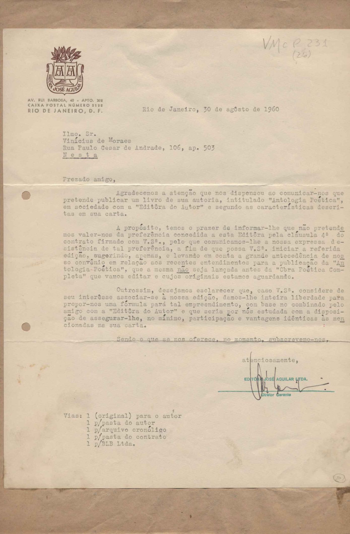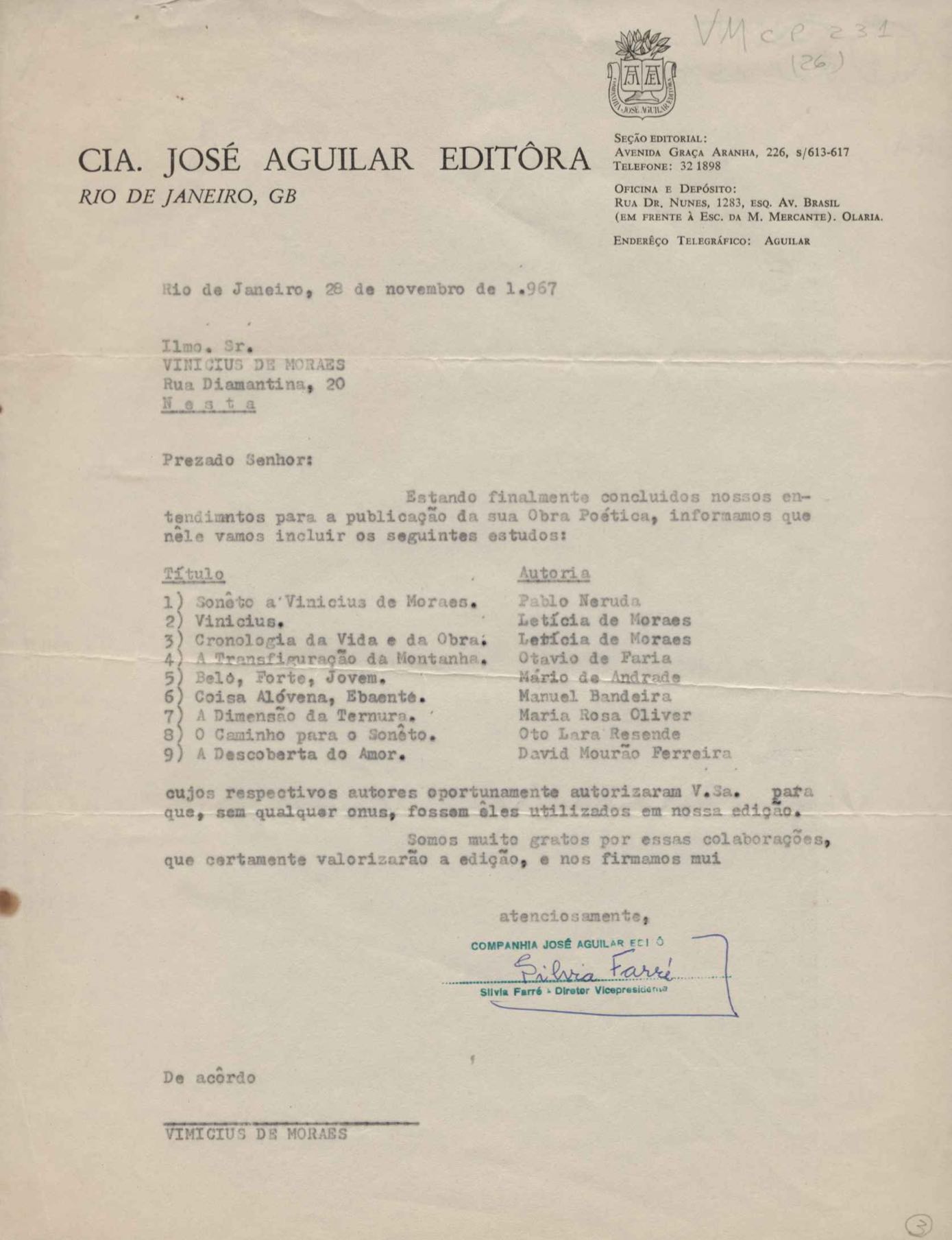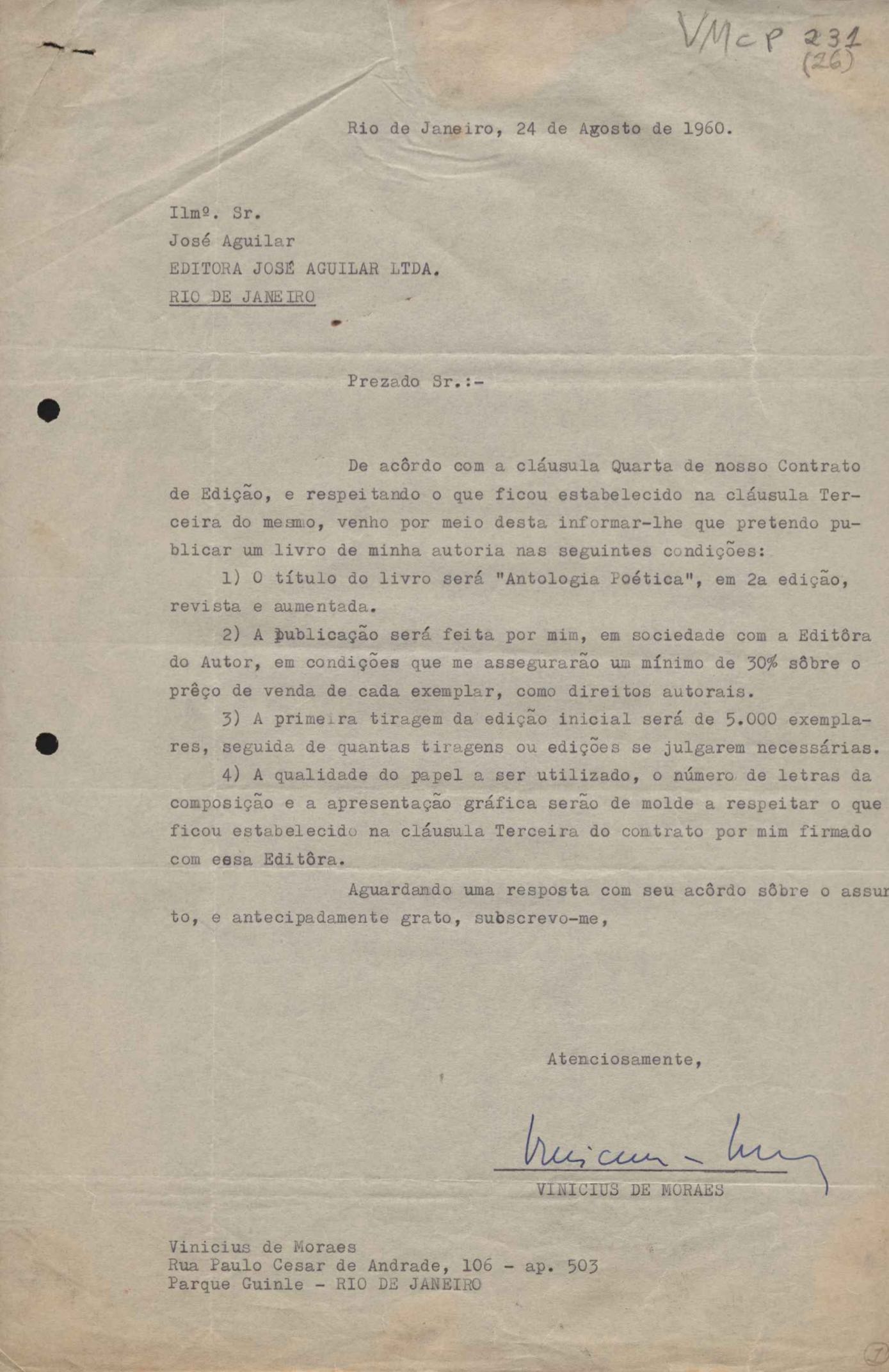 Comentários sobre a edição da obra poética de VM. Pedido de autorização para Alfred A. Knopf Inc. e Random House reproduzirem poemas de VM. Encaminhamento de relatório de vendas de Poesia completa e prosa. Considerações sobre publicação da Antologia poética em sociedade com a Editora do Autor. Anexos: 1. Prestações de contas (2) de direitos autorais; 2. Cartas (2) da Alfred Knopf Inc. à Aguilar; 3. Carta da Aguilar à Random House; 4. Cartas (2) da Aguilar a Lygia de Moraes; 5. "Passion story: Hollywood, Califórnia" e "First song of Orfeu da Conceição", traduções de Lawrence Böhme de poesias de VM.