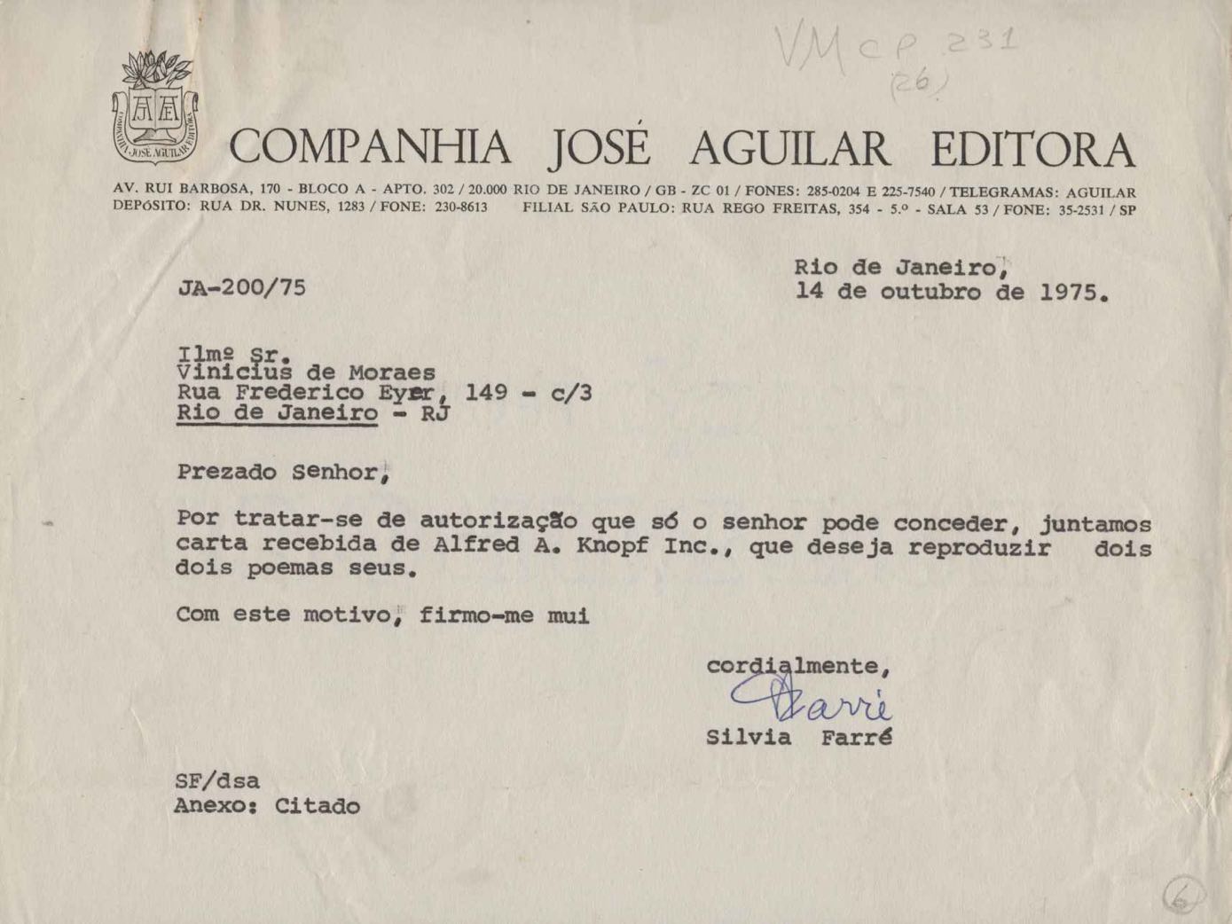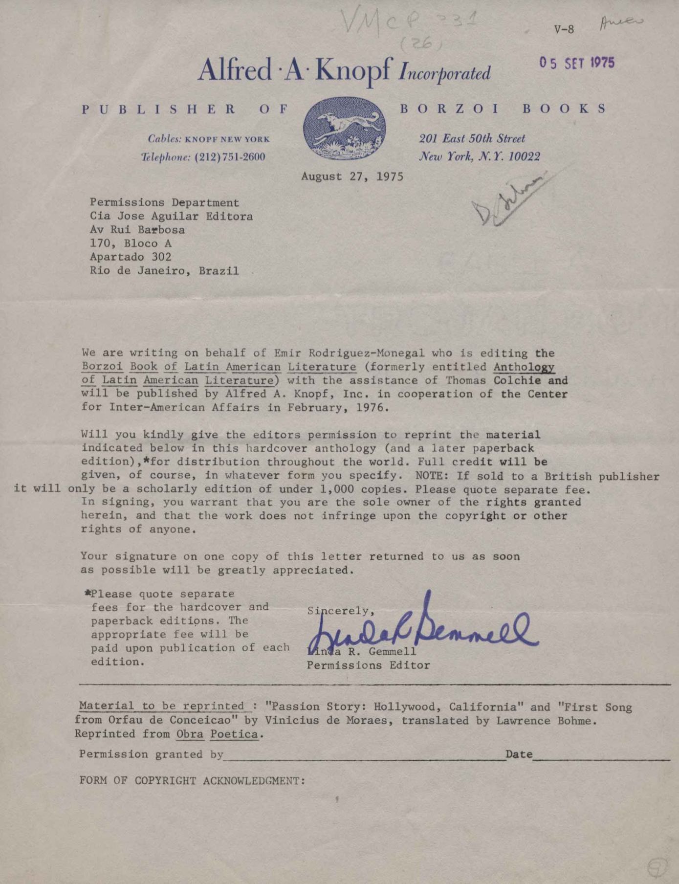 Comentários sobre a edição da obra poética de VM. Pedido de autorização para Alfred A. Knopf Inc. e Random House reproduzirem poemas de VM. Encaminhamento de relatório de vendas de Poesia completa e prosa. Considerações sobre publicação da Antologia poética em sociedade com a Editora do Autor. Anexos: 1. Prestações de contas (2) de direitos autorais; 2. Cartas (2) da Alfred Knopf Inc. à Aguilar; 3. Carta da Aguilar à Random House; 4. Cartas (2) da Aguilar a Lygia de Moraes; 5. "Passion story: Hollywood, Califórnia" e "First song of Orfeu da Conceição", traduções de Lawrence Böhme de poesias de VM.