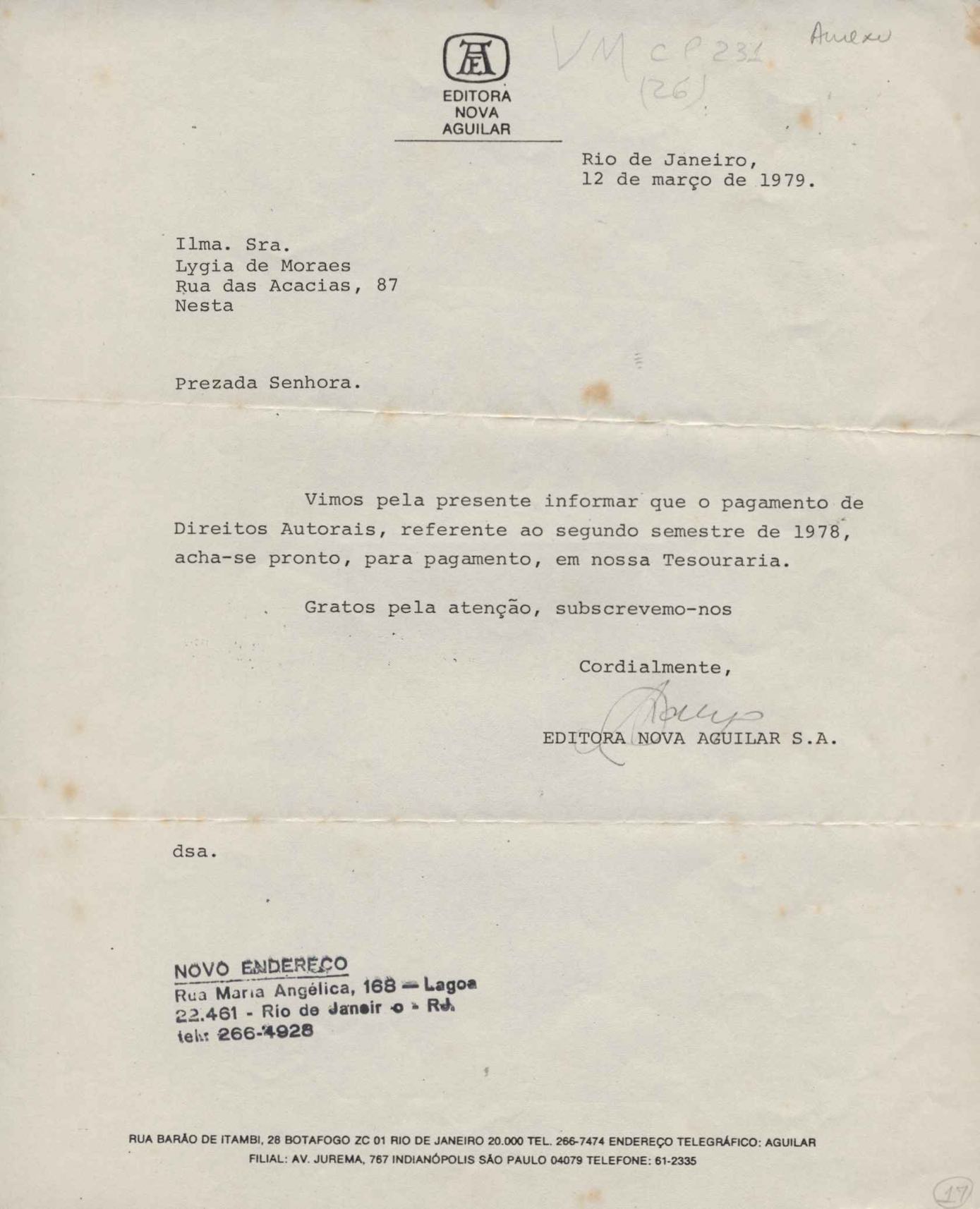 Comentários sobre a edição da obra poética de VM. Pedido de autorização para Alfred A. Knopf Inc. e Random House reproduzirem poemas de VM. Encaminhamento de relatório de vendas de Poesia completa e prosa. Considerações sobre publicação da Antologia poética em sociedade com a Editora do Autor. Anexos: 1. Prestações de contas (2) de direitos autorais; 2. Cartas (2) da Alfred Knopf Inc. à Aguilar; 3. Carta da Aguilar à Random House; 4. Cartas (2) da Aguilar a Lygia de Moraes; 5. "Passion story: Hollywood, Califórnia" e "First song of Orfeu da Conceição", traduções de Lawrence Böhme de poesias de VM.