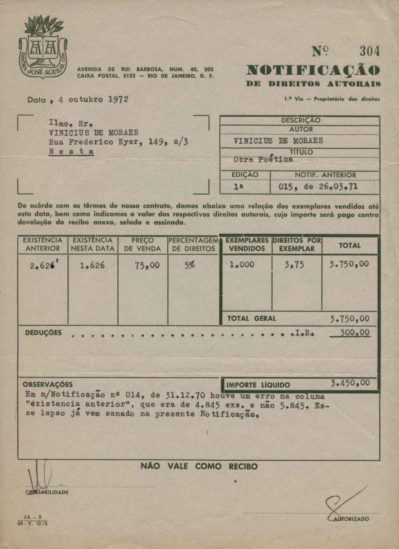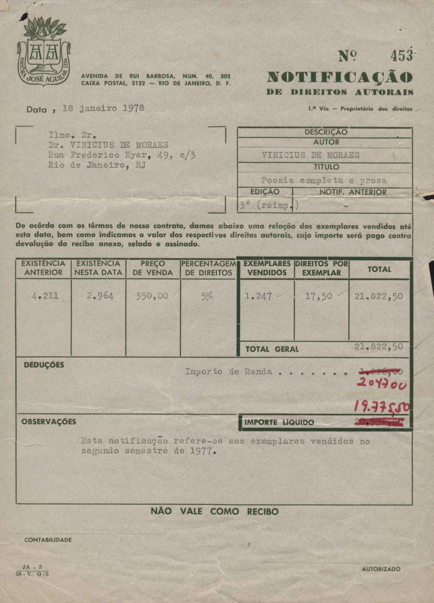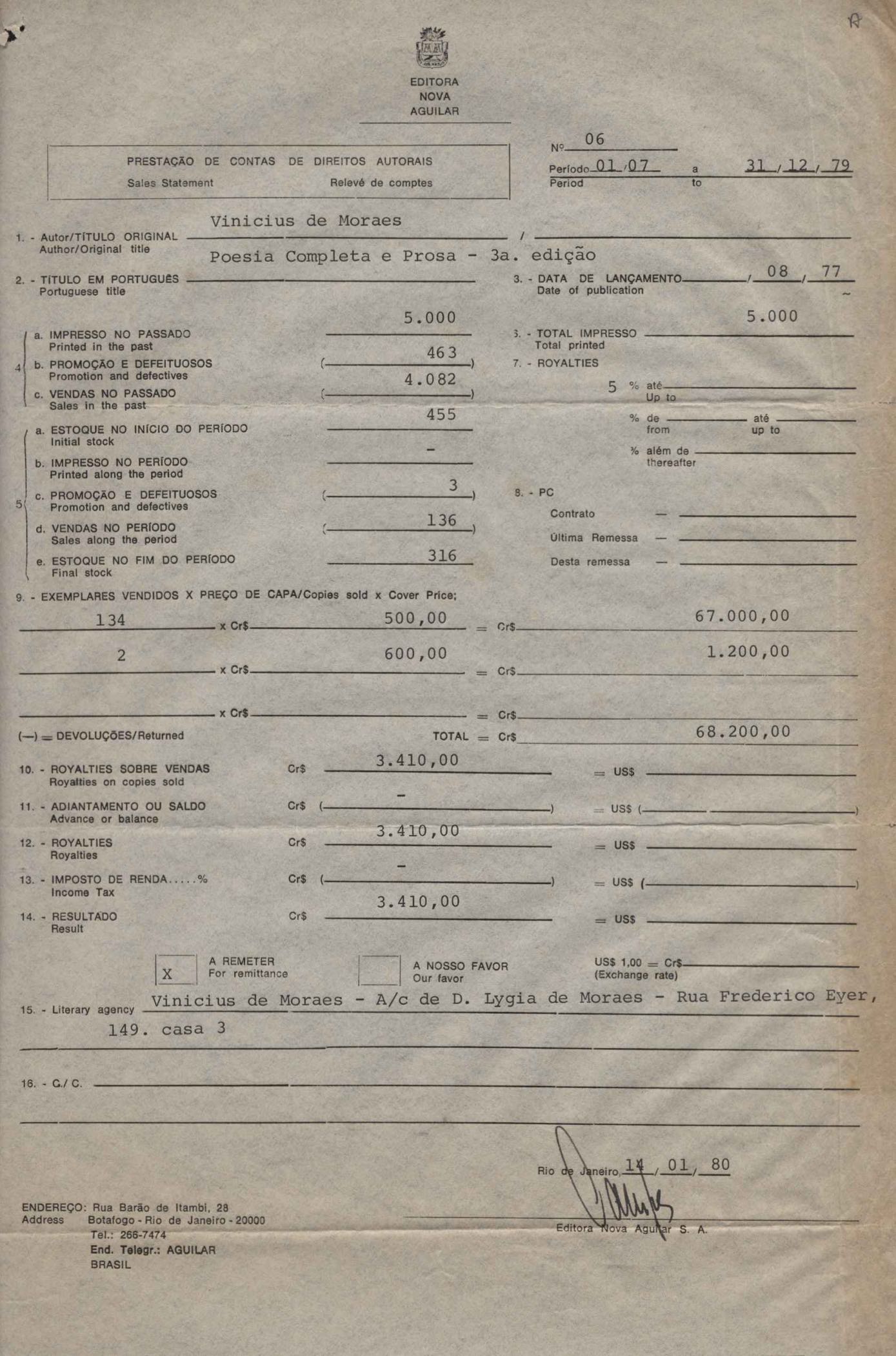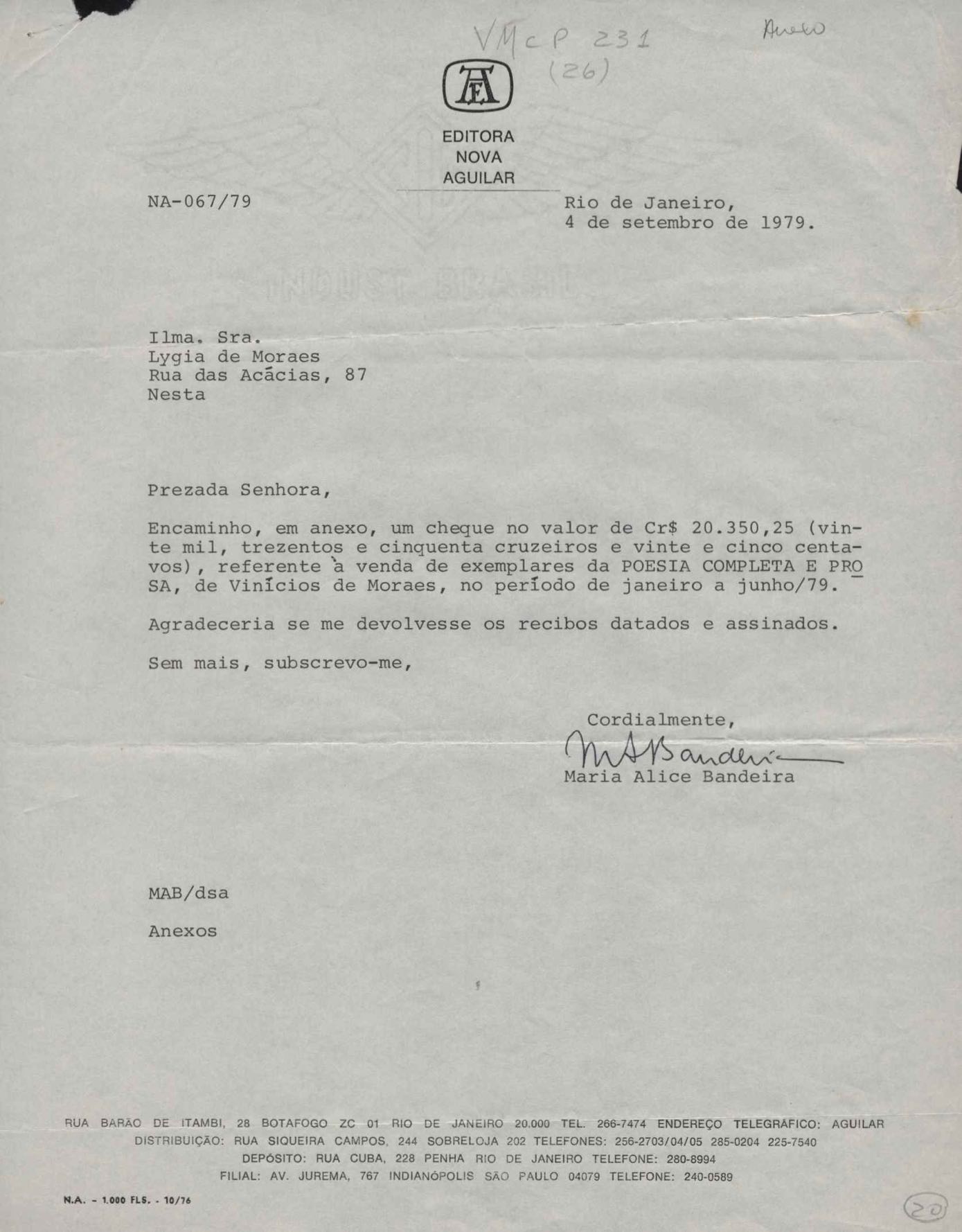 Comentários sobre a edição da obra poética de VM. Pedido de autorização para Alfred A. Knopf Inc. e Random House reproduzirem poemas de VM. Encaminhamento de relatório de vendas de Poesia completa e prosa. Considerações sobre publicação da Antologia poética em sociedade com a Editora do Autor. Anexos: 1. Prestações de contas (2) de direitos autorais; 2. Cartas (2) da Alfred Knopf Inc. à Aguilar; 3. Carta da Aguilar à Random House; 4. Cartas (2) da Aguilar a Lygia de Moraes; 5. "Passion story: Hollywood, Califórnia" e "First song of Orfeu da Conceição", traduções de Lawrence Böhme de poesias de VM.