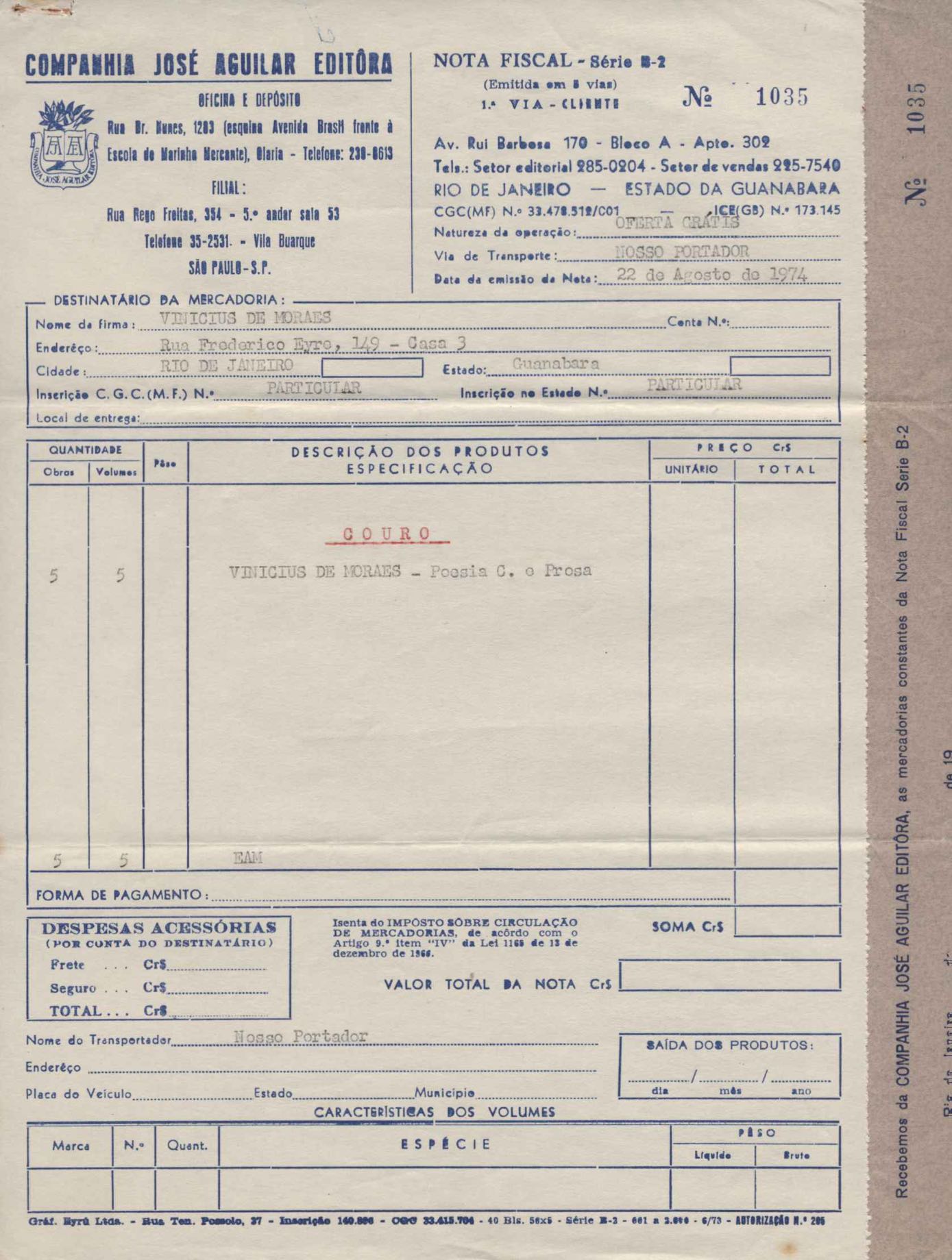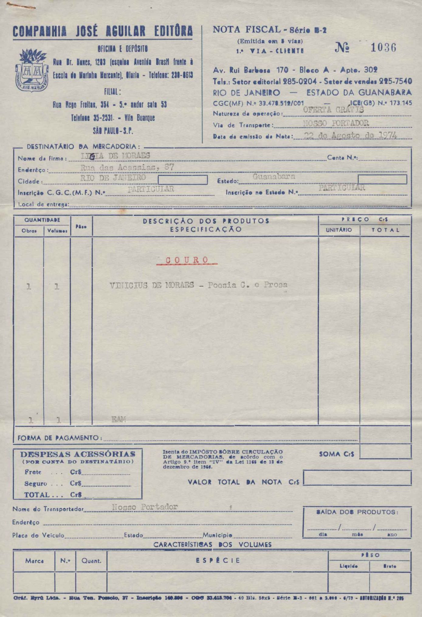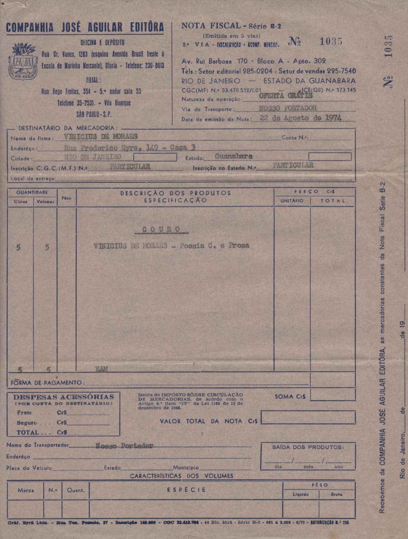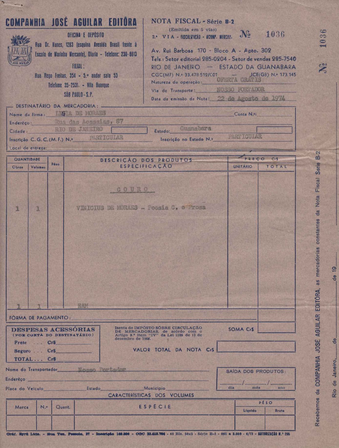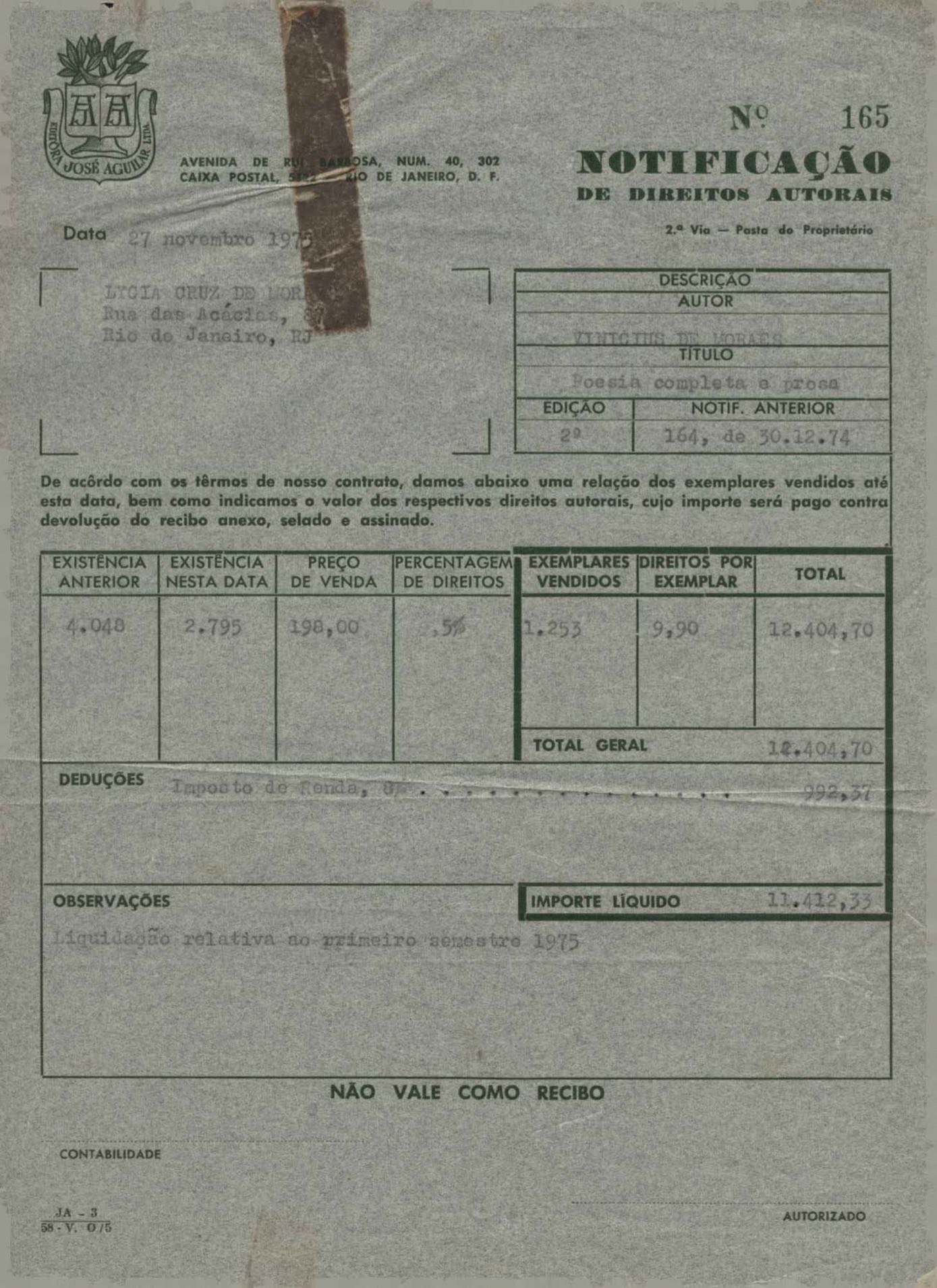 Comentários sobre a edição da obra poética de VM. Pedido de autorização para Alfred A. Knopf Inc. e Random House reproduzirem poemas de VM. Encaminhamento de relatório de vendas de Poesia completa e prosa. Considerações sobre publicação da Antologia poética em sociedade com a Editora do Autor. Anexos: 1. Prestações de contas (2) de direitos autorais; 2. Cartas (2) da Alfred Knopf Inc. à Aguilar; 3. Carta da Aguilar à Random House; 4. Cartas (2) da Aguilar a Lygia de Moraes; 5. "Passion story: Hollywood, Califórnia" e "First song of Orfeu da Conceição", traduções de Lawrence Böhme de poesias de VM.