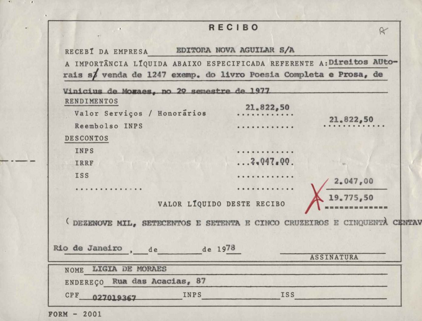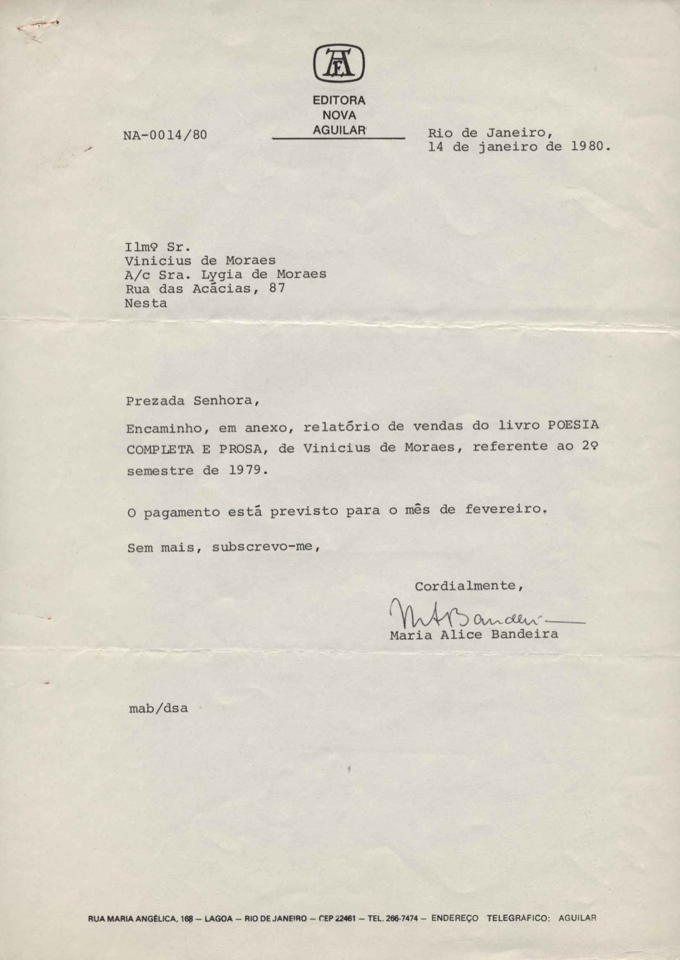 Comentários sobre a edição da obra poética de VM. Pedido de autorização para Alfred A. Knopf Inc. e Random House reproduzirem poemas de VM. Encaminhamento de relatório de vendas de Poesia completa e prosa. Considerações sobre publicação da Antologia poética em sociedade com a Editora do Autor. Anexos: 1. Prestações de contas (2) de direitos autorais; 2. Cartas (2) da Alfred Knopf Inc. à Aguilar; 3. Carta da Aguilar à Random House; 4. Cartas (2) da Aguilar a Lygia de Moraes; 5. "Passion story: Hollywood, Califórnia" e "First song of Orfeu da Conceição", traduções de Lawrence Böhme de poesias de VM.