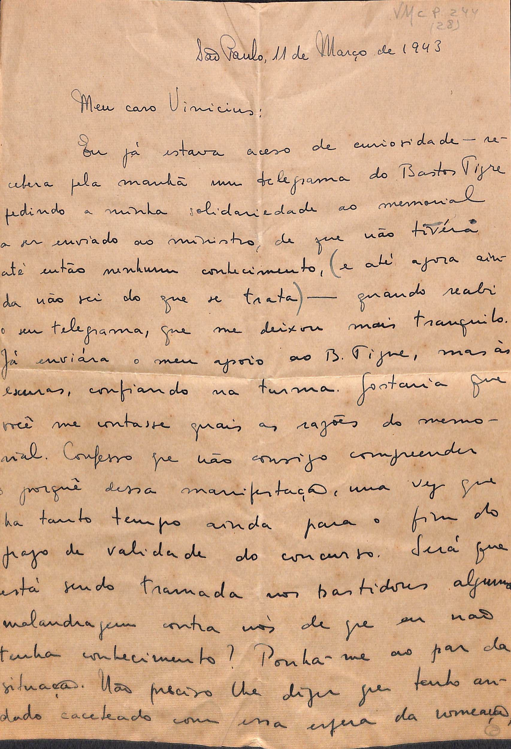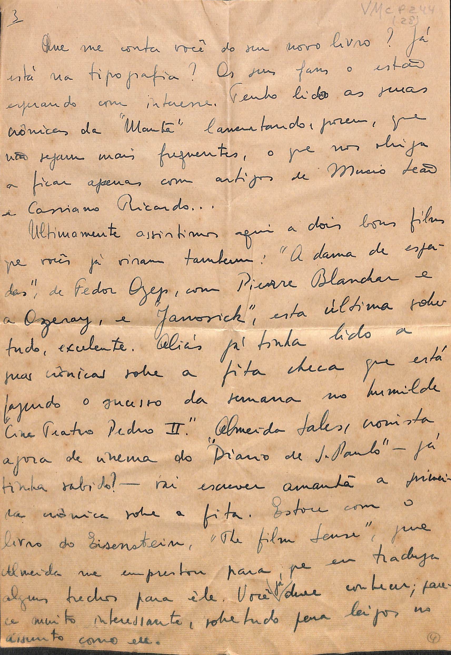 Pedido de informações sobre aula [preparatória para concurso]. Manifesto sobre nomeação para [cargo público]. Menção a crônicas de VM em A Manhã. Considerações sobre a tendência da poesia brasileira contemporânea e sobre a obra de VM. Comentários sobre seu cotidiano nos EUA e sobre amigos em comum.