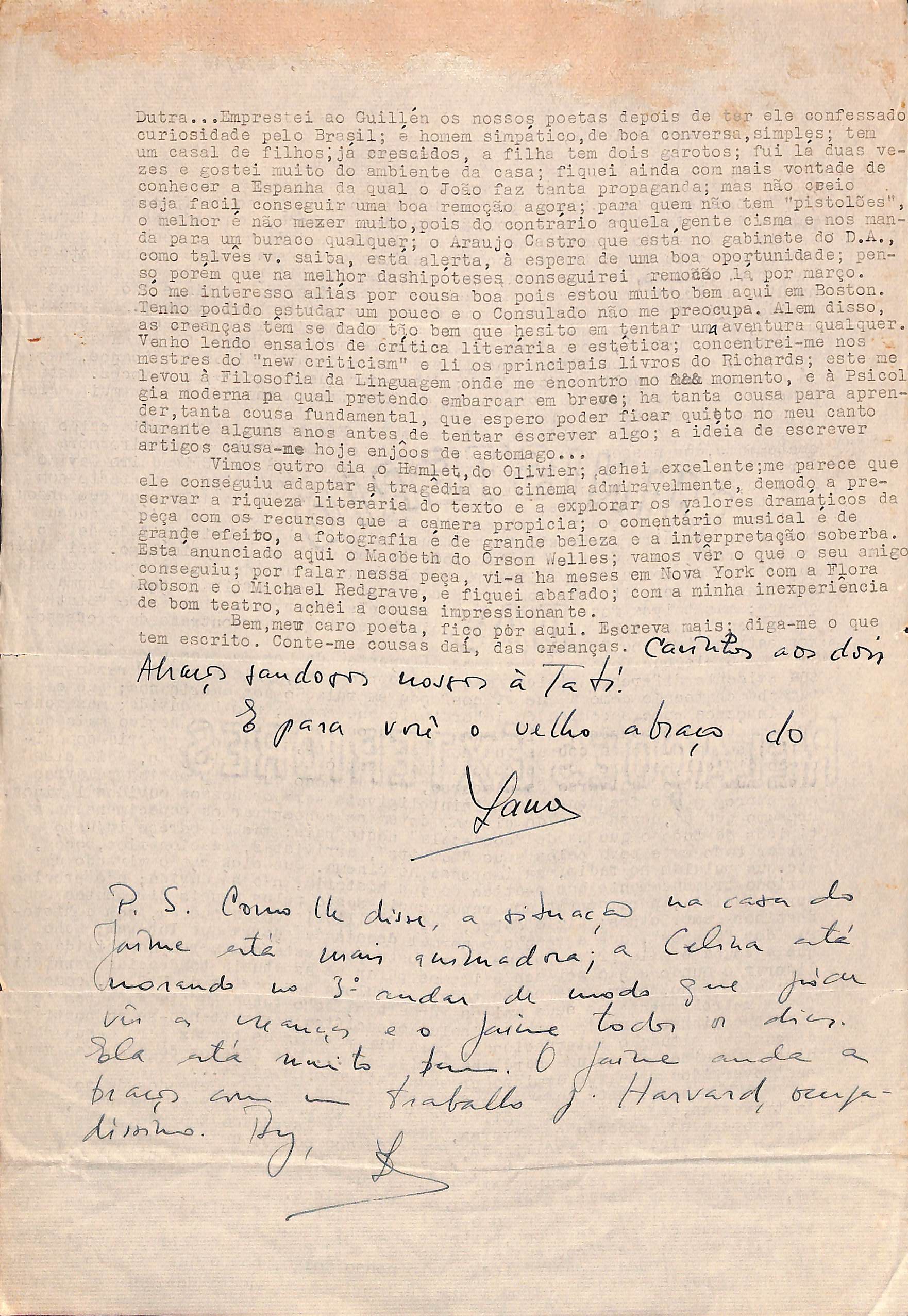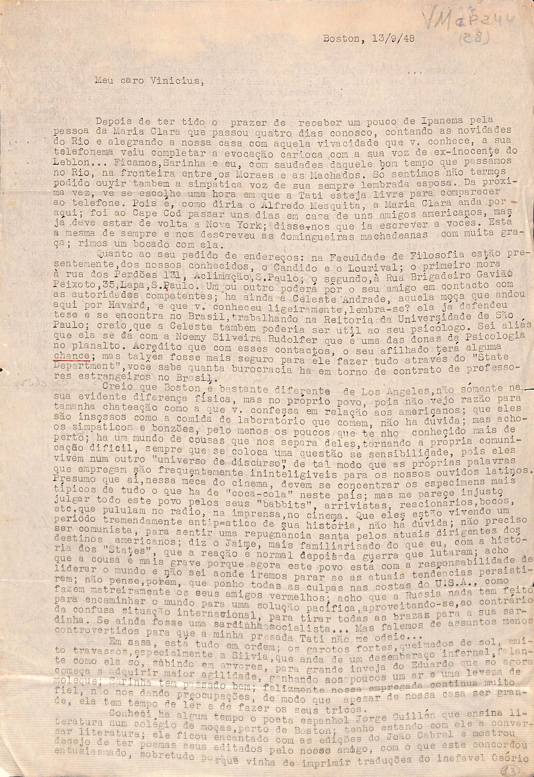 Pedido de informações sobre aula [preparatória para concurso]. Manifesto sobre nomeação para [cargo público]. Menção a crônicas de VM em A Manhã. Considerações sobre a tendência da poesia brasileira contemporânea e sobre a obra de VM. Comentários sobre seu cotidiano nos EUA e sobre amigos em comum.