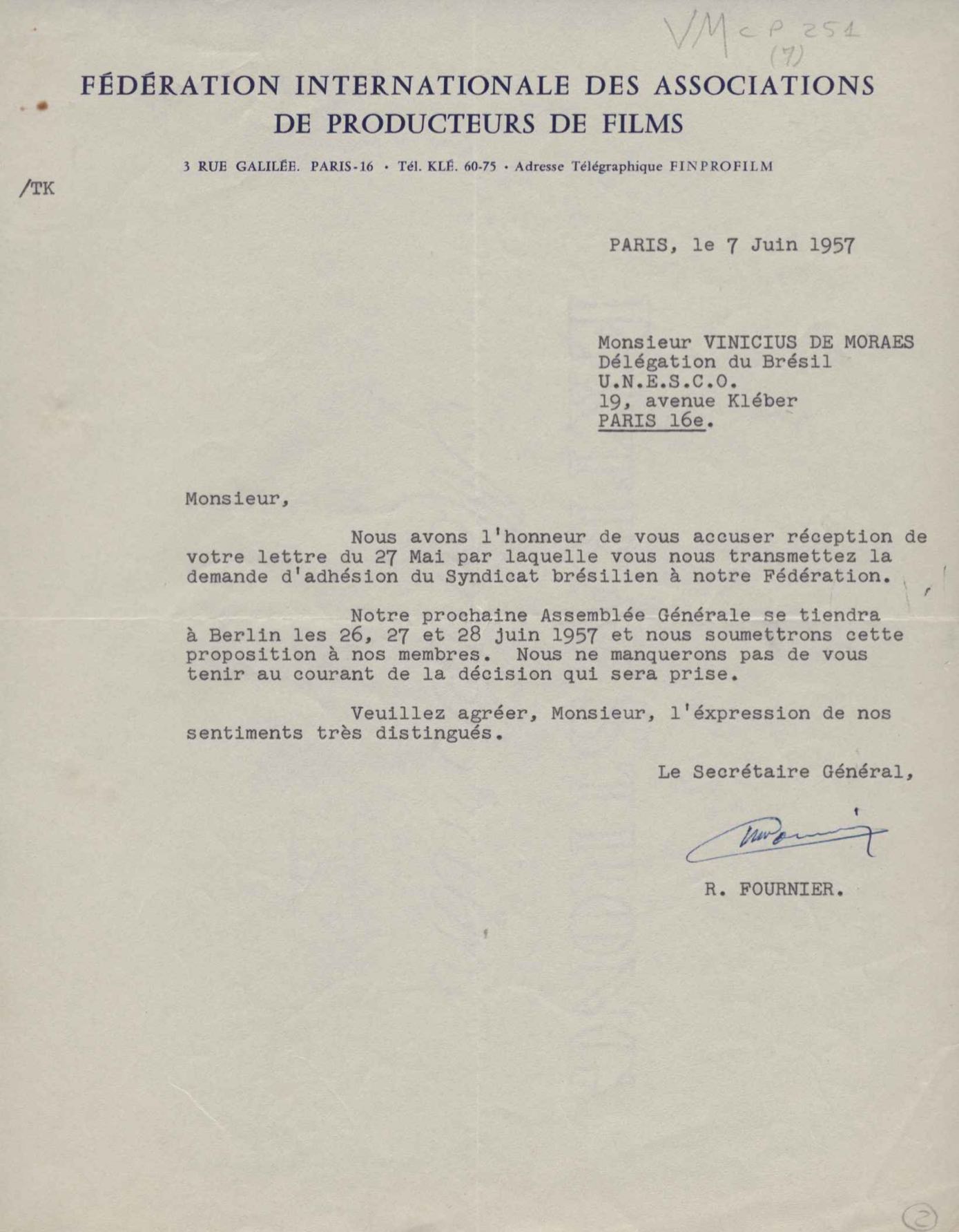Filiação do Sindicato Nacional da Indústria Cinematográfica à Fédération.