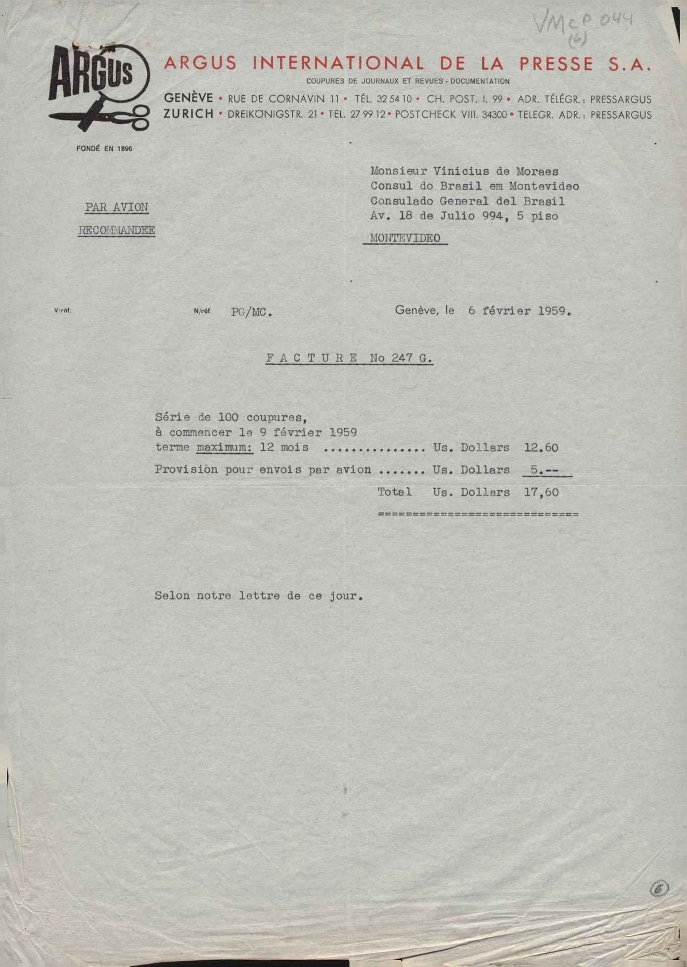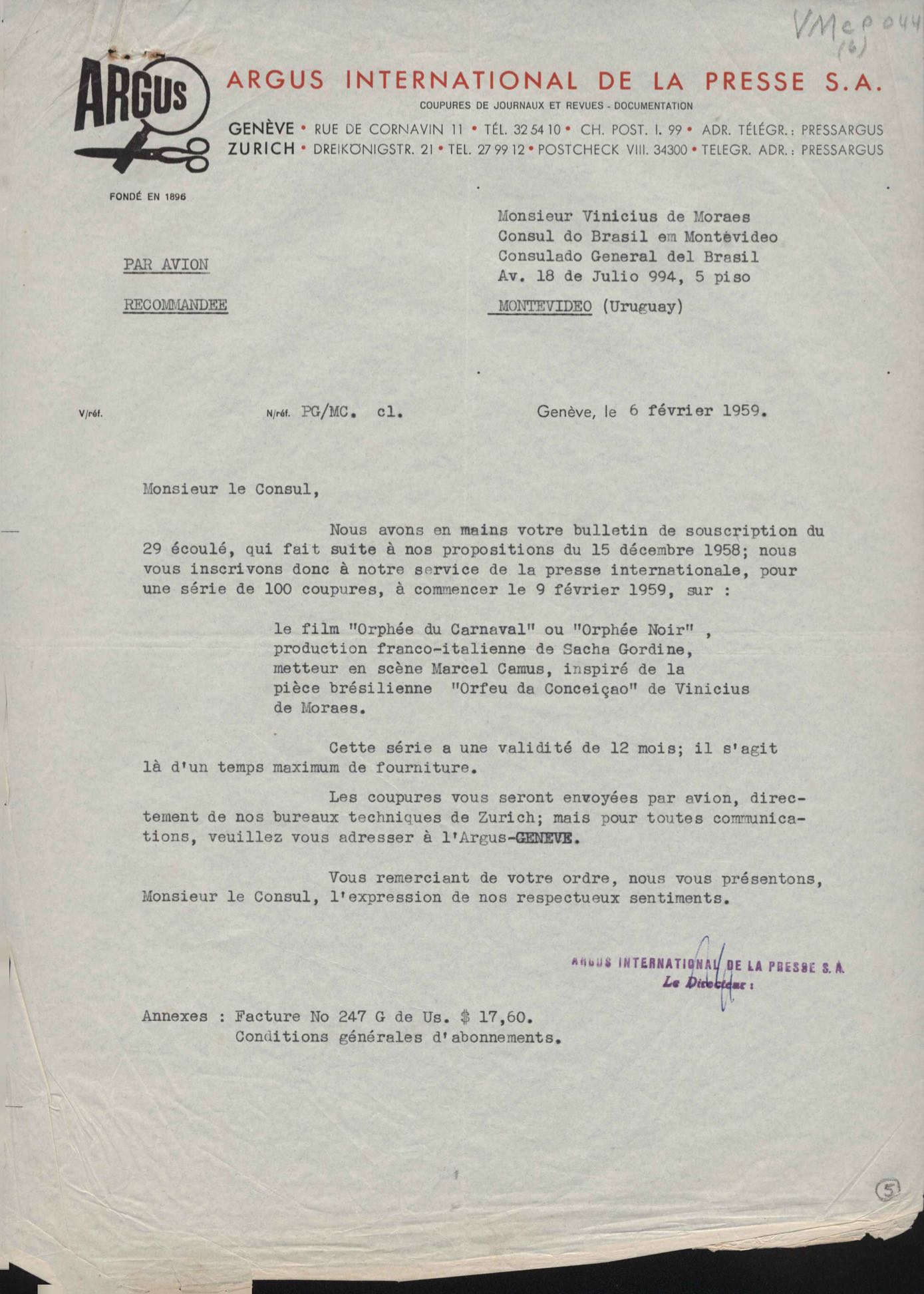 Comentários sobre a divulgação do filme Orfeu negro. Anexo: Faturas de cobrança de serviços.