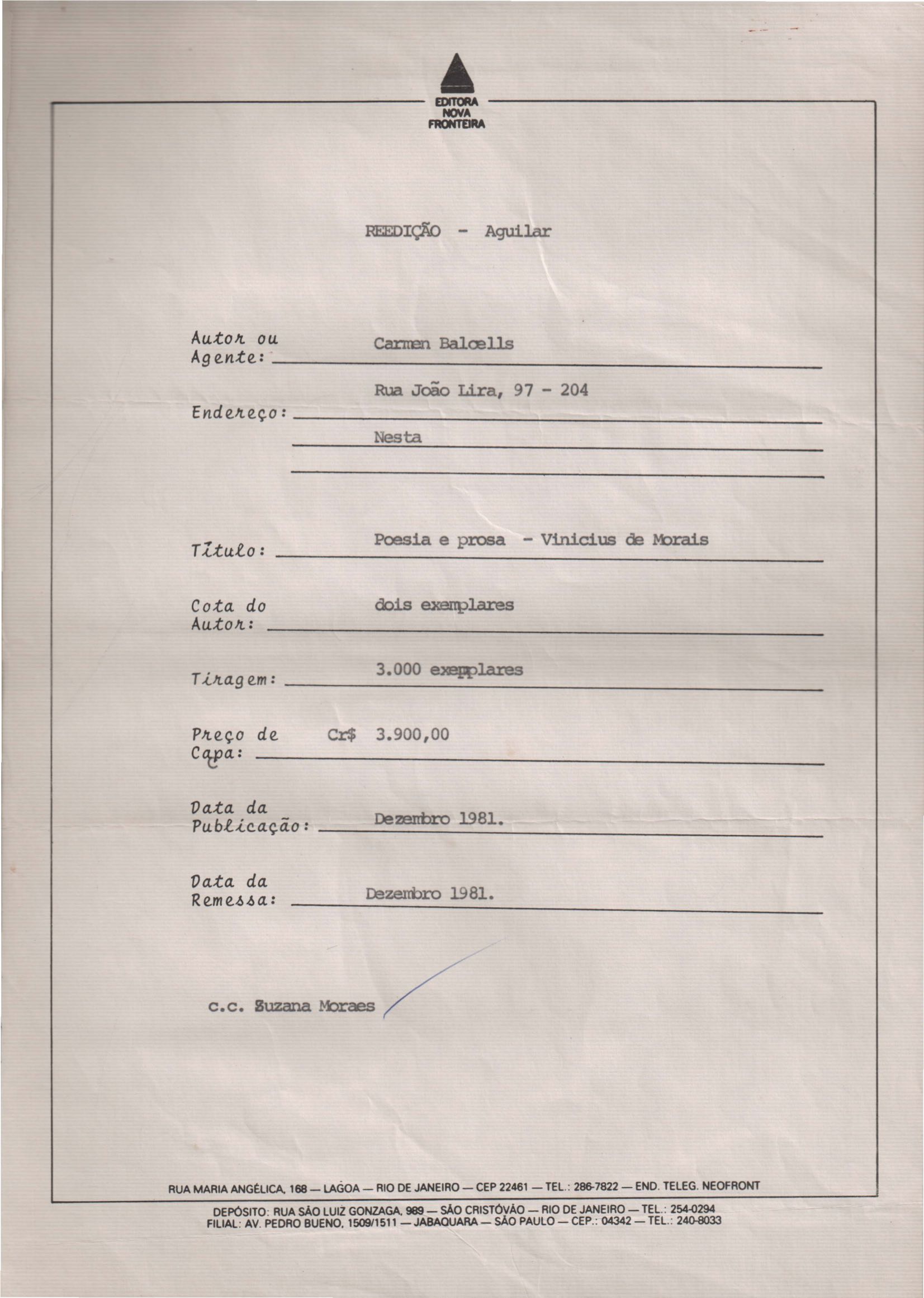 Comunicado da reedição do livro Poesia e prosa, de VM.