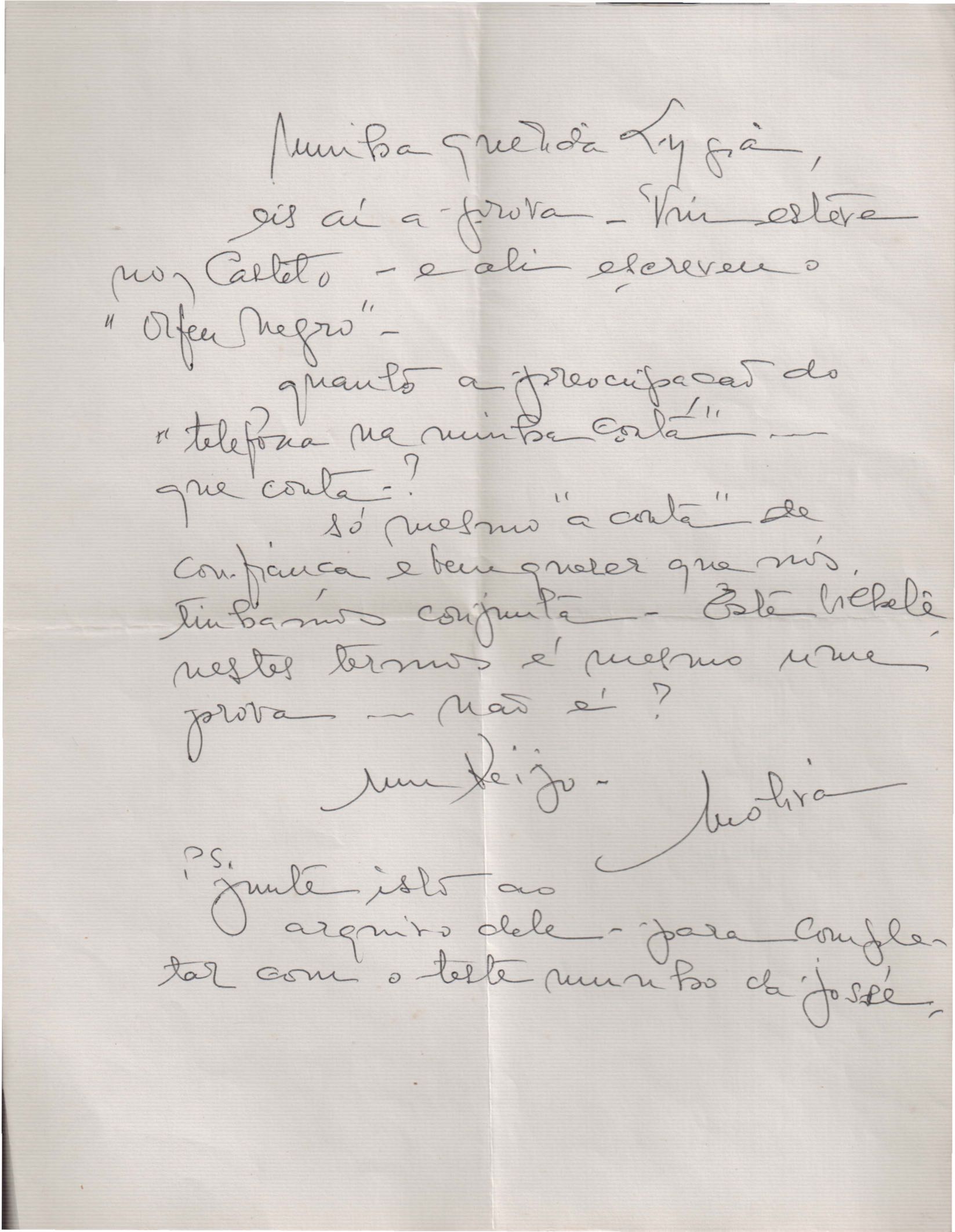 Envio de bilhete escrito por VM. Segundo a signatária é uma comprovação do local onde ele, VM, escreveu Orfeu negro. Solicitação para incluir no arquivo de VM.