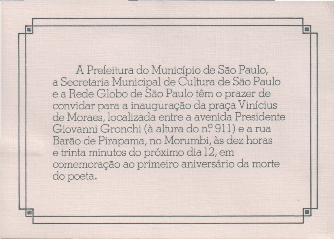 Inauguração da Praça Vinicius de Moraes no bairro Morumbi, entre a Av. Pres. Giovanni Gronchi e a rua Barão de Pirapama – São Paulo, 12 [jul.] 1981, às 10h.