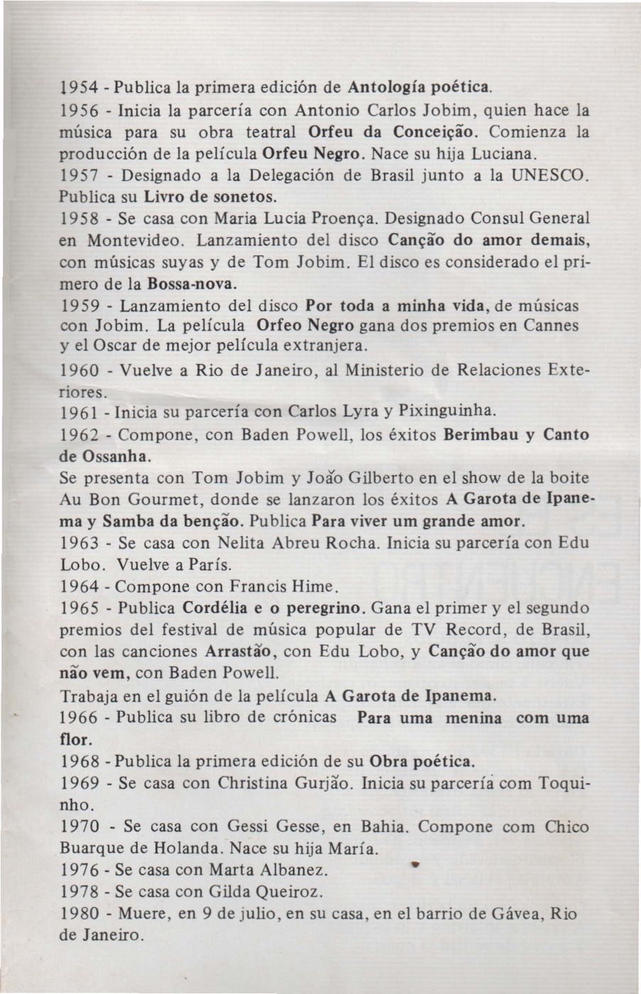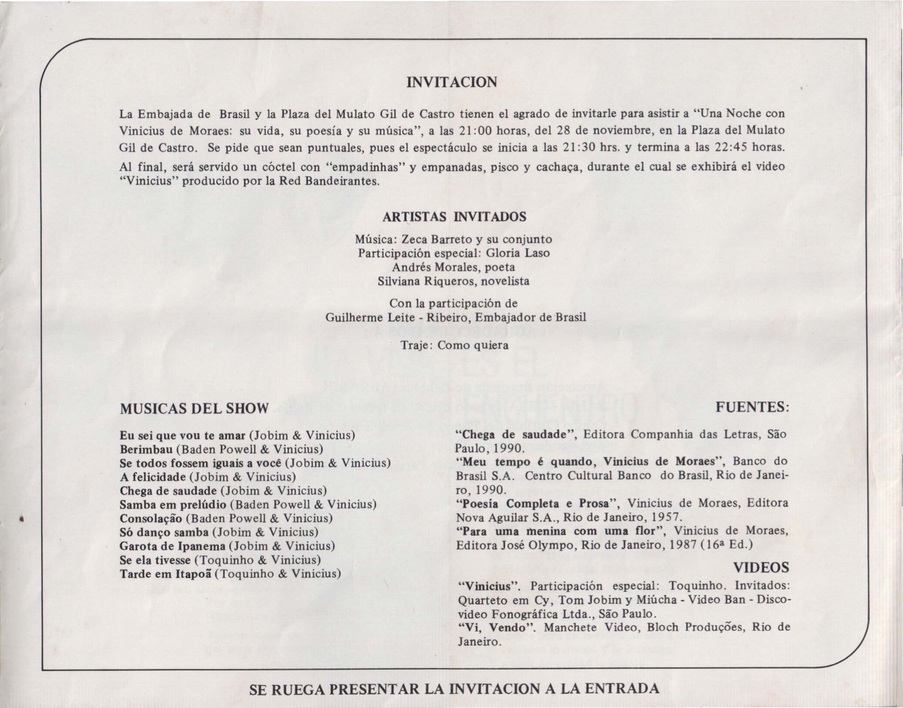 Convite à família de VM para o show "Una Noche con Vinicius de Moraes: su vida, su poesía y su música”, na Plaza del Mulato Gil de Castro.