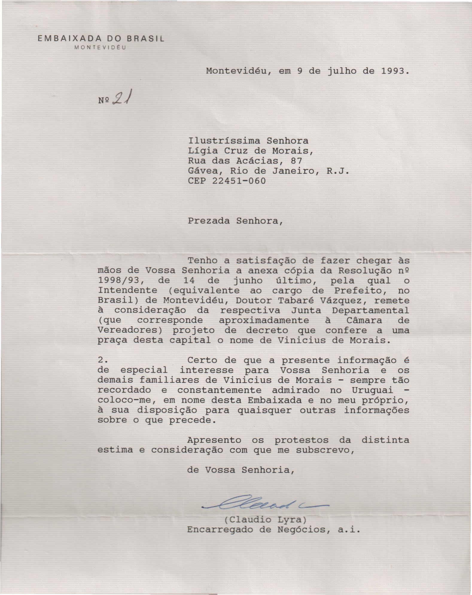 Ofício nº 21. O documento é assinado por Cláudio Lira, embaixador. Fotocópia da Resolução nº 1998/93.