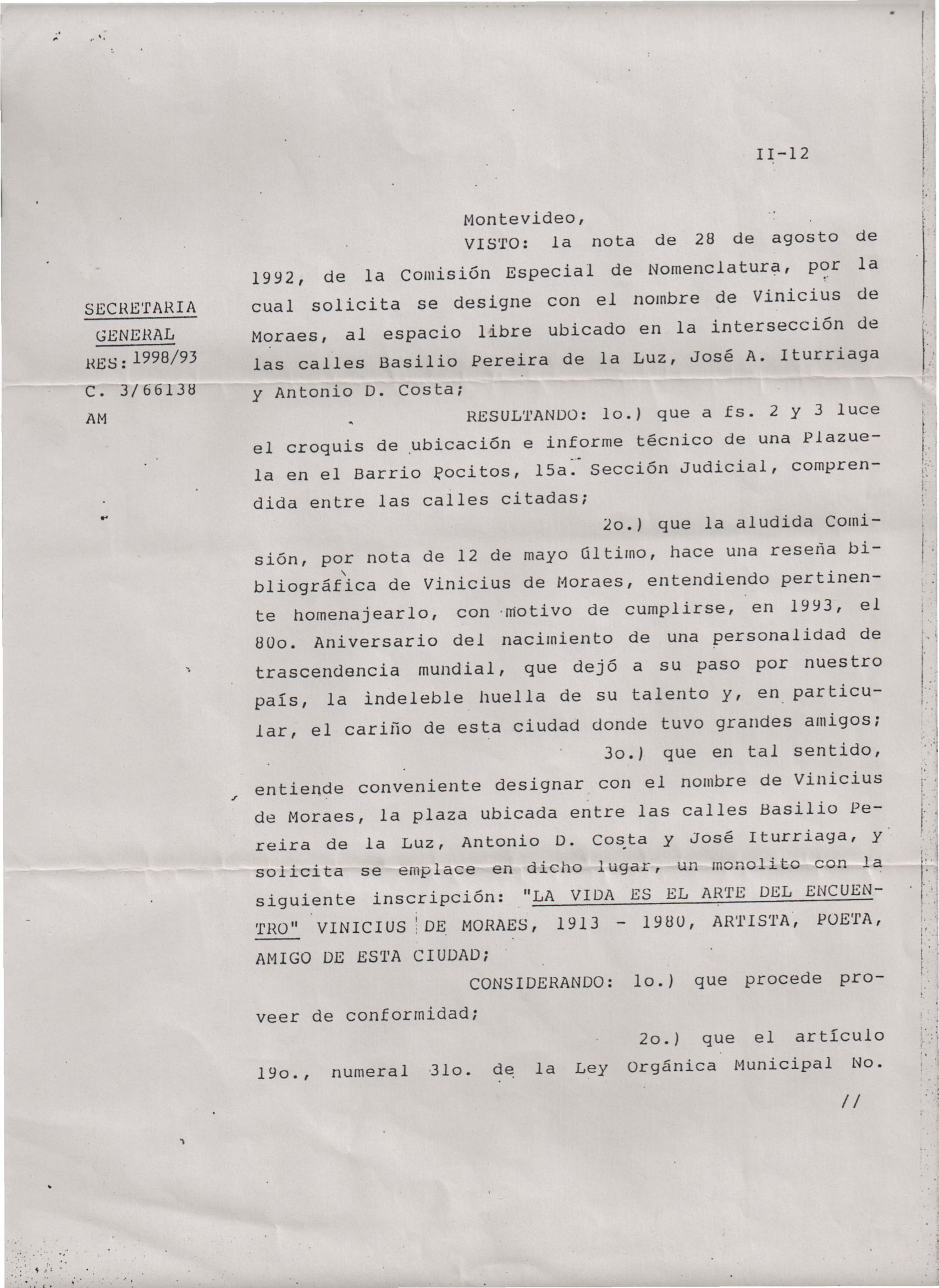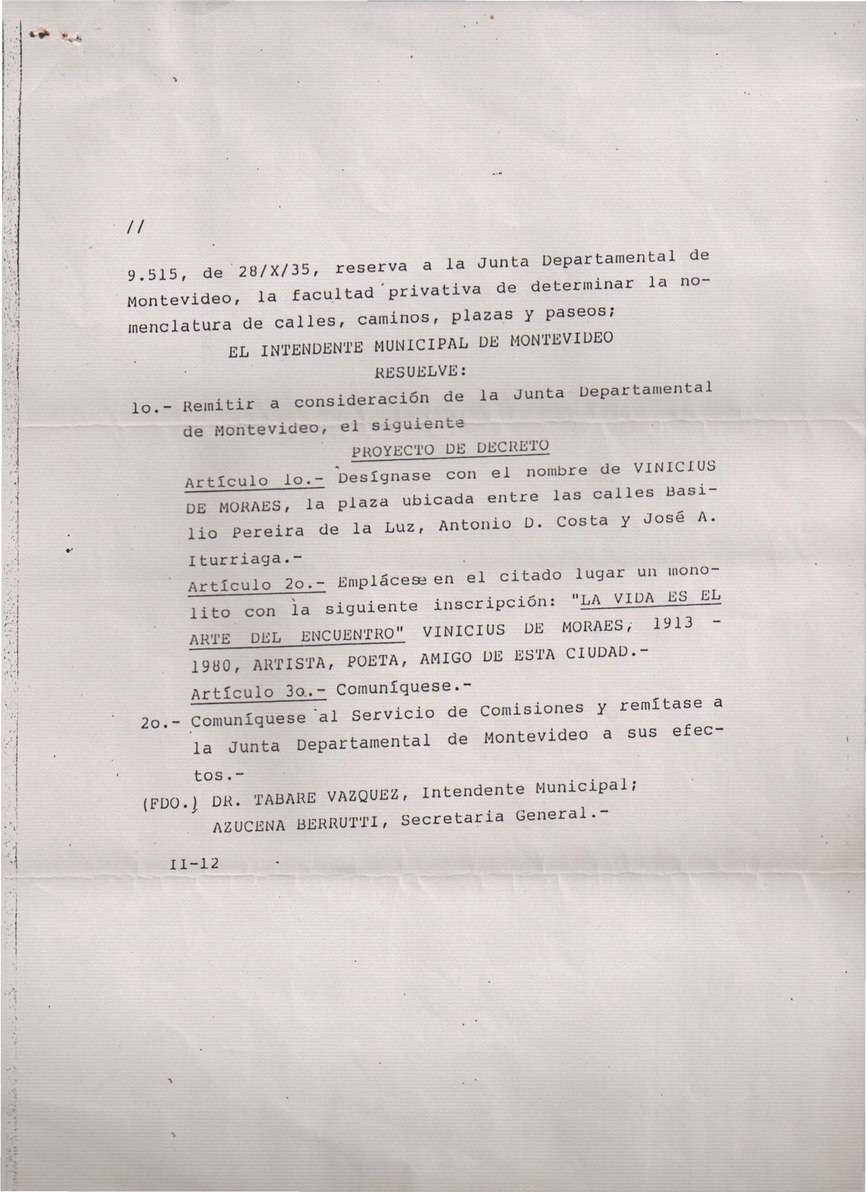 Resolução referente ao decreto que confere a uma Praça de Montevidéu o nome de VM.