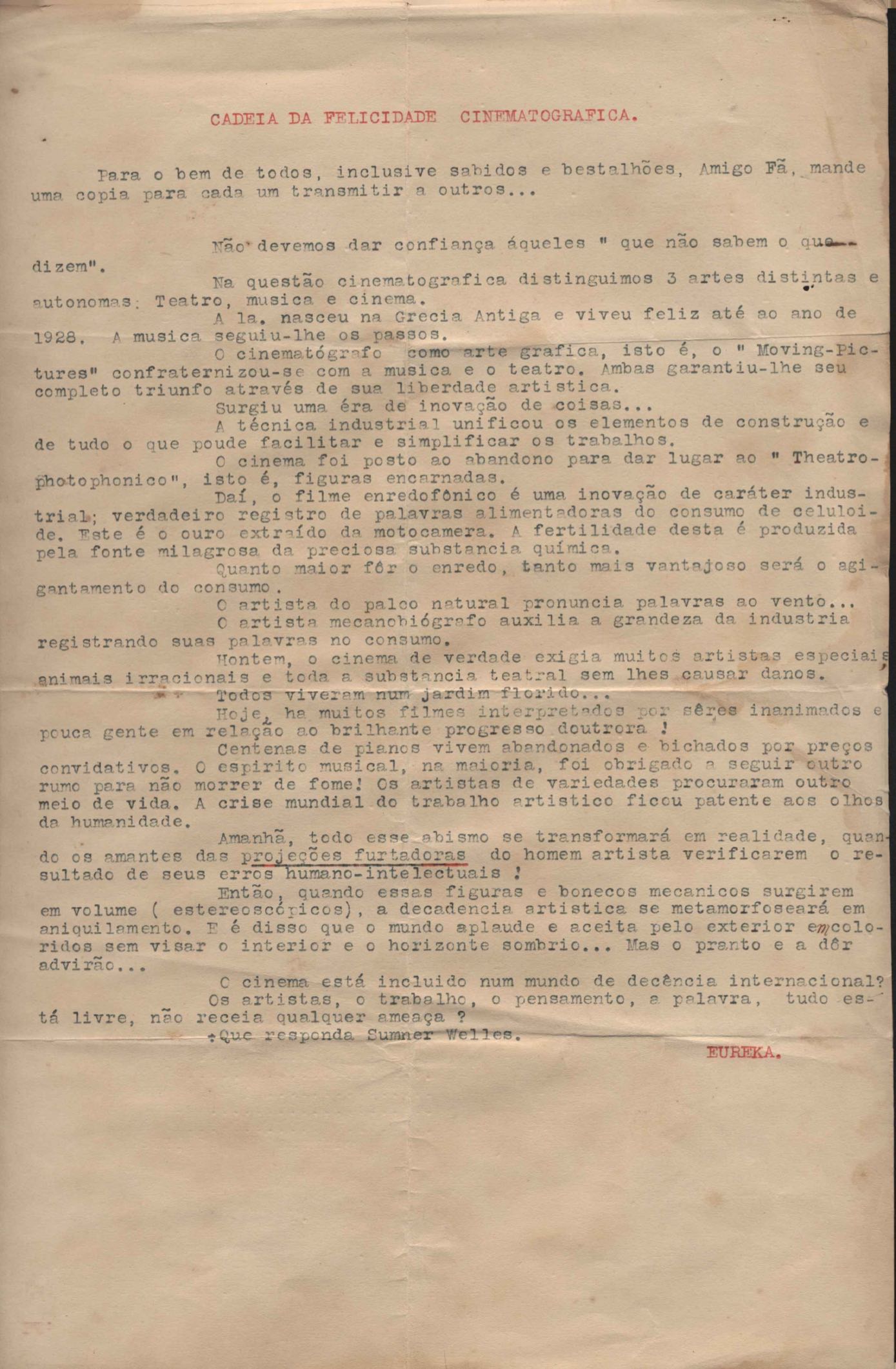 Artigo. Cópia carbonada. O artigo "Cadeia da felicidade cinematográfica" está assinado como "Eureka". Há documento incompleto. Trecho de uma crítica de cinema foi feita por VM: "A XII Mostra Internacional de Arte Cinematográfica de Veneza".