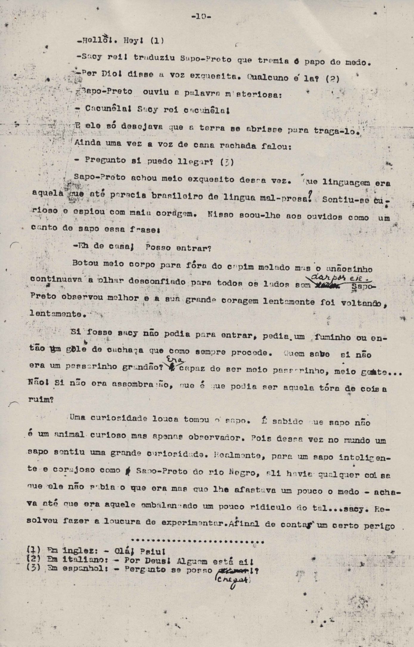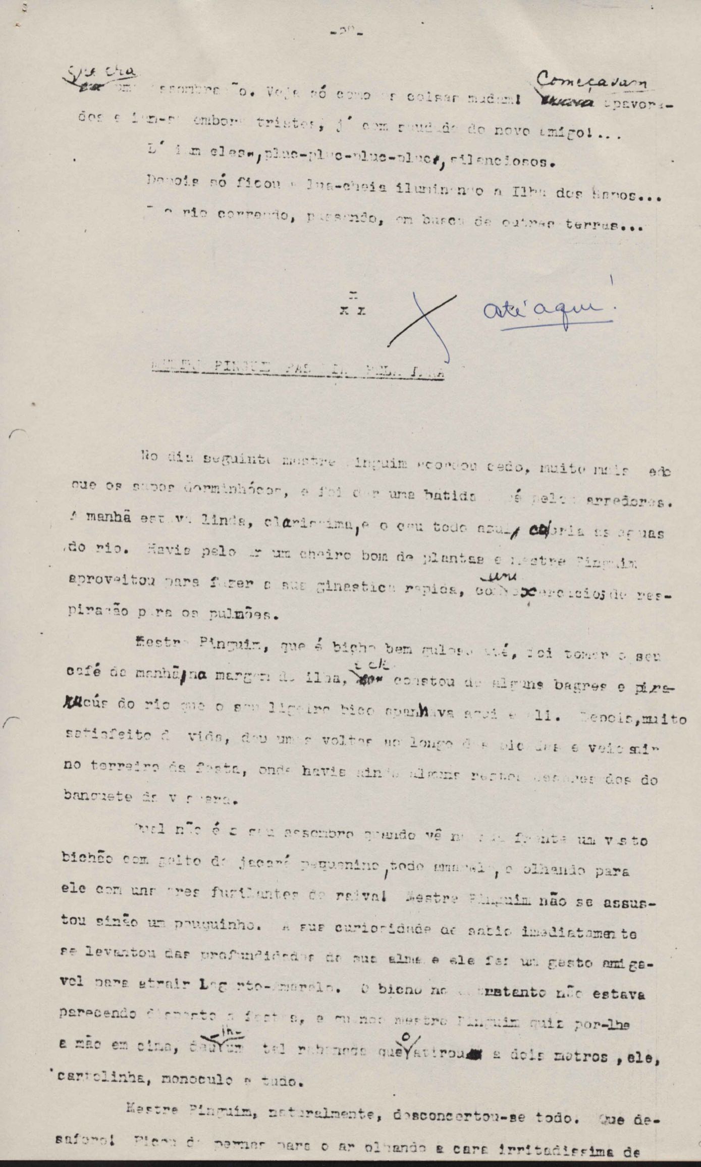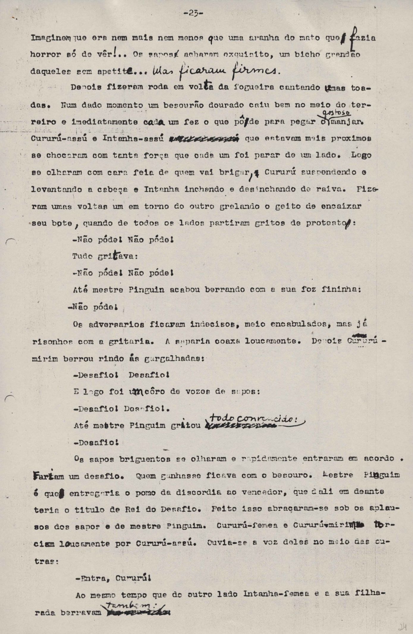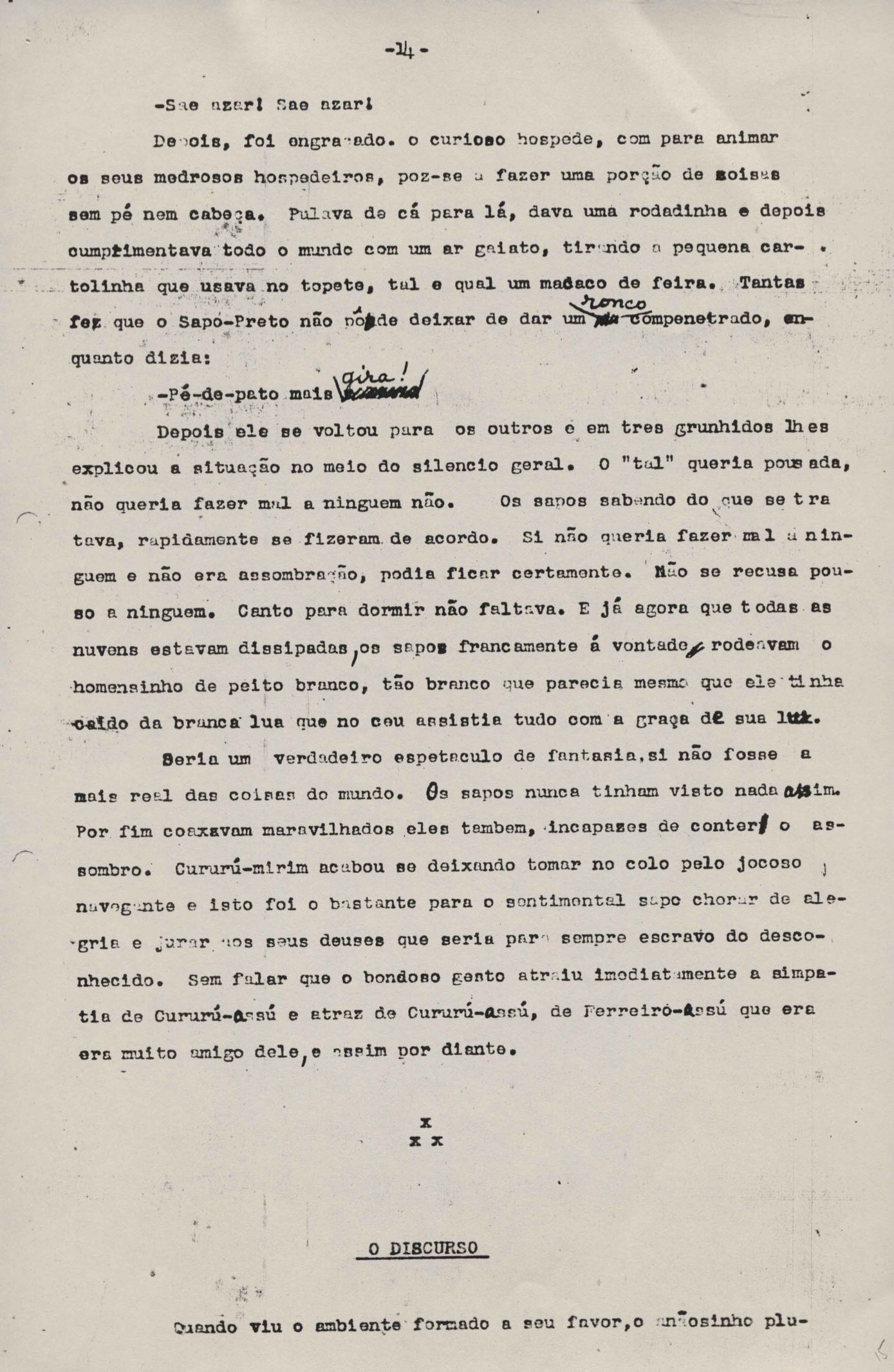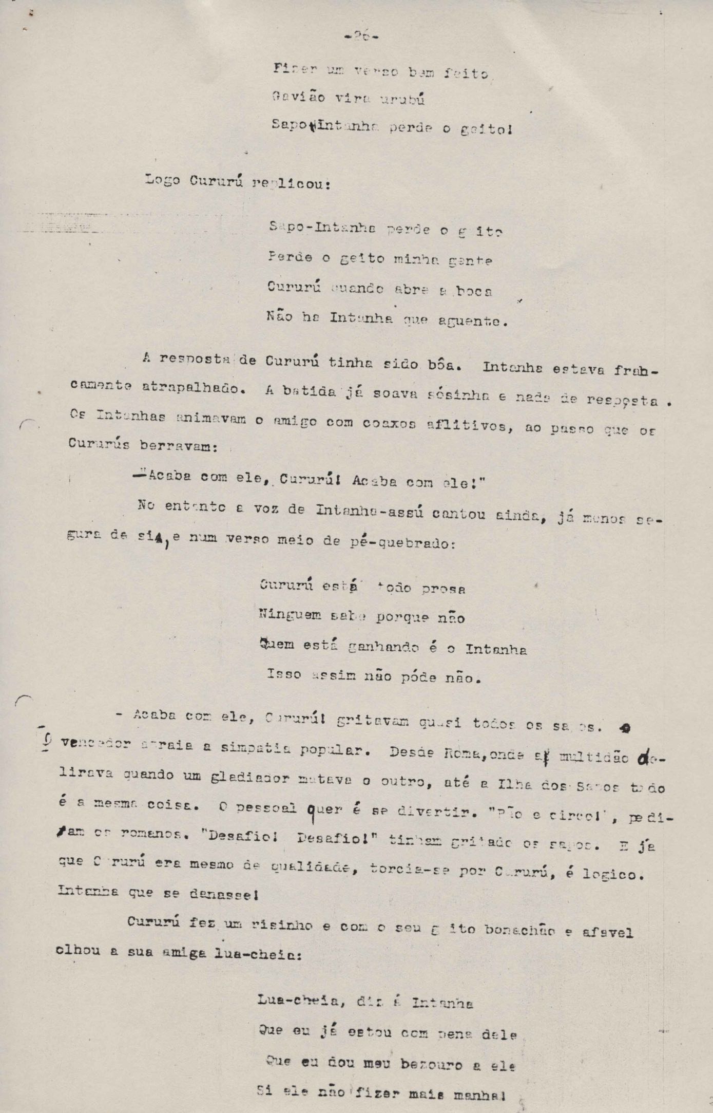 Conto. Cópia carbonada. Há documento incompleto. Há anotações no verso da última folha do conto "Cuidado, que você cai!".