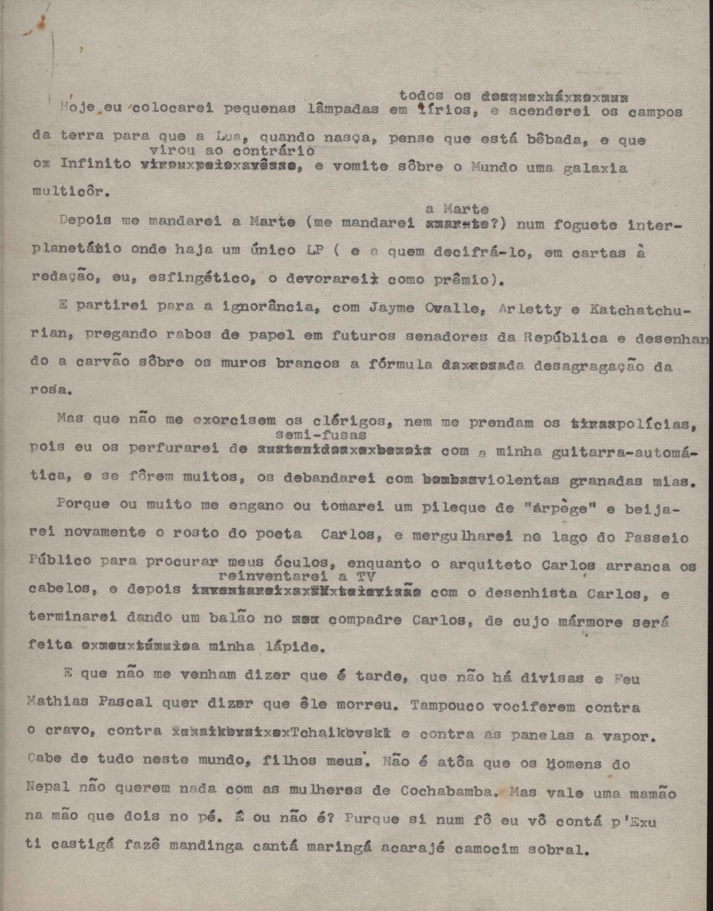 Crônica. Cópia carbonada. Trecho das crônicas "Libelo" e "Carta mortuária a Dolores Duran".