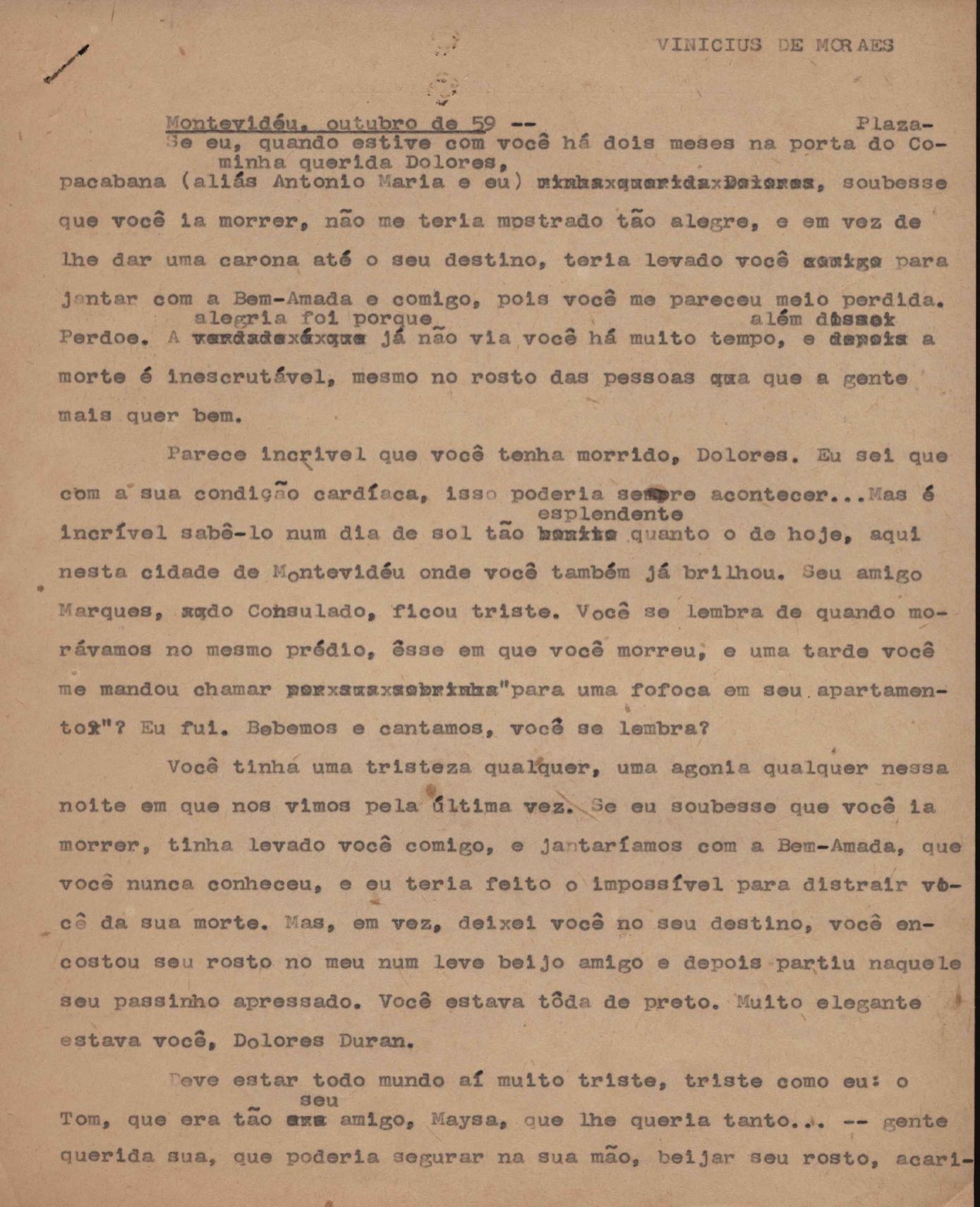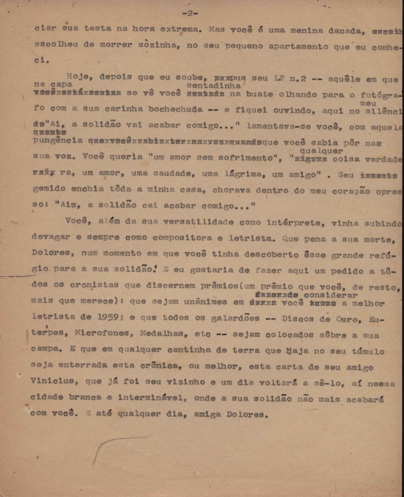 Crônica. Cópia carbonada. Trecho das crônicas "Libelo" e "Carta mortuária a Dolores Duran".