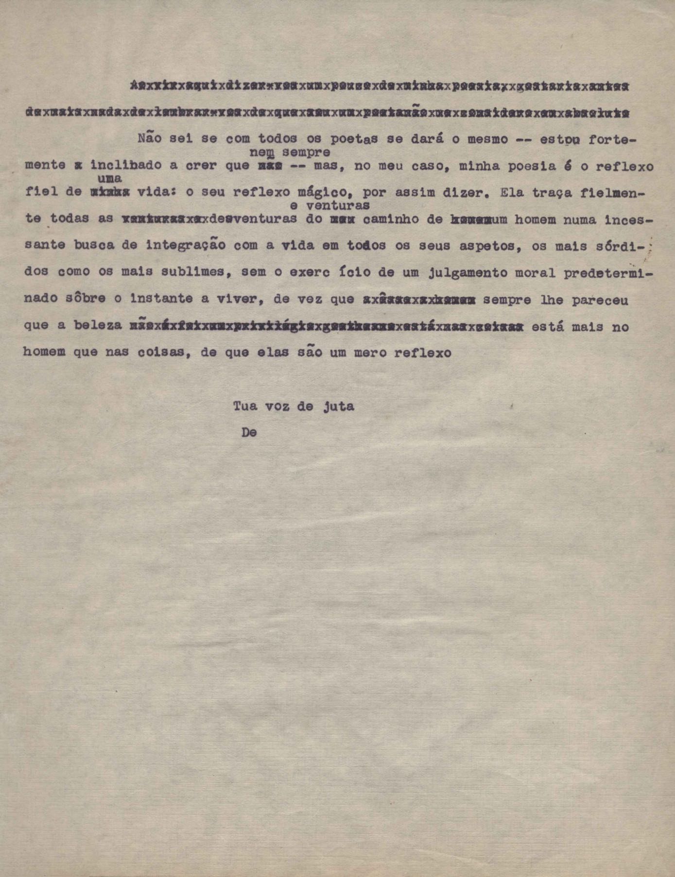Crônica. Cópia carbonada. Trecho das crônicas "Libelo" e "Carta mortuária a Dolores Duran".