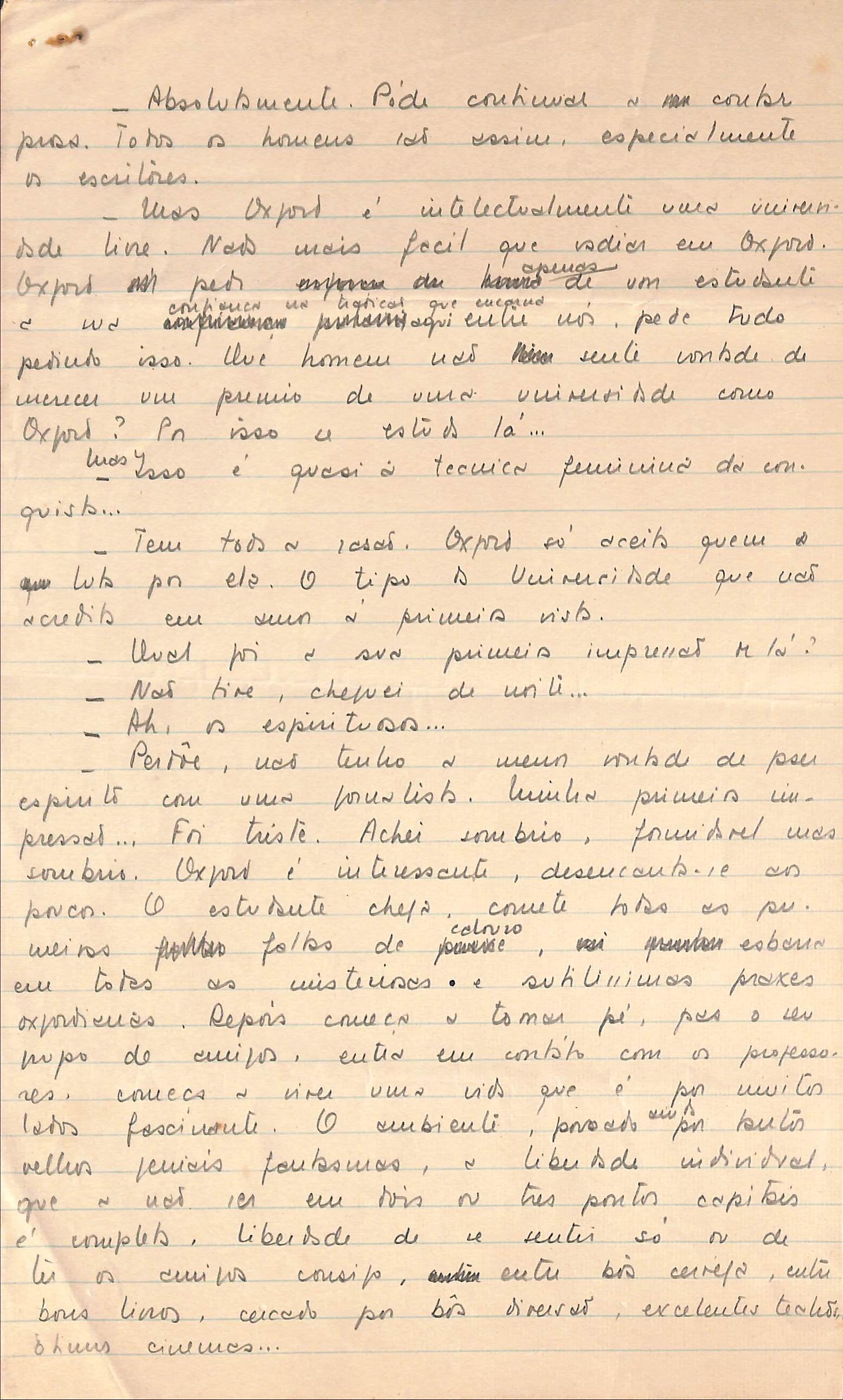 Entrevista. Transcrição de trecho da entrevista dada por VM à jornalista Tati de Mello [Beatriz Azevedo de Mello] na rádio BBC de Londres.