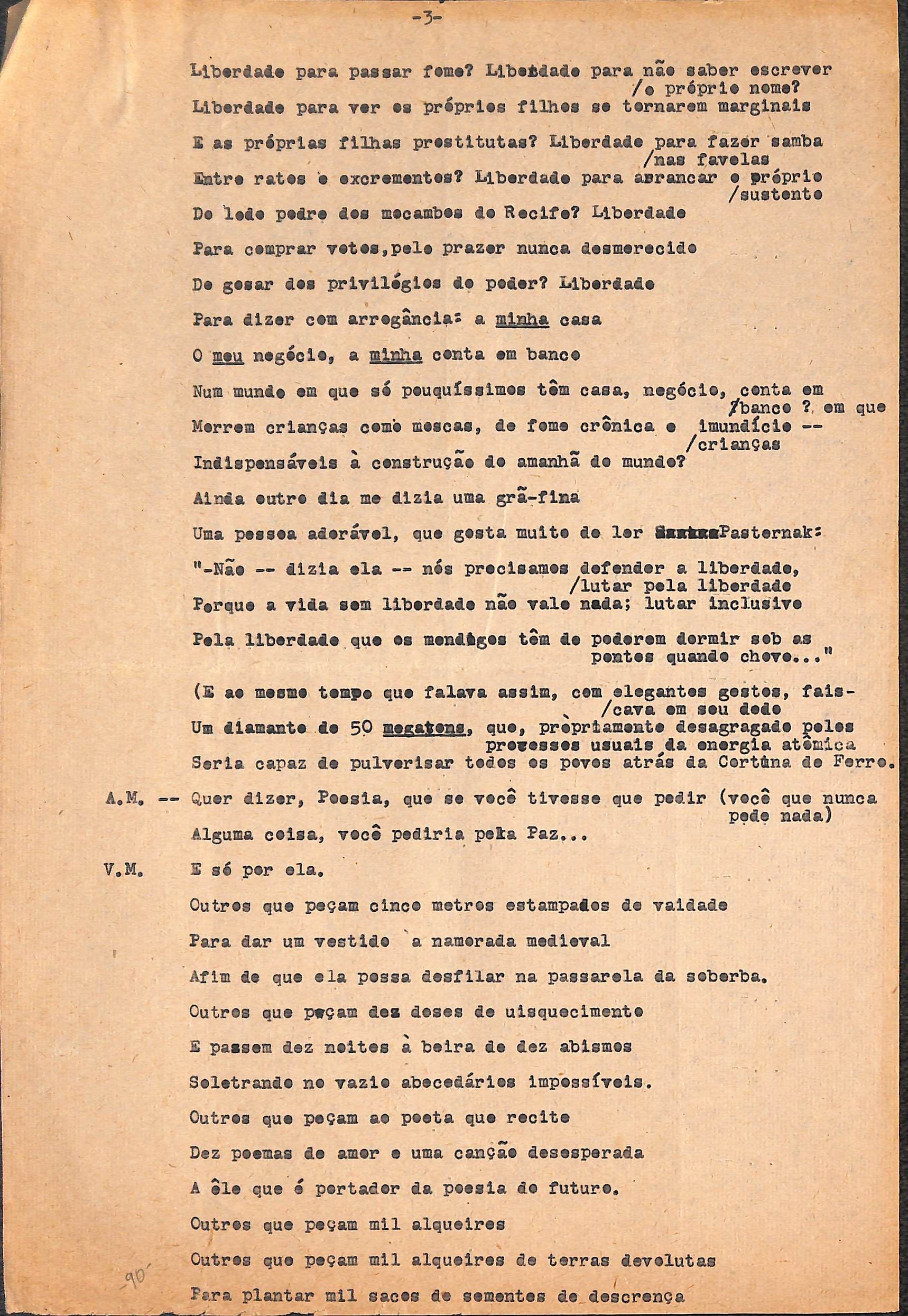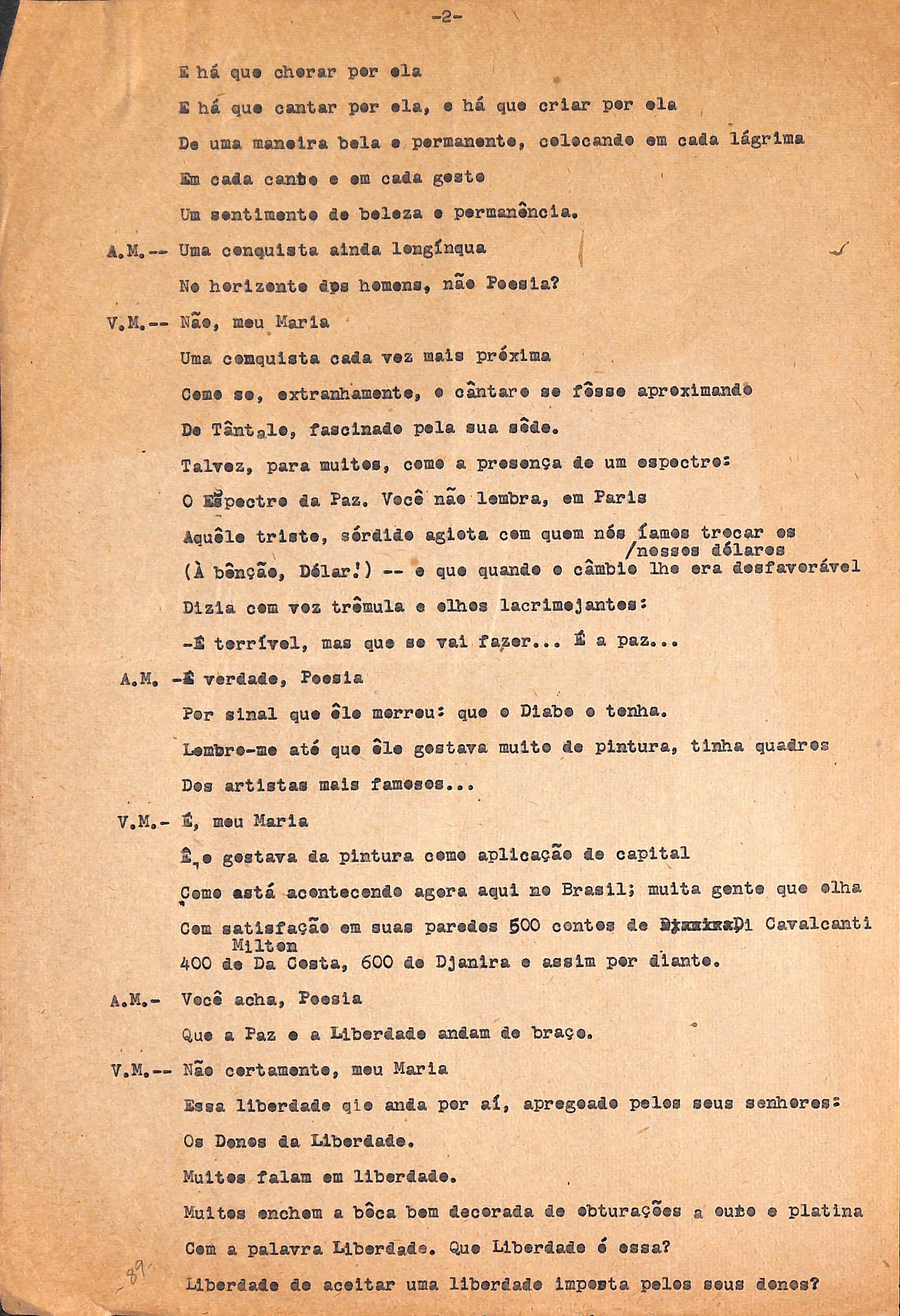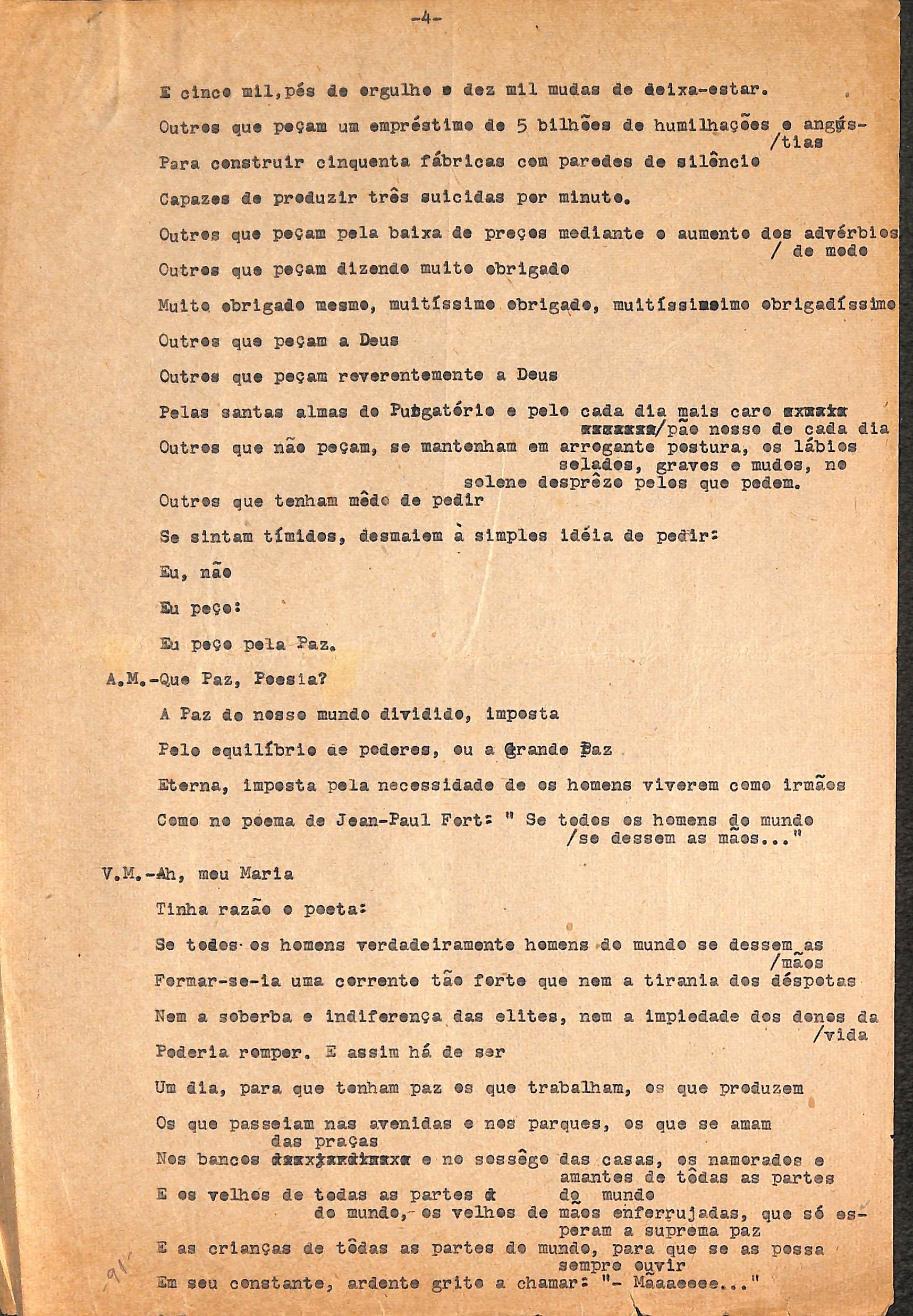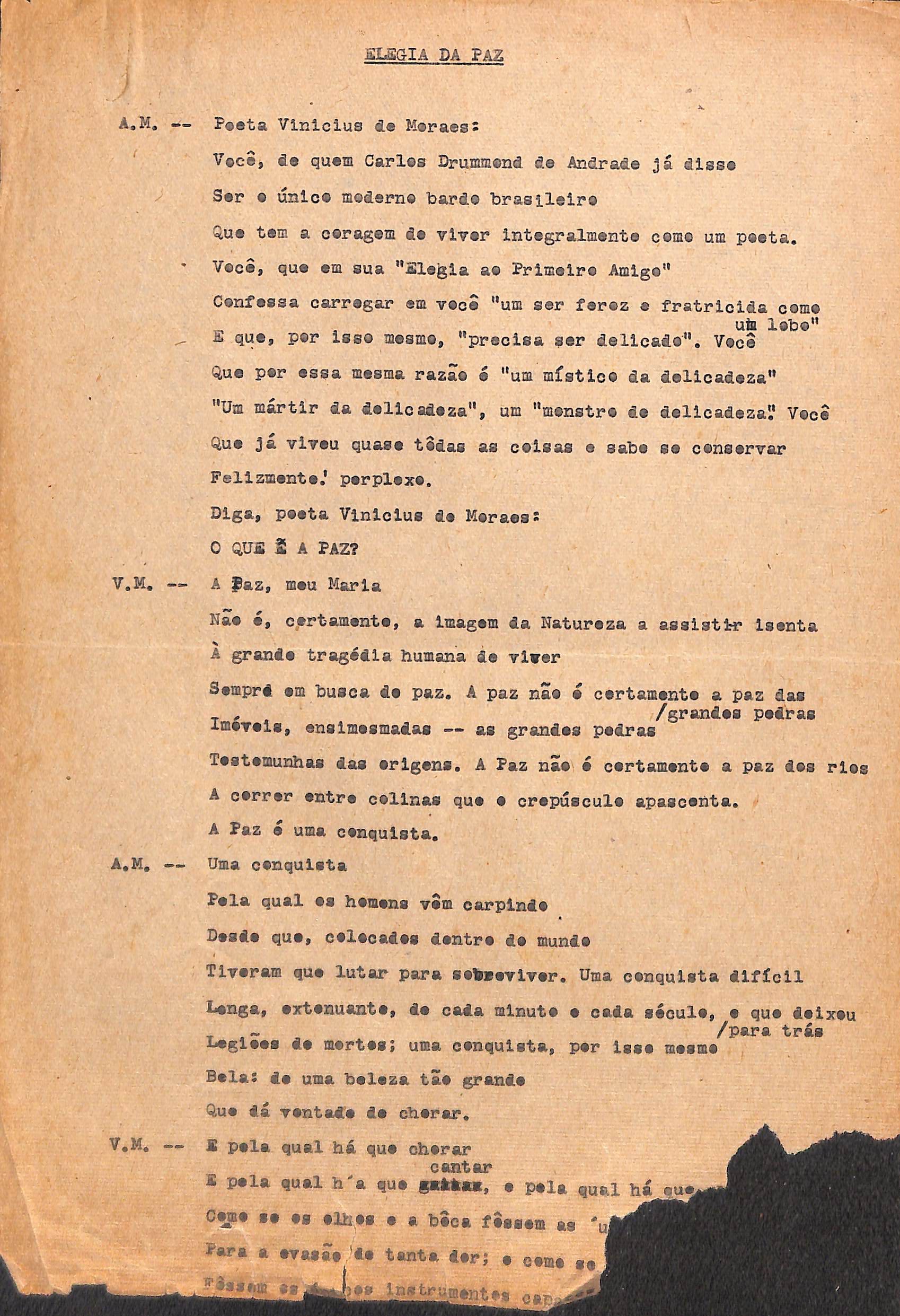 Entrevista. Rascunho. Entrevista dada por VM ao seu amigo, Antônio Maria, a respeito da paz.