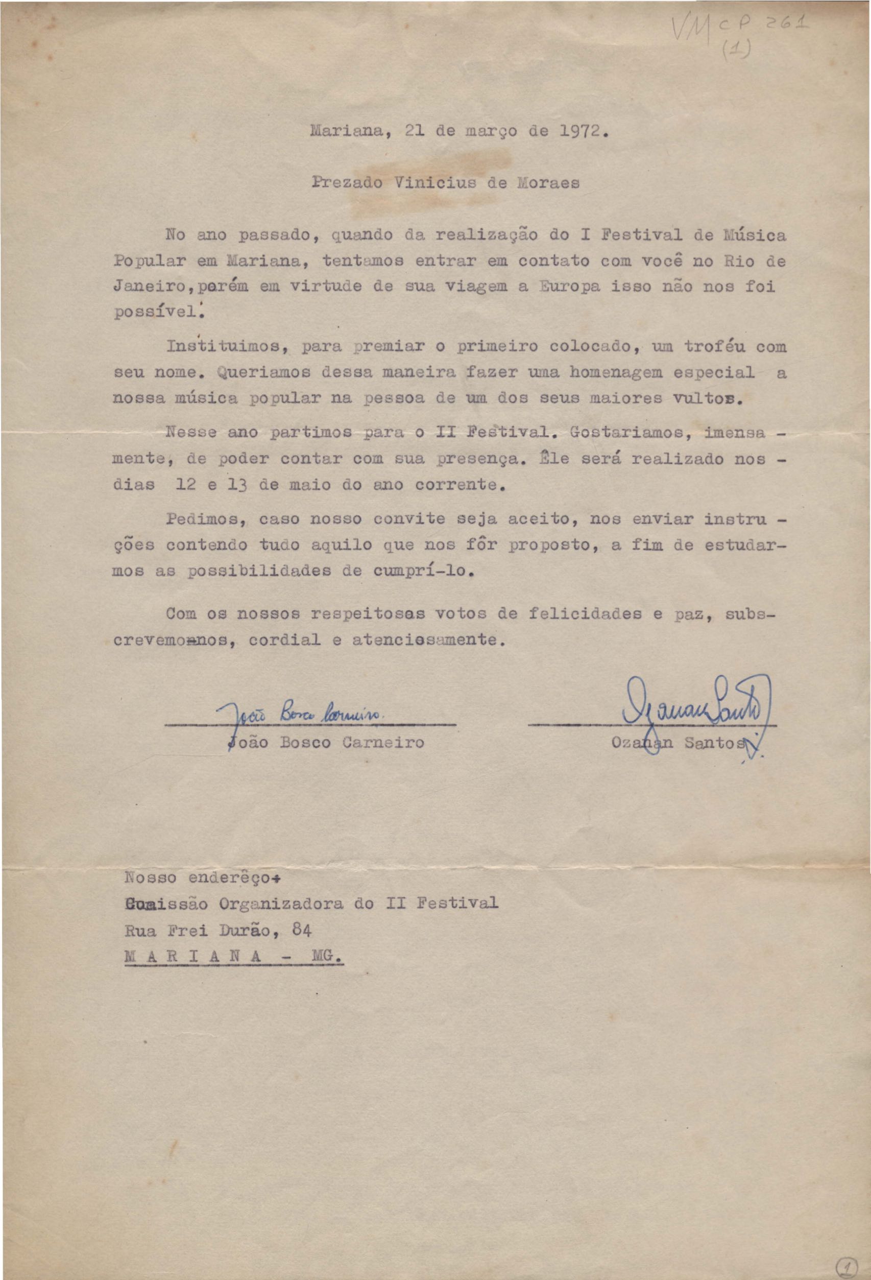 Comunicação sobre o I Festival de Música Popular de Mariana e sobre a instituição do troféu VM por ocasião do II Festival.