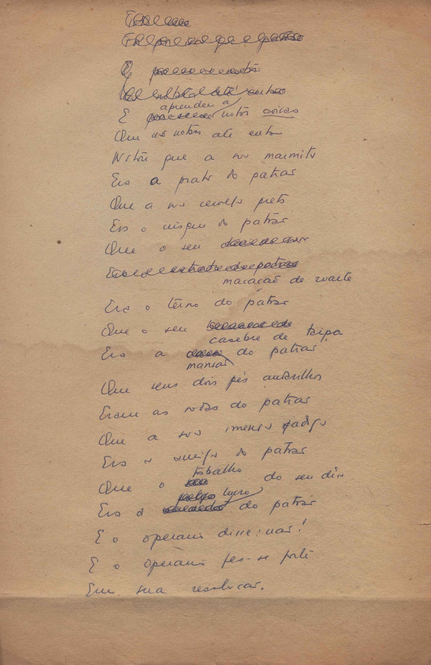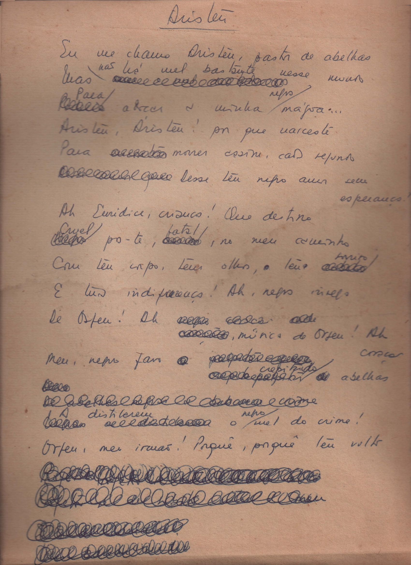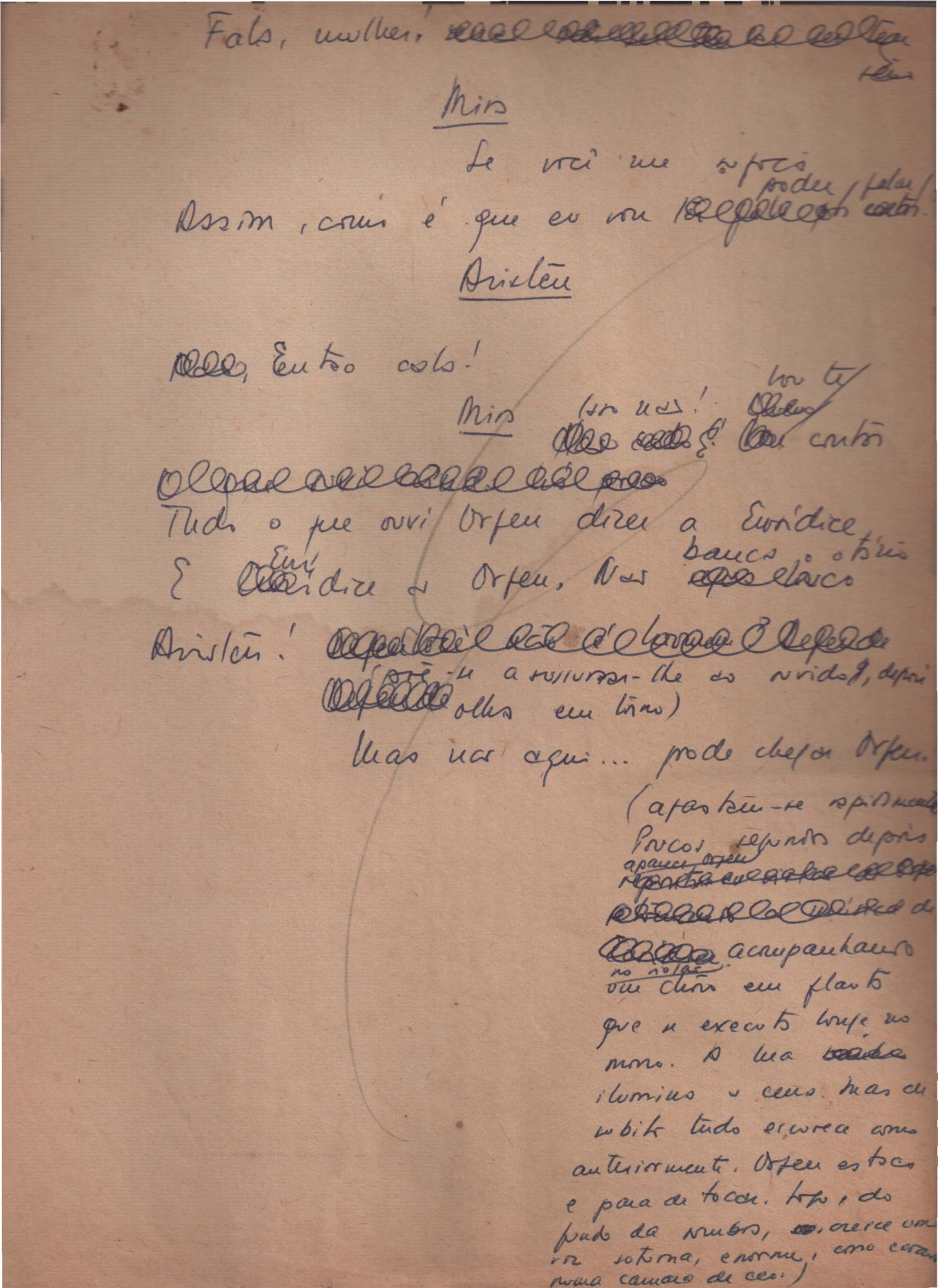 Roteiro de peça teatral. Rascunho do primeiro e terceiro atos. Anexos: Cópia carbonada da versão do roteiro da peça em inglês, sem indicação de tradutor.