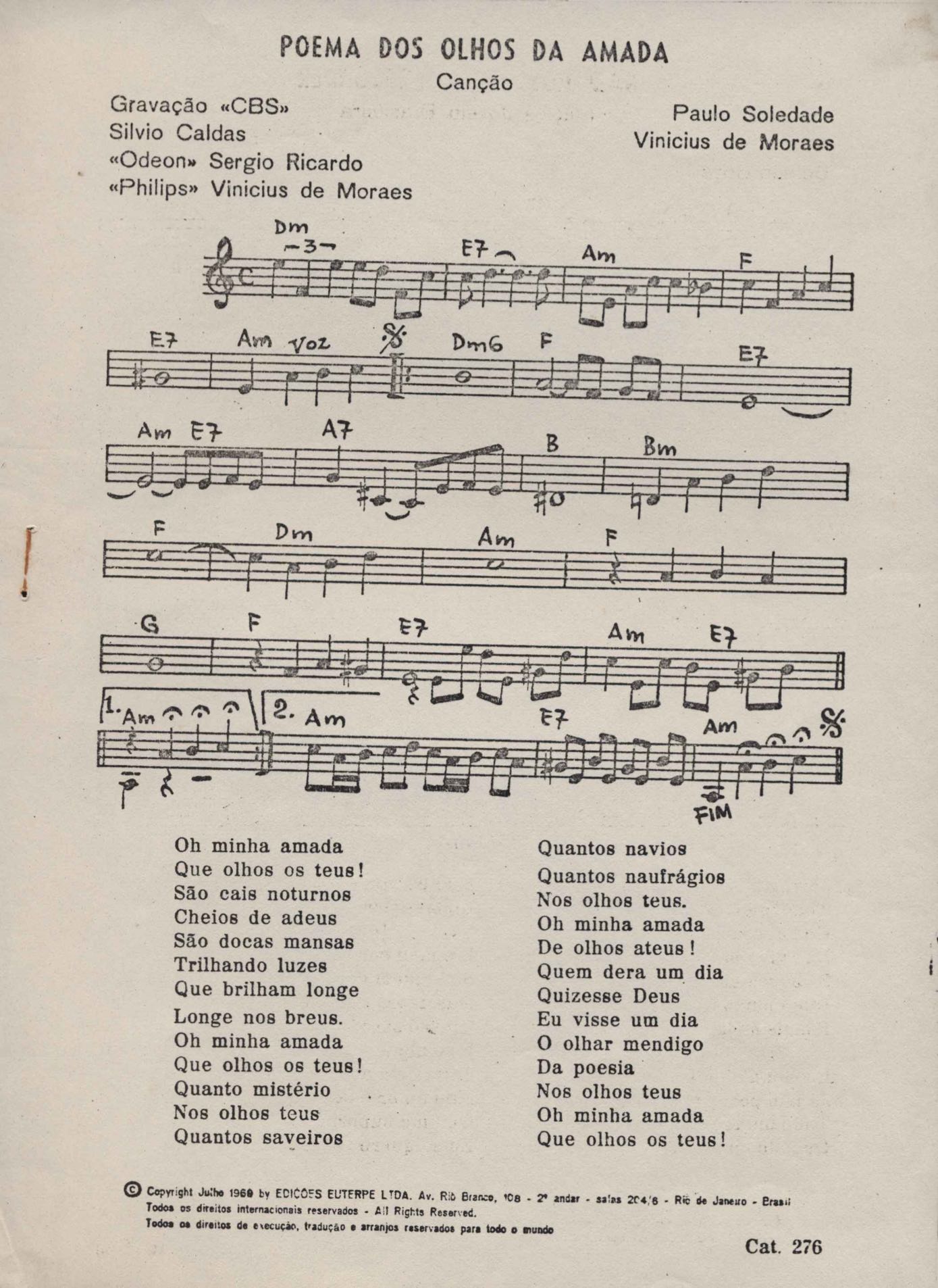 Partitura e letra da música "Poema dos olhos da amada", VM. Músicas em parceria com Paulo Soledade. Cópia carbonada.