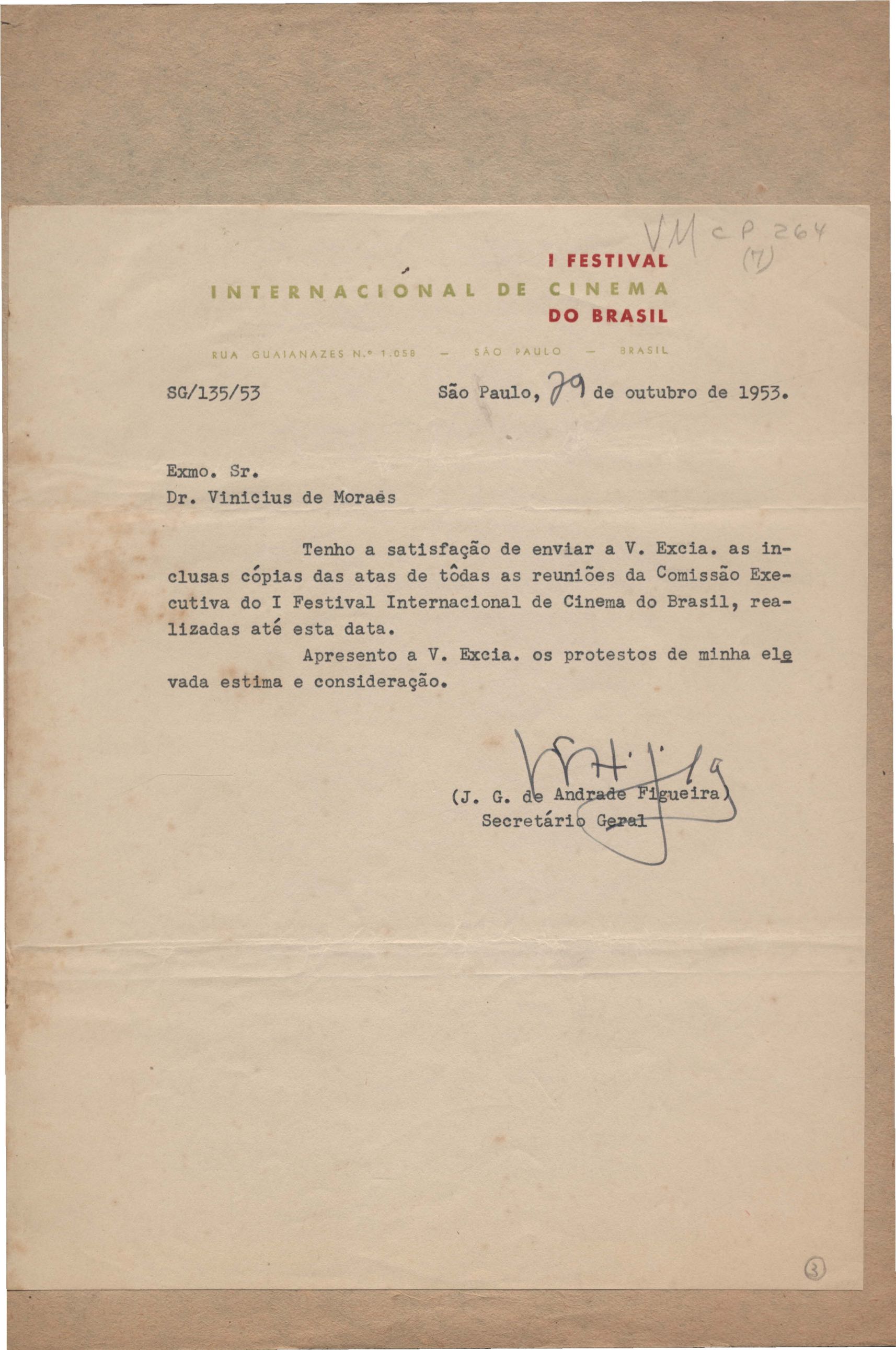Remessa do regulamento e das atas das reuniões da comissão executiva. Comentários sobre o festival. Anexo: Telegramas (2) de Eric Von Stroheim a Paul Kohner e ao Museum of Modern Art of New York.