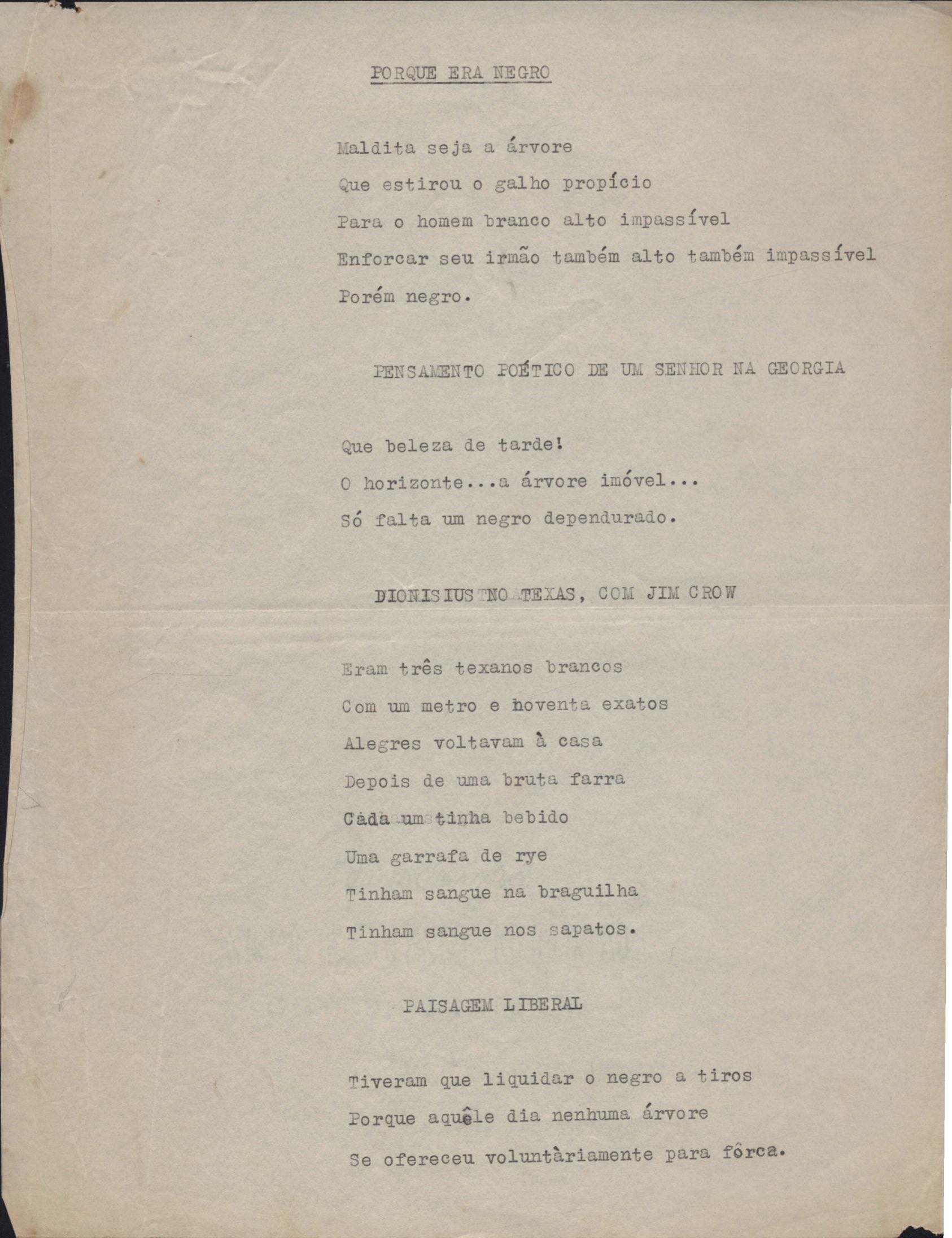 Poema. Há, no dossiê, vários rascunhos e poemas esparsos e inéditos. Alguns poemas do dossiê são encontrados também na primeira leva de documentos doados, e que faz parte do primeiro inventário. Na mesma página do poema "Quisera tanto" há o poema "Namorada". Há nota nos poemas: "Cada vez que eu penso nela", "O dia de Oxalá", "Menina, não banha nua" e "A morte sem pedágio".