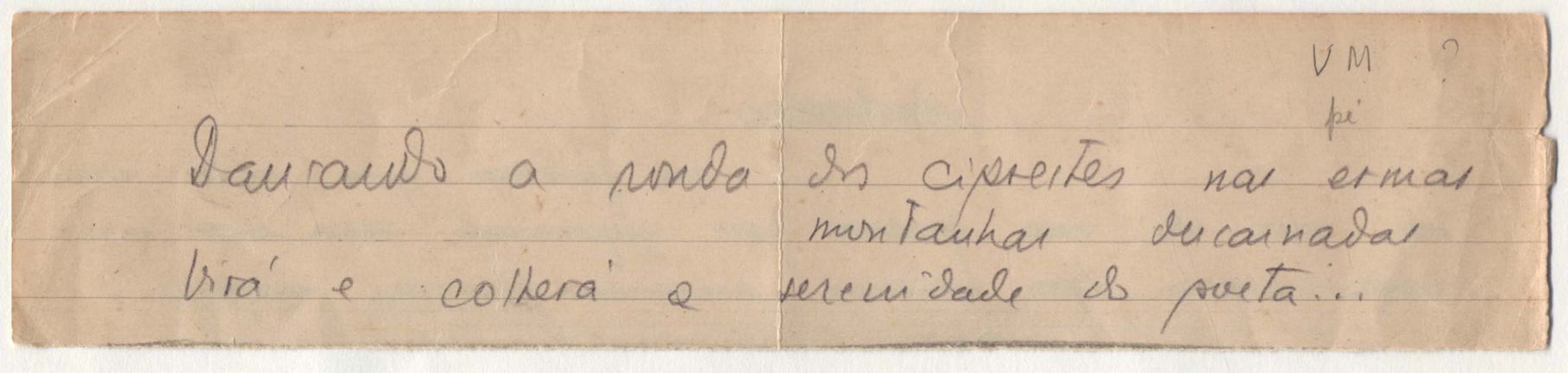 Poema. Há, no dossiê, vários rascunhos e poemas esparsos e inéditos. Alguns poemas do dossiê são encontrados também na primeira leva de documentos doados, e que faz parte do primeiro inventário. Na mesma página do poema "Quisera tanto" há o poema "Namorada". Há nota nos poemas: "Cada vez que eu penso nela", "O dia de Oxalá", "Menina, não banha nua" e "A morte sem pedágio".