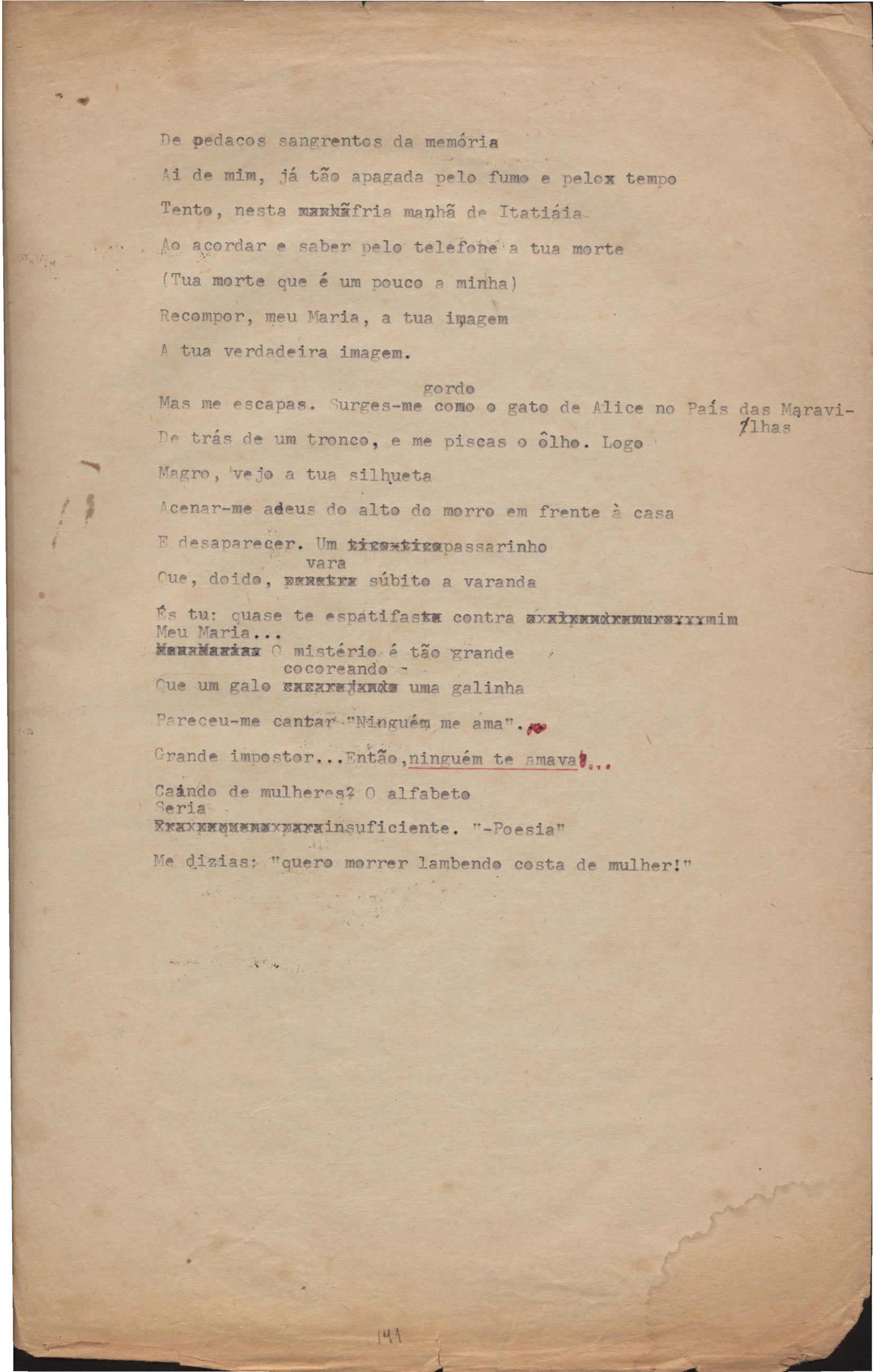 Poema. Há, no dossiê, vários rascunhos e poemas esparsos e inéditos. Alguns poemas do dossiê são encontrados também na primeira leva de documentos doados, e que faz parte do primeiro inventário. Na mesma página do poema "Quisera tanto" há o poema "Namorada". Há nota nos poemas: "Cada vez que eu penso nela", "O dia de Oxalá", "Menina, não banha nua" e "A morte sem pedágio".